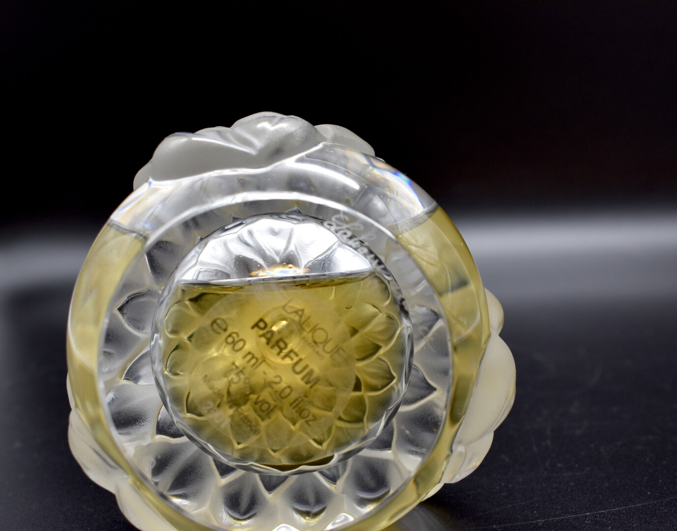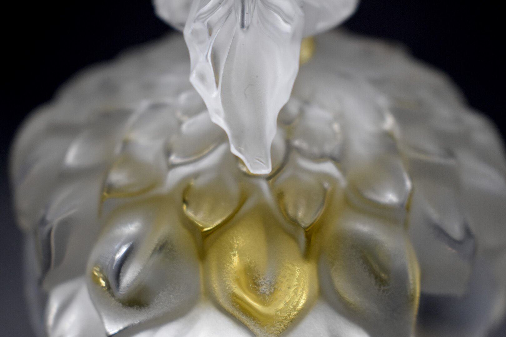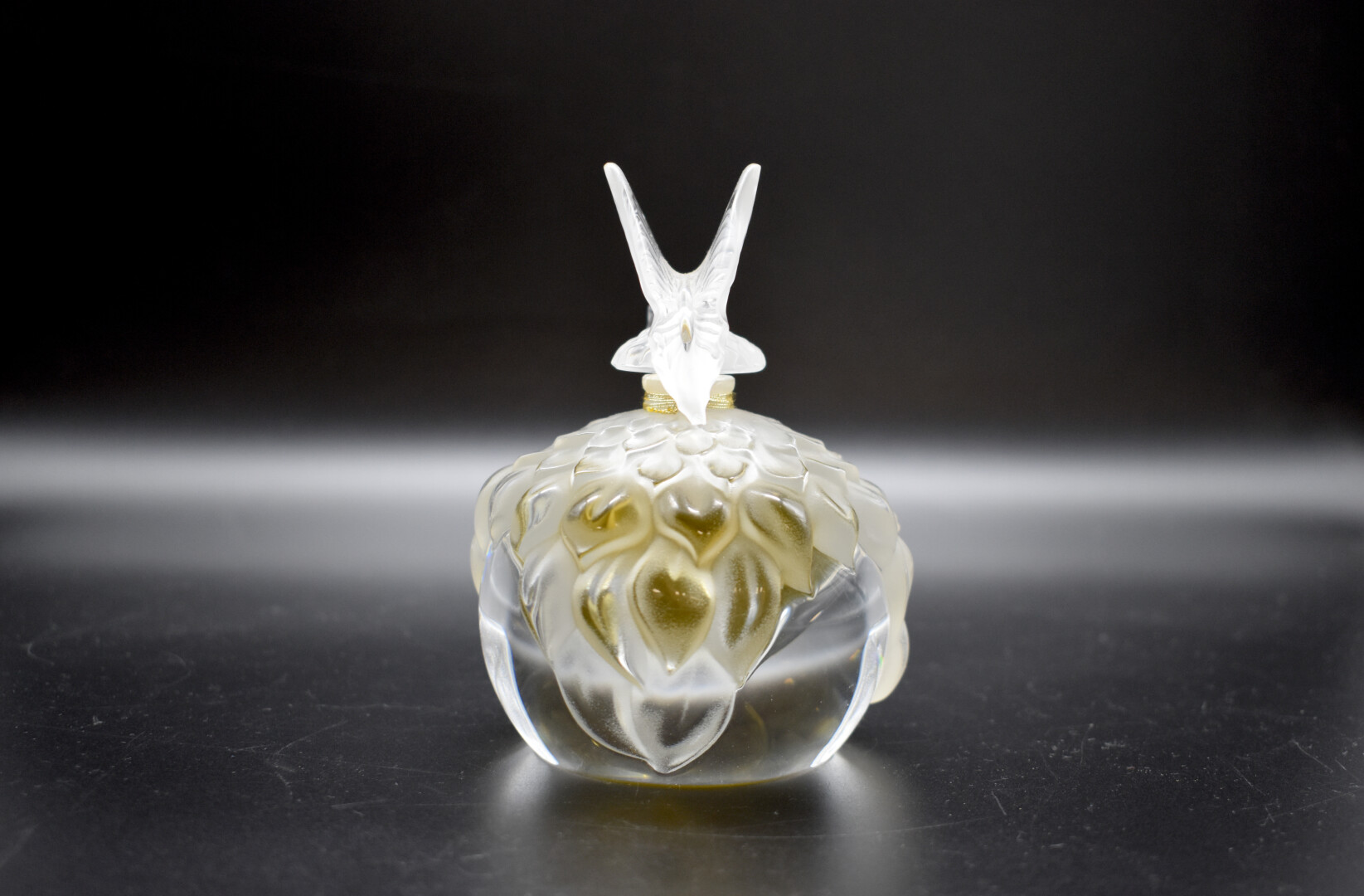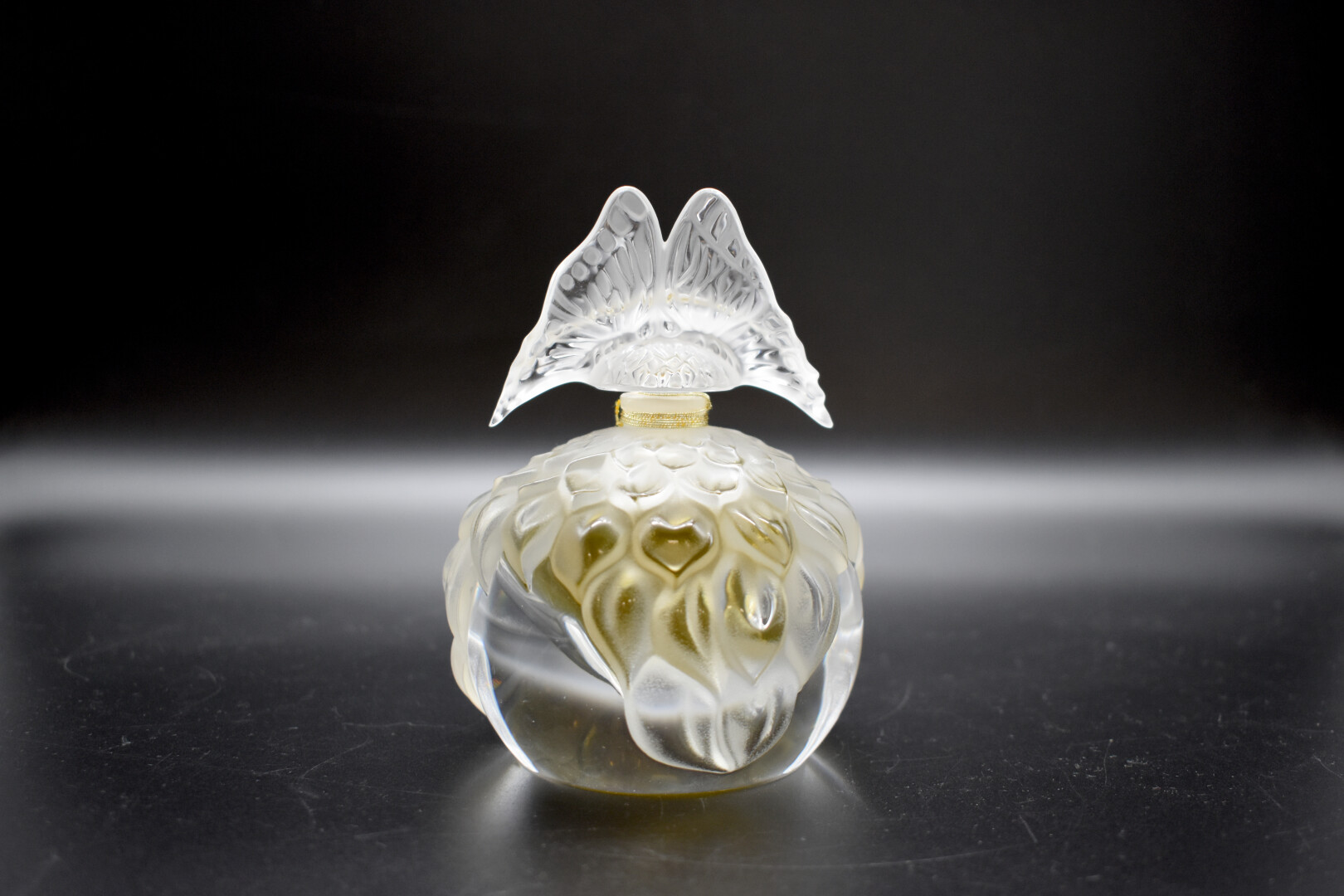 LALIQUE PARFUM. Flacon en cristal modèle « Butterfly » (un petit éclat sous l’aile d’un papillon du bouchon) et son contenu, factice ? Numéroté 400. Haut. : 12,5 cm.
