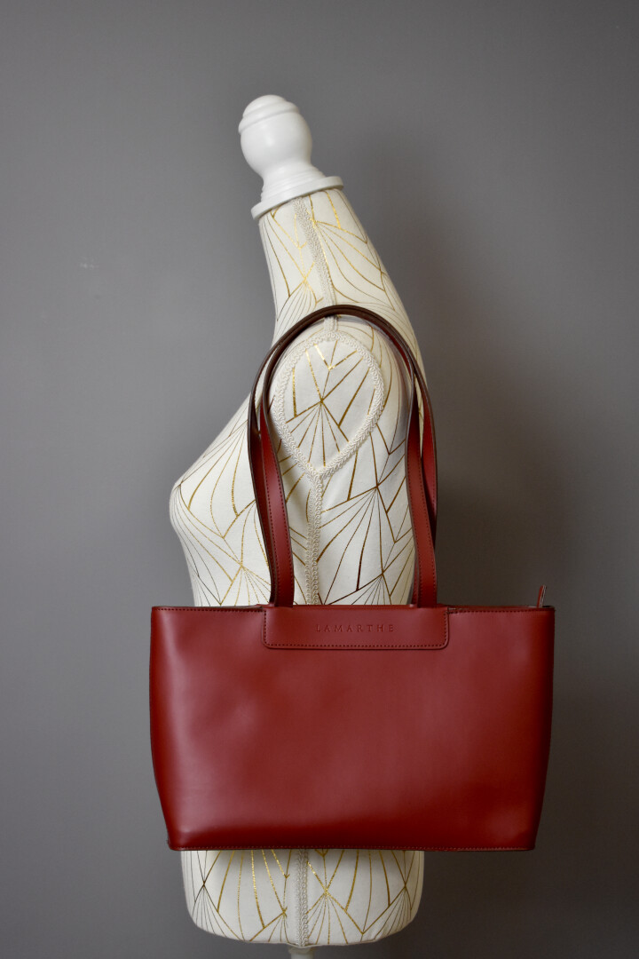 LAMARTHE. Sac à main en cabas cuir rouge surpiqué. Haut. : 20 cm – Larg. : 30 cm.