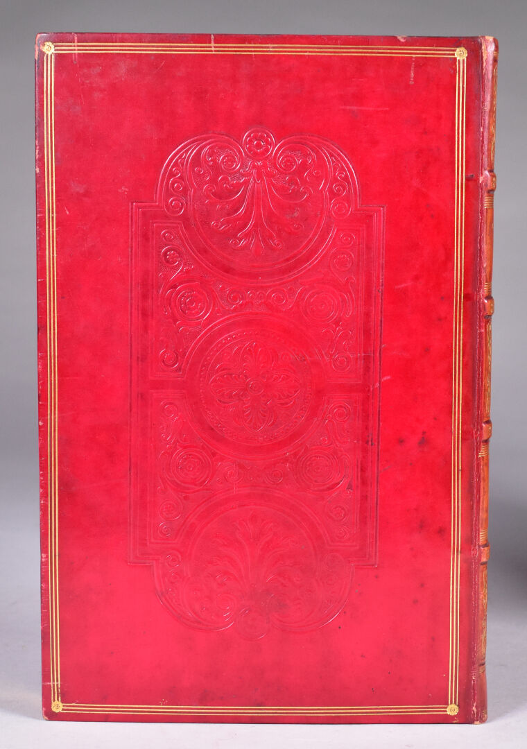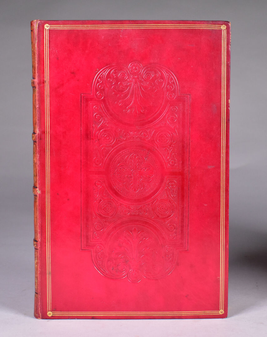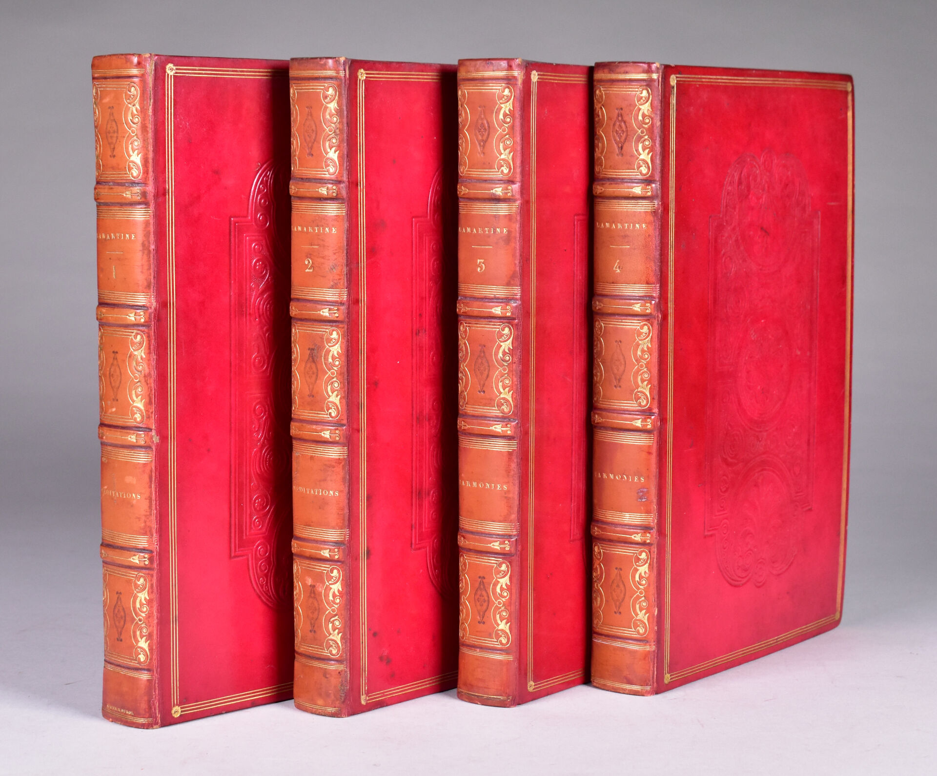 LAMARTINE (A. de). OEUVRES. Paris, Gosselin, Furne, 1832. Quatre volumes in-8 veau rouge, plats ornés d’une grande plaque à froid, dos à nerfs orné, titre doré, dentelle intérieure, tranches dorées (Simier, R. du Roi). Rousseurs éparses, dos éclaircis. ÉDITION COLLECTIVE contenant Les Premières et Nouvelles Méditations poétiques, ainsi que les Harmonies poétiques et religieuses. Un portrait, un fac-similé d’autographe et 3 FRONTISPICES gravés sur acier. BELLE RELIURE en veau décoré à froid de Simier. ¶ Clouzot, 181 : « Éditions des plus élégantes. Le portrait et les 3 frontispices manquent souvent. ».