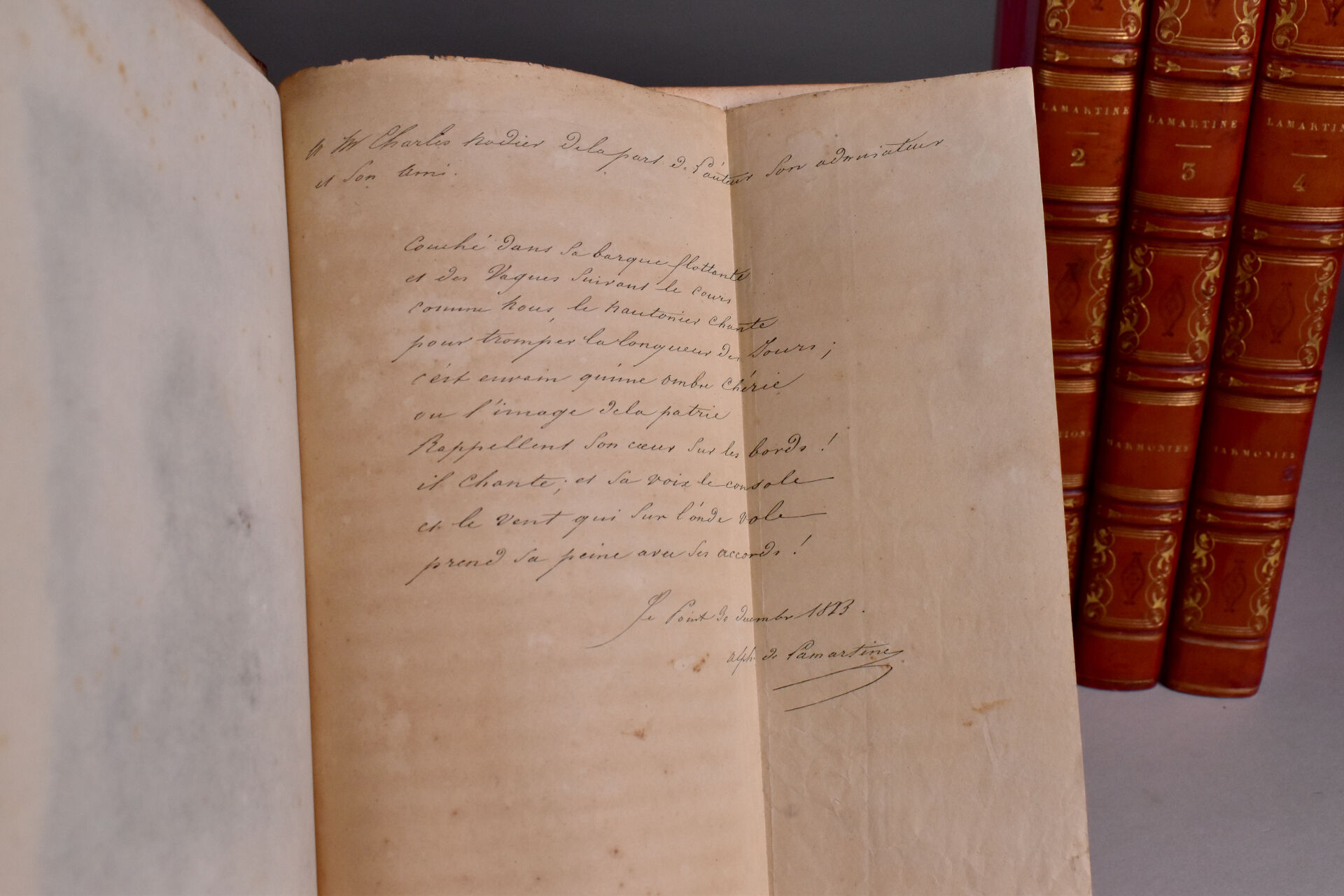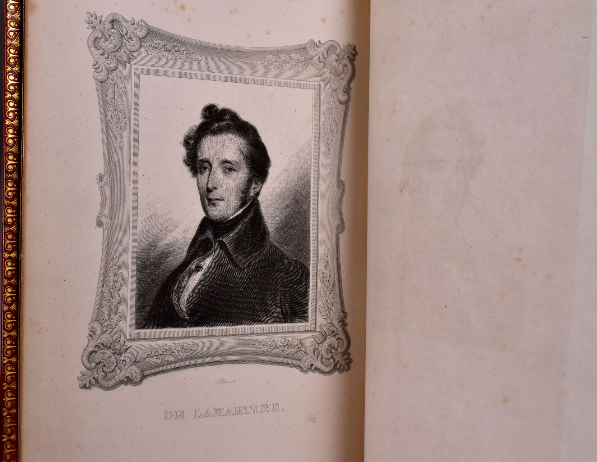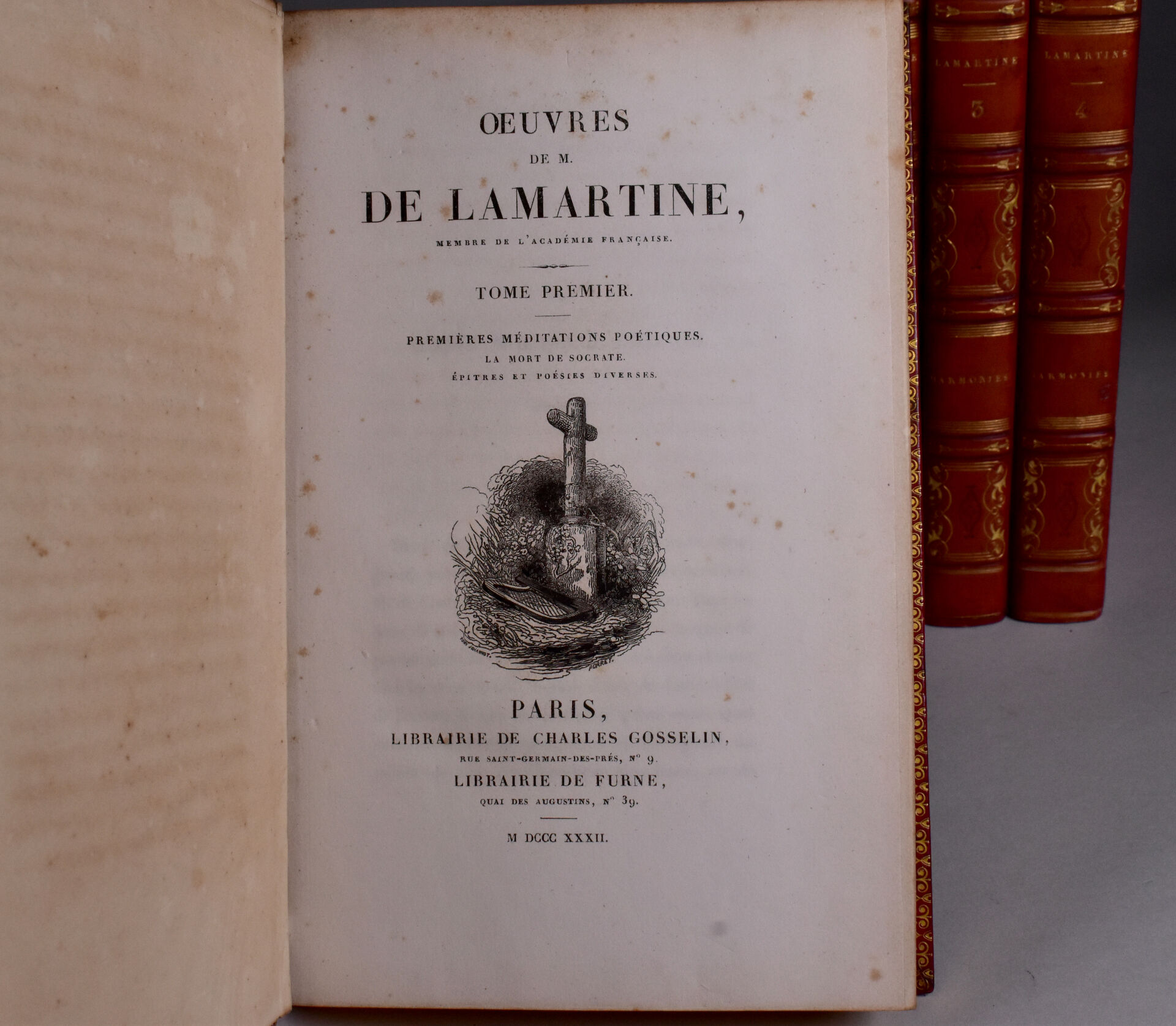 LAMARTINE (A. de). OEUVRES. Paris, Gosselin, Furne, 1832. Quatre volumes in-8 veau rouge, plats ornés d’une grande plaque à froid, dos à nerfs orné, titre doré, dentelle intérieure, tranches dorées (Simier, R. du Roi). Rousseurs éparses, dos éclaircis. ÉDITION COLLECTIVE contenant Les Premières et Nouvelles Méditations poétiques, ainsi que les Harmonies poétiques et religieuses. Un portrait, un fac-similé d’autographe et 3 FRONTISPICES gravés sur acier. BELLE RELIURE en veau décoré à froid de Simier. ¶ Clouzot, 181 : « Éditions des plus élégantes. Le portrait et les 3 frontispices manquent souvent. ».