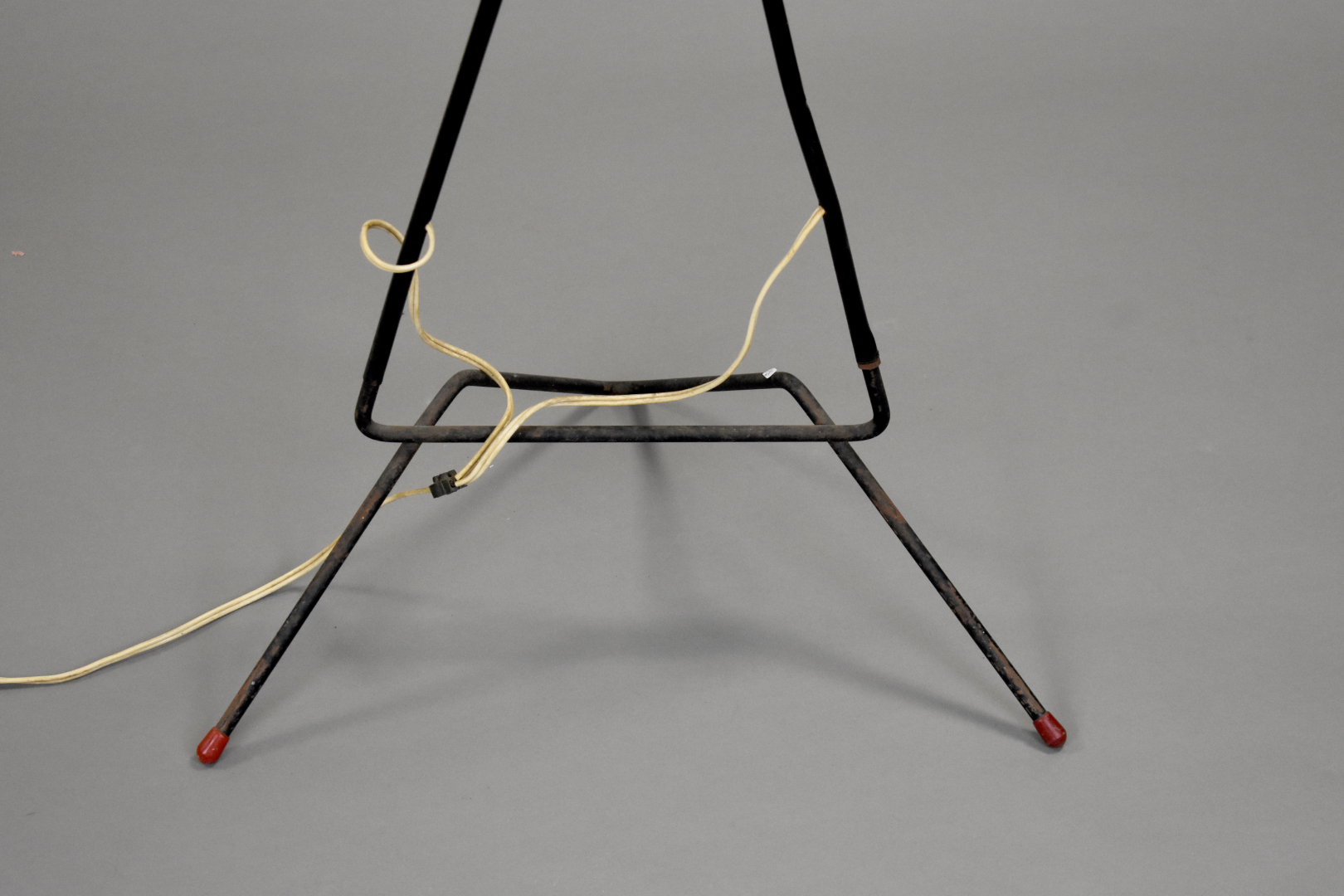 Lampadaire à deux bras de lumière en métal laqué noir. Les abas-jours coniques. Vers 1950. Haut. : 175 cm.
