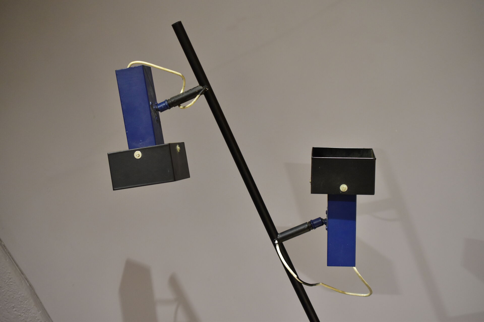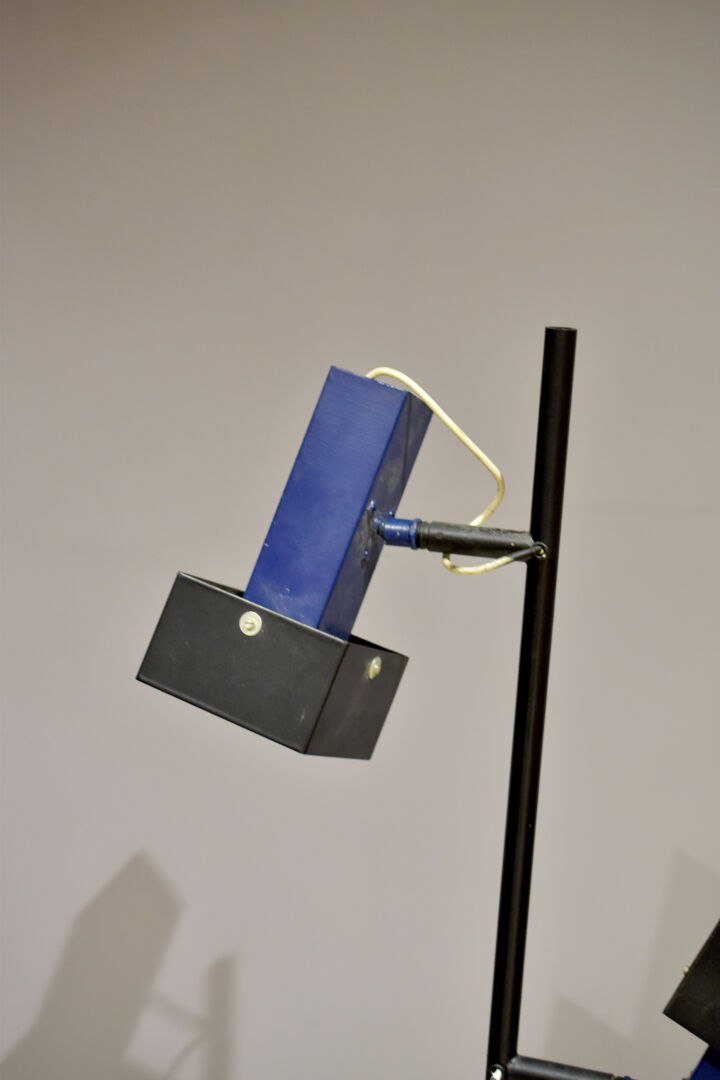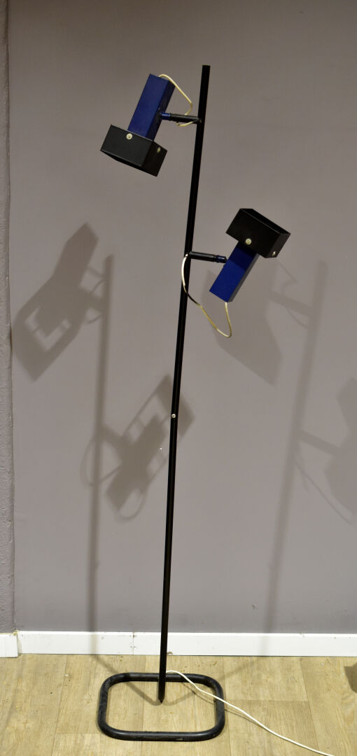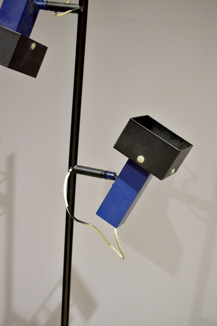 Lampadaire à deux lumières en métal relaqué noir et bleu à deux lumières pivotantes. Travail des années 1980. Haut. : 150 cm.
