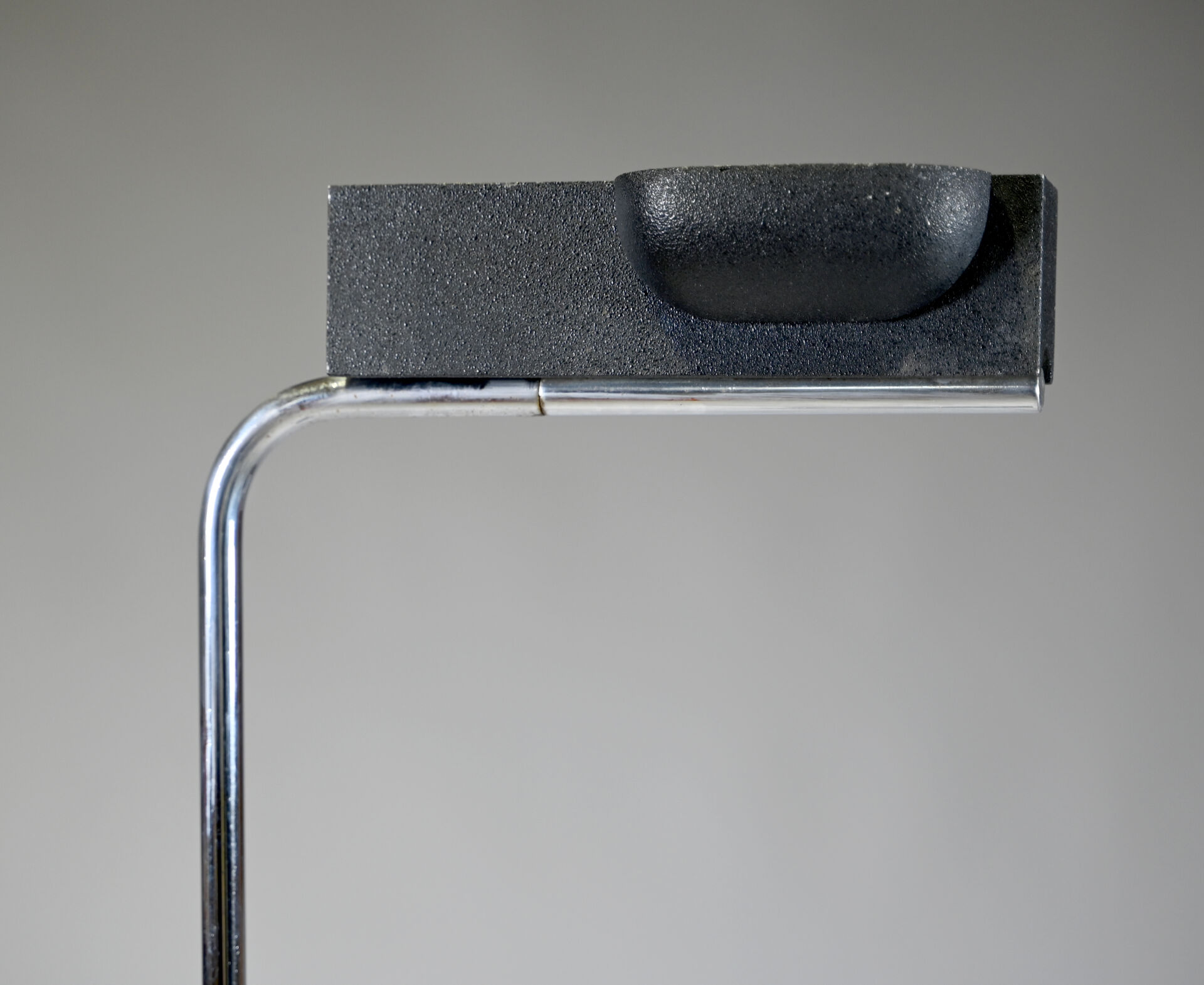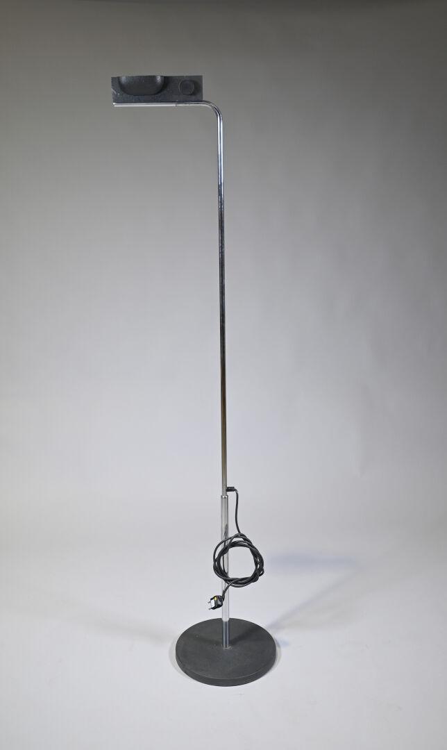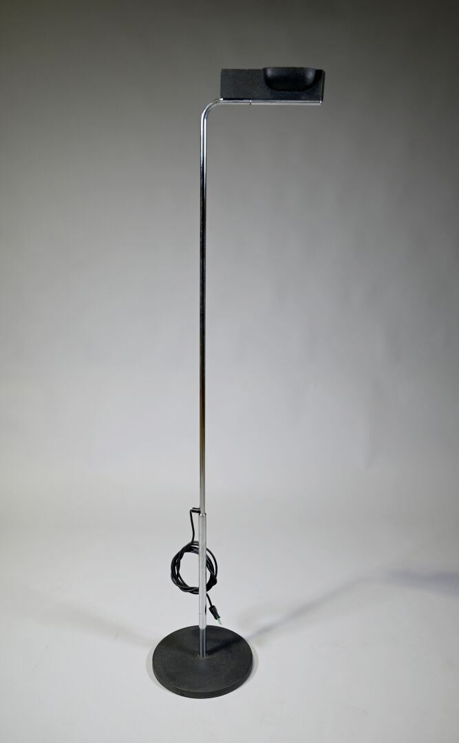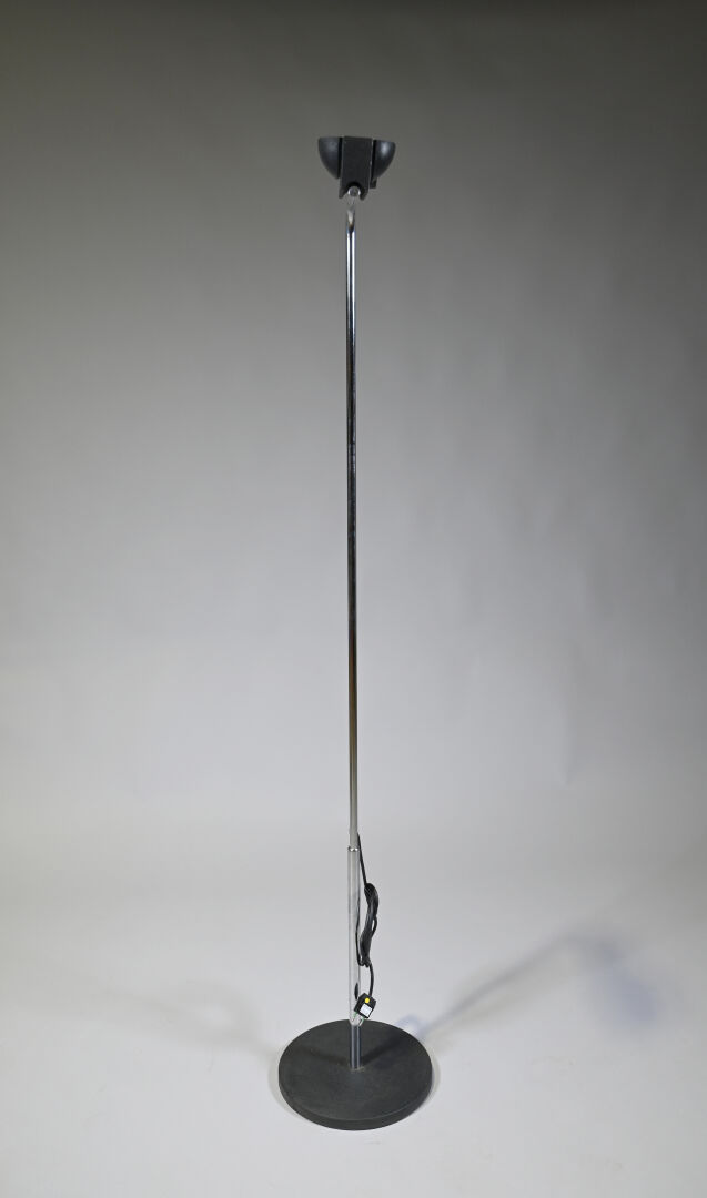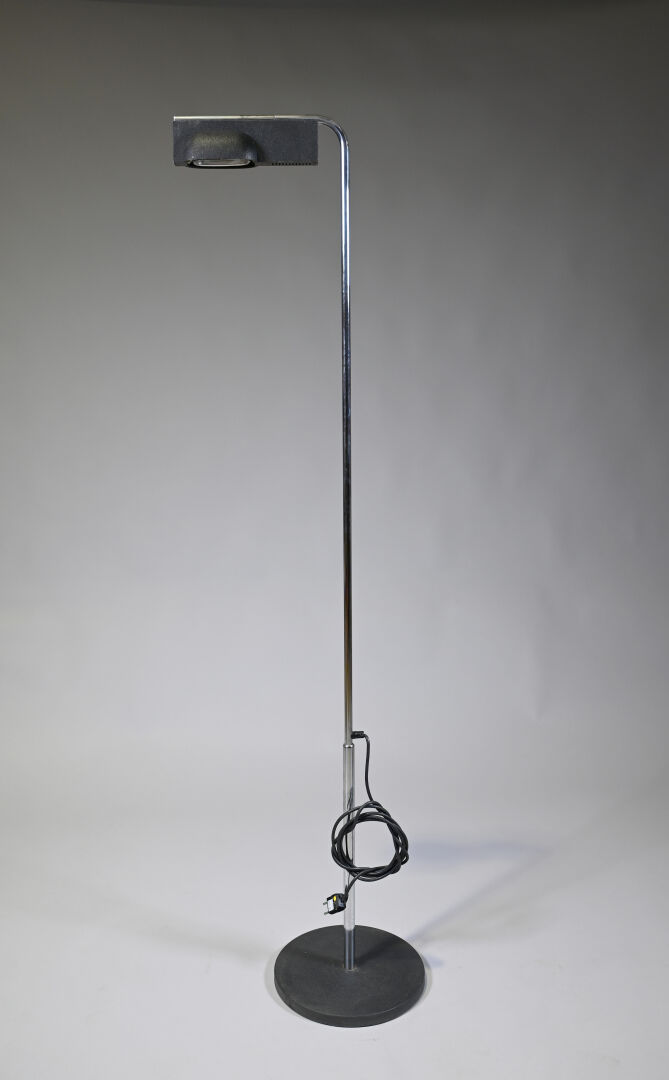 Lampadaire à fût tubulaire en métal chromé, diffuseur en métal laqué noir à variateur, hauteur ajustable (quelques usures). Vers 1980. Haut. : 156 cm (au plus bas) Haut. : 190 cm (au plus haut).