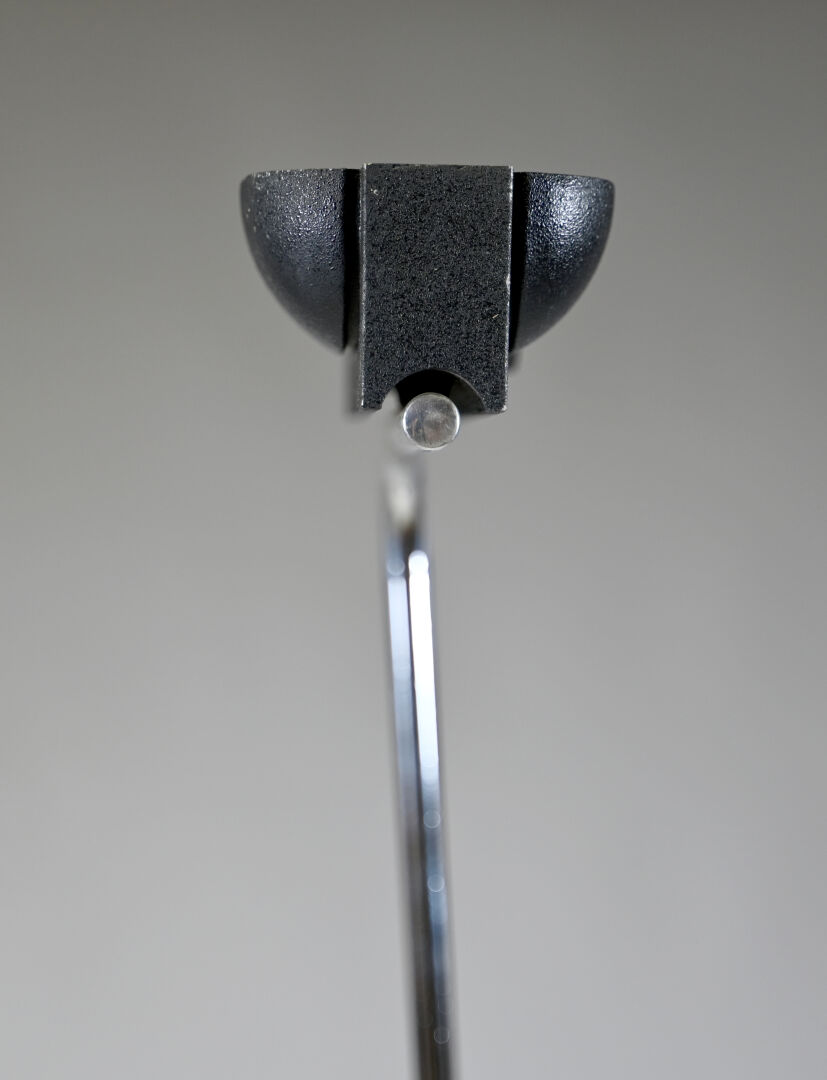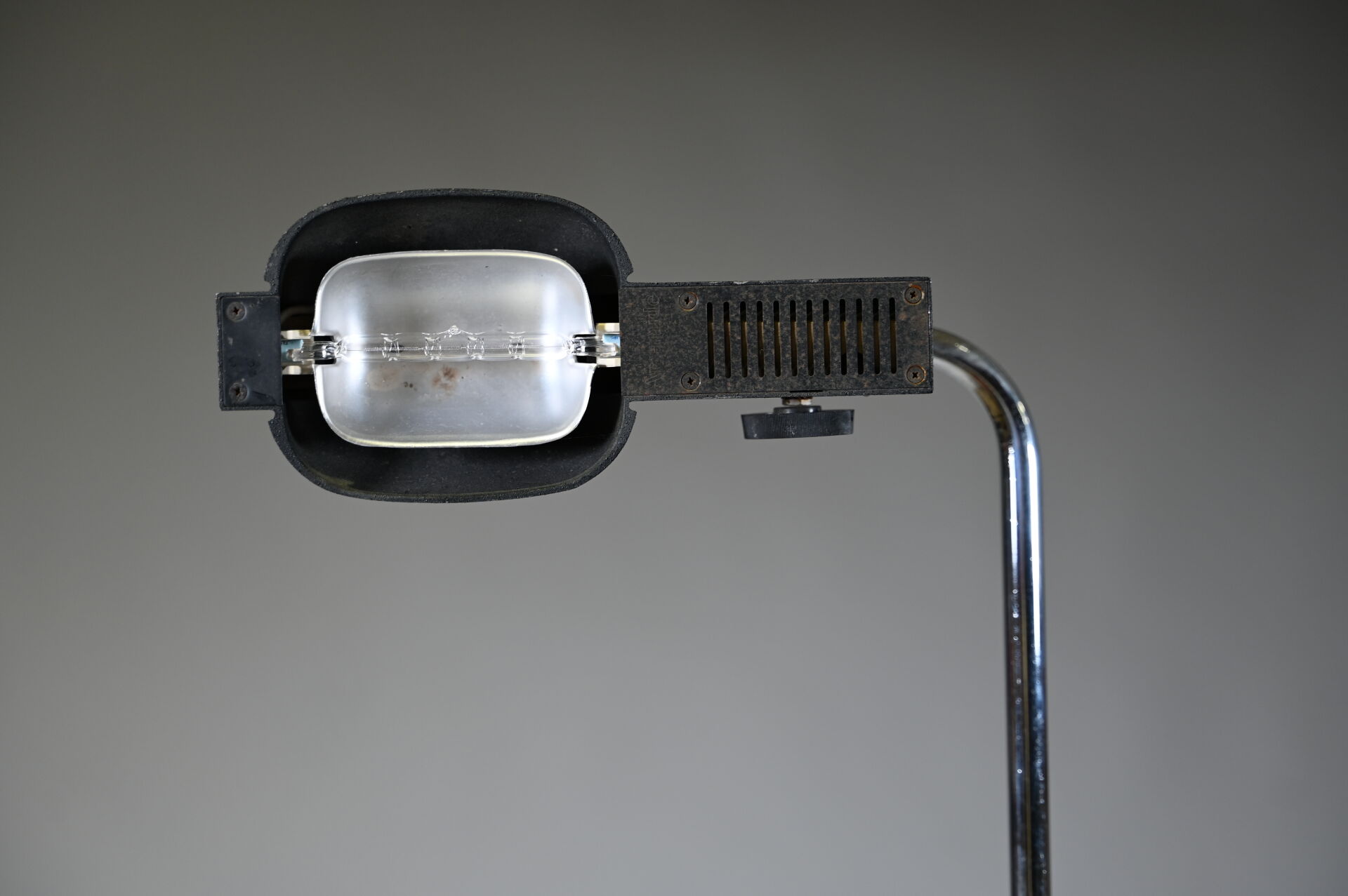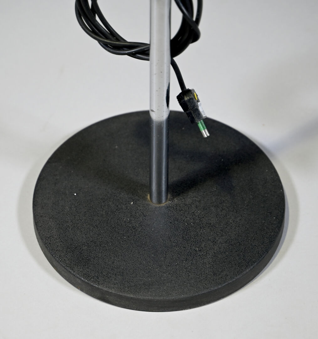 Lampadaire à fût tubulaire en métal chromé, diffuseur en métal laqué noir à variateur, hauteur ajustable (quelques usures). Vers 1980. Haut. : 156 cm (au plus bas) Haut. : 190 cm (au plus haut).