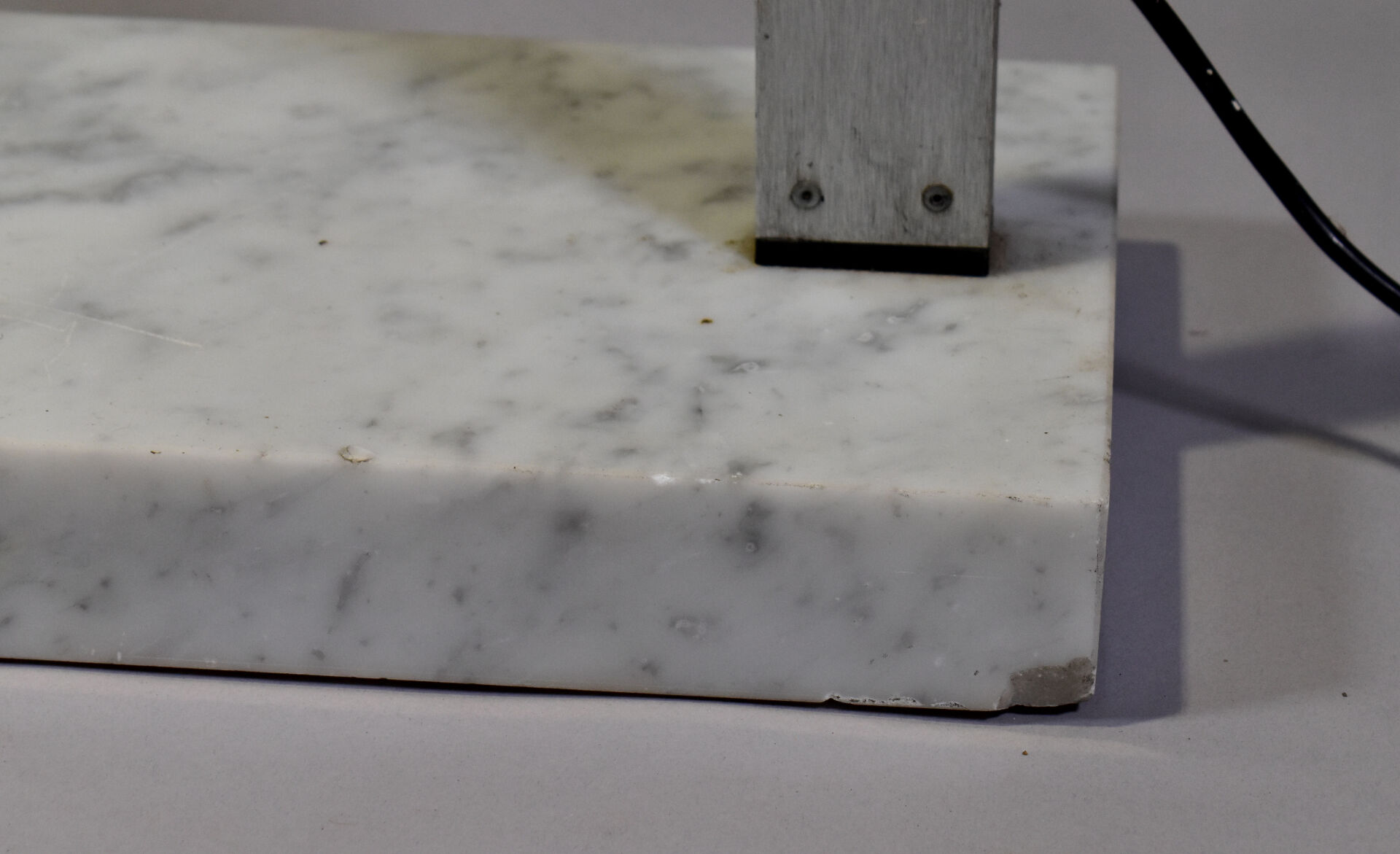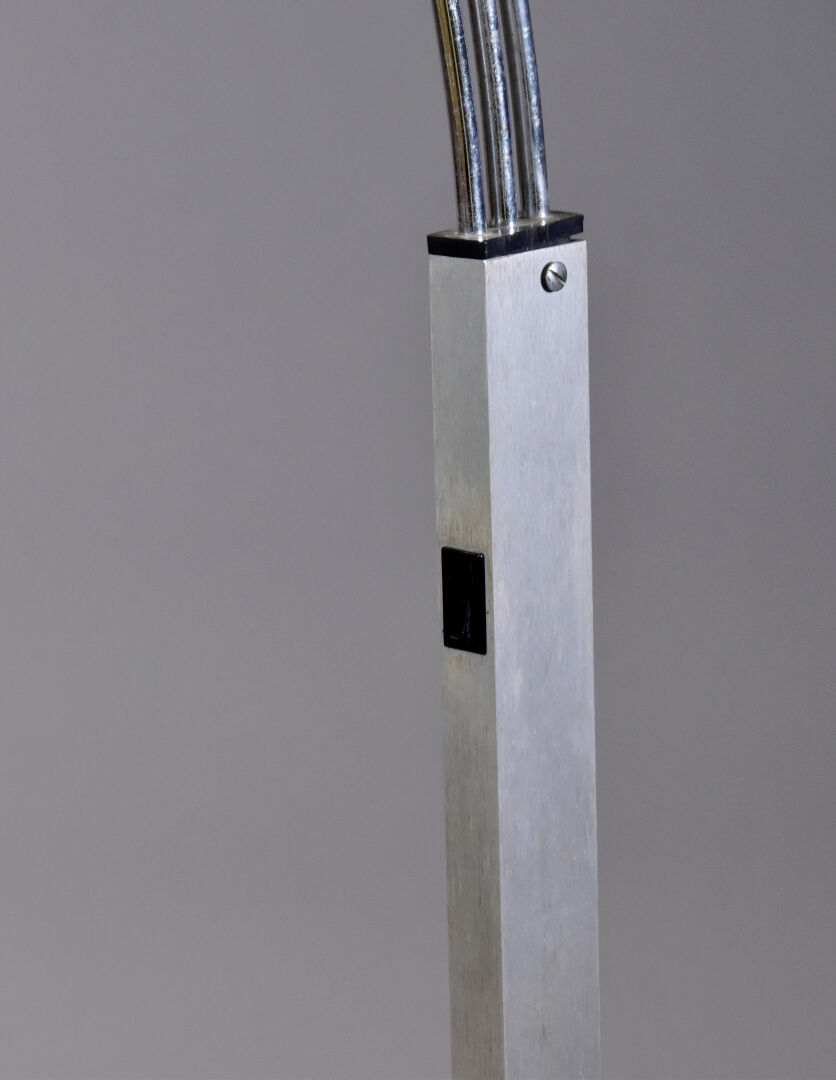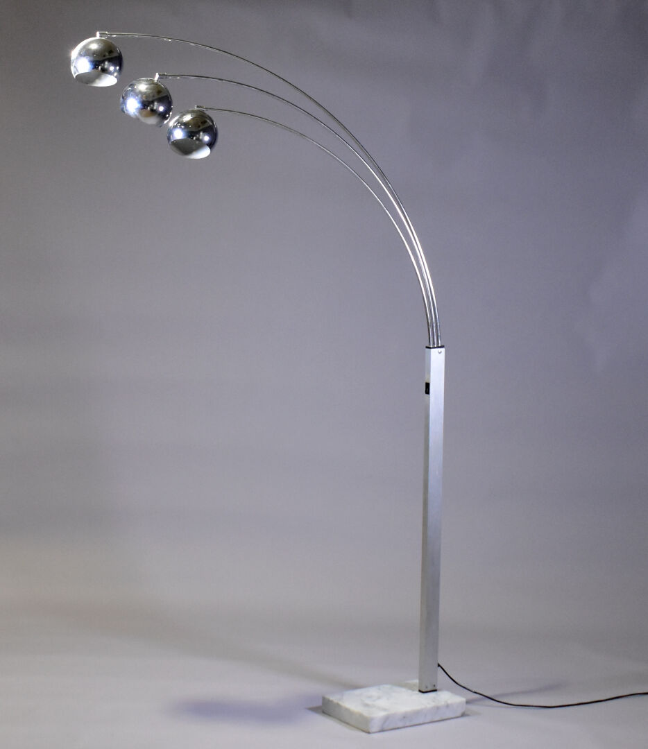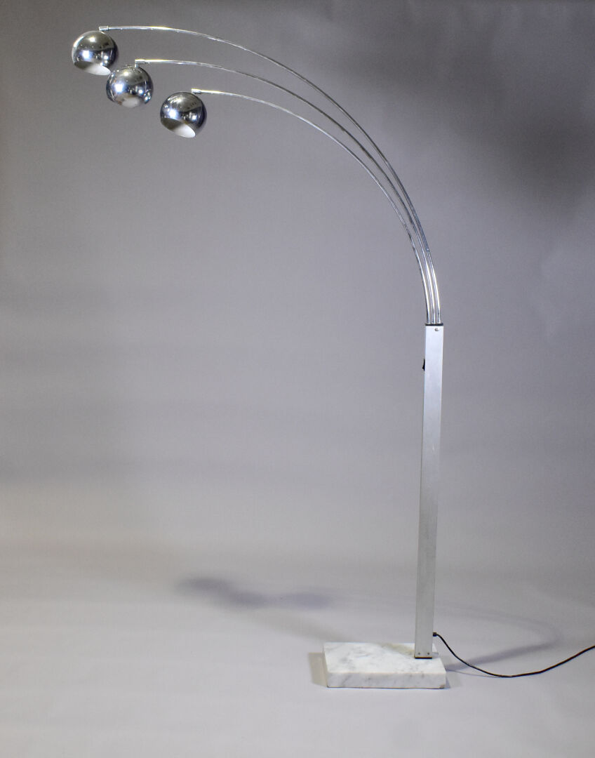 Lampadaire à trois bras de lumière en métal chromé. La base rectangulaire en marbre blanc veiné gris. Dans le goût de REGGIANI. Haut. : 189 cm.