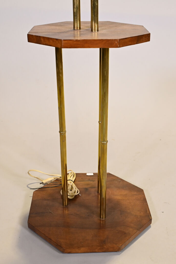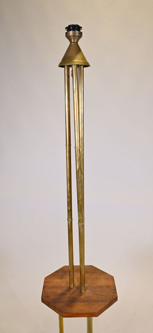Lampadaire à trois fût en laiton à l’imitation du bambou et double plateaux octogonaux en noyer. Haut. : 160 cm.
