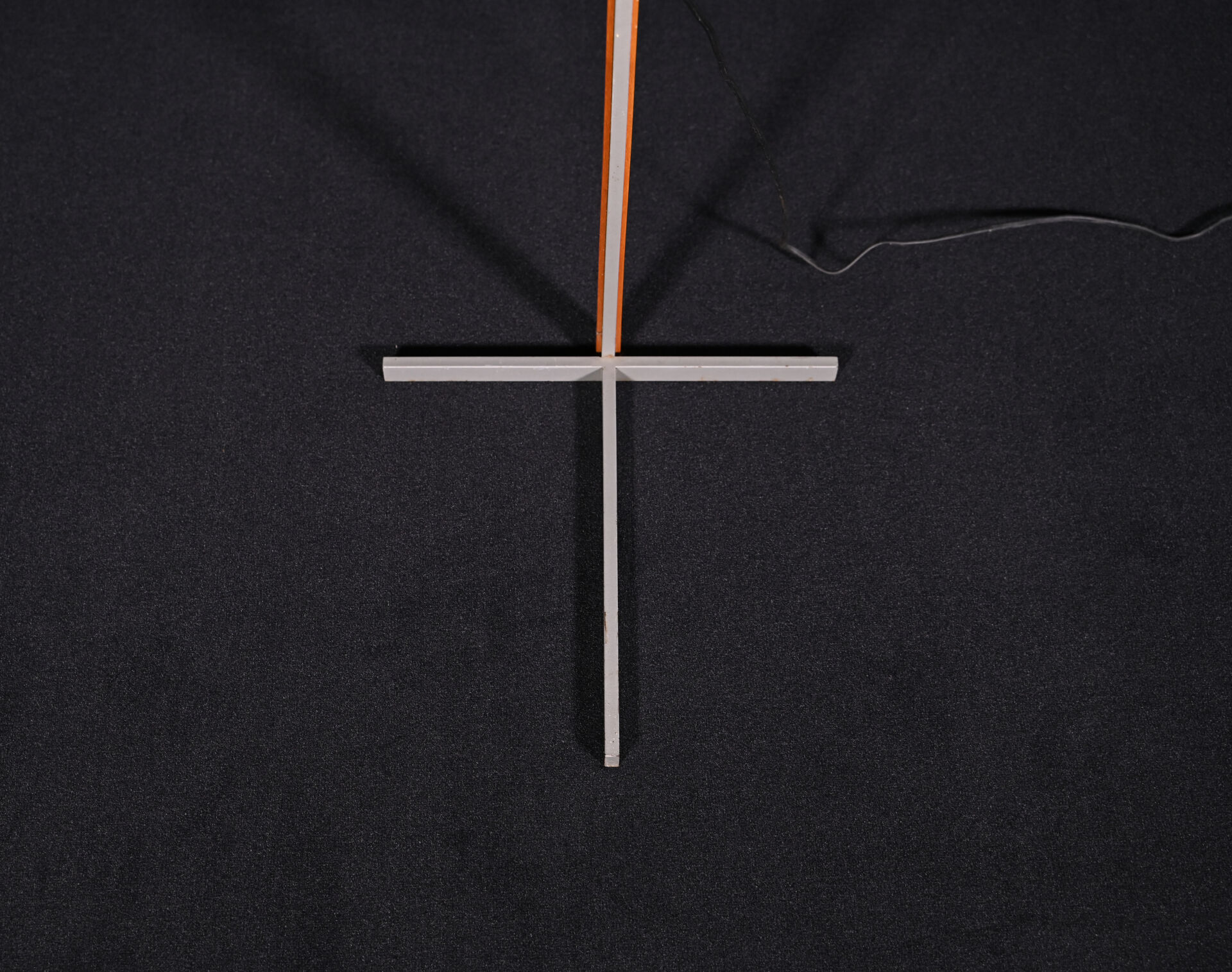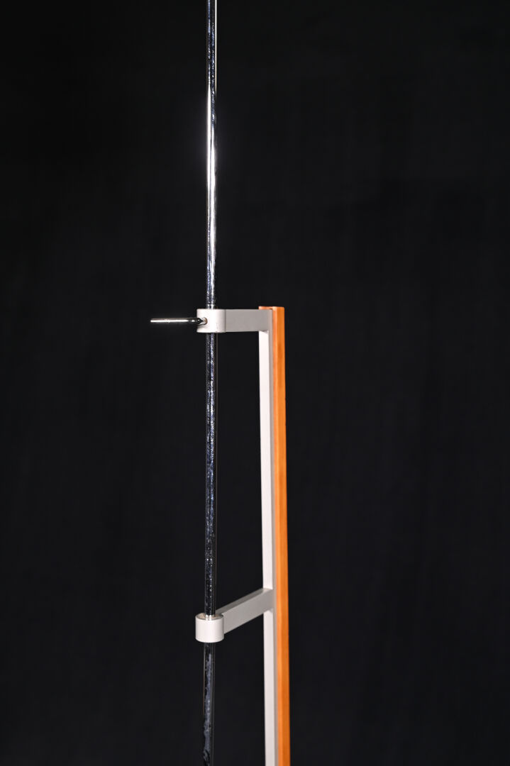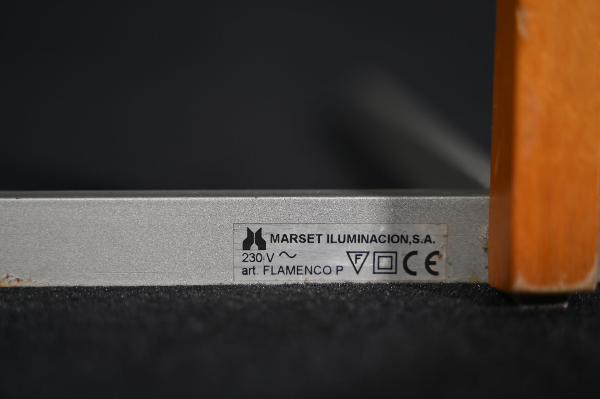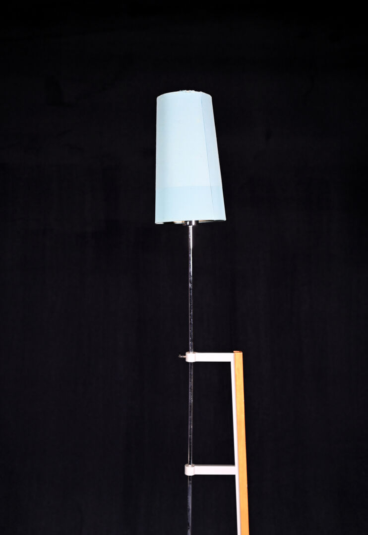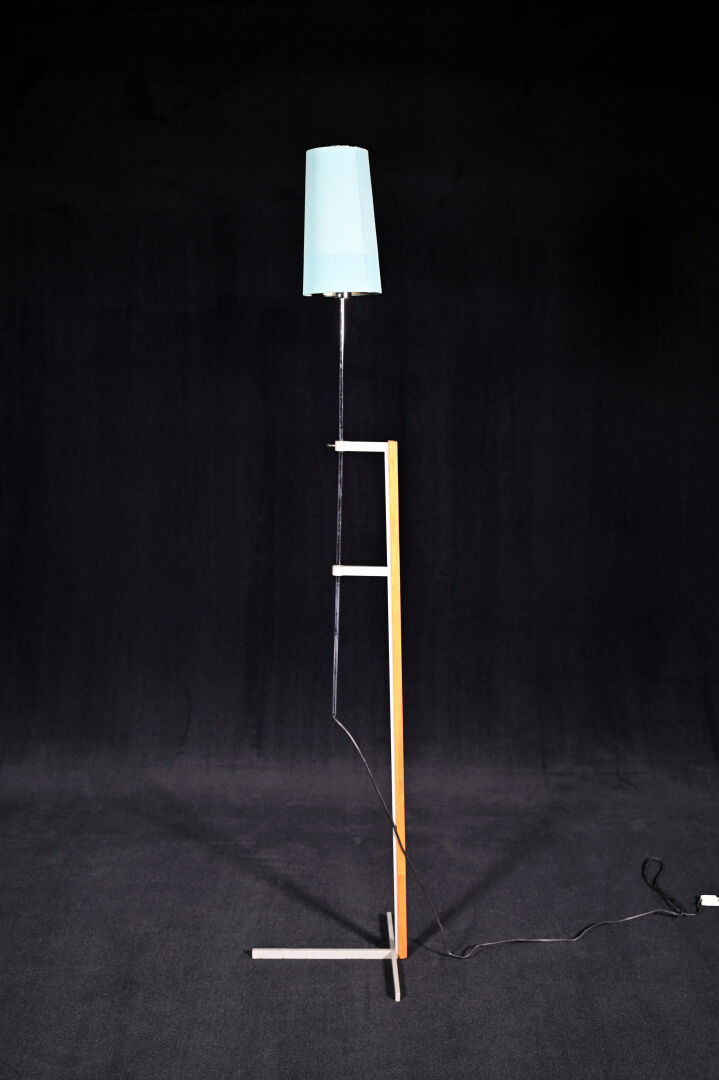 Lampadaire avec pied déporté en métal et bois, modèle « Flamenco ? ». Avec Abas-jour en toile bleue (usures). Vers 1980. Haut. : 158 cm ( sans abat-jour).