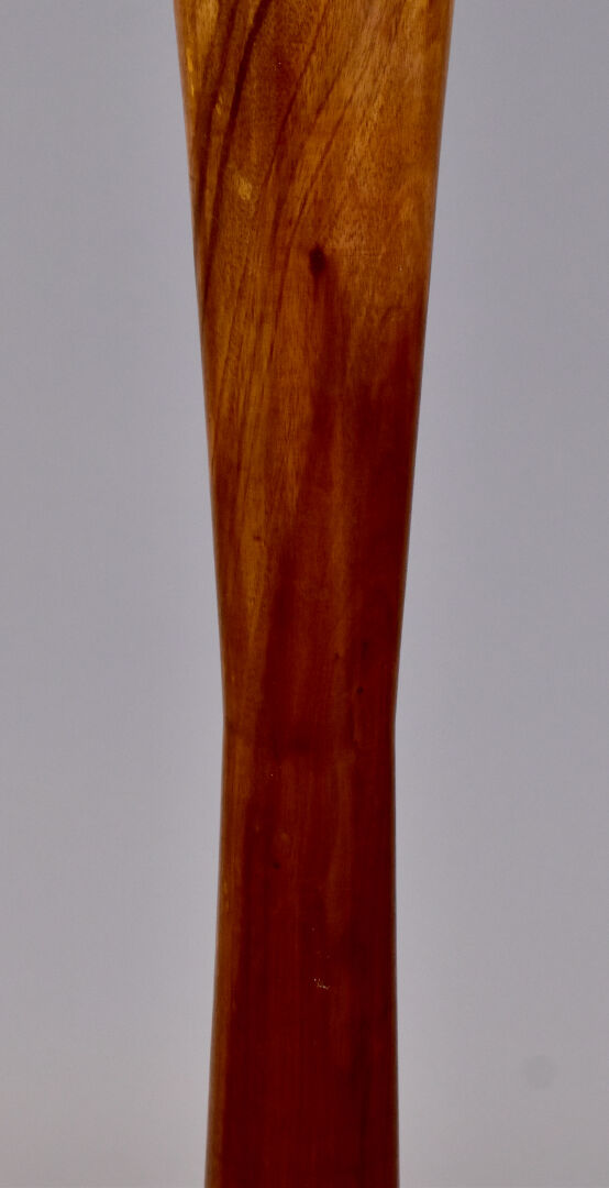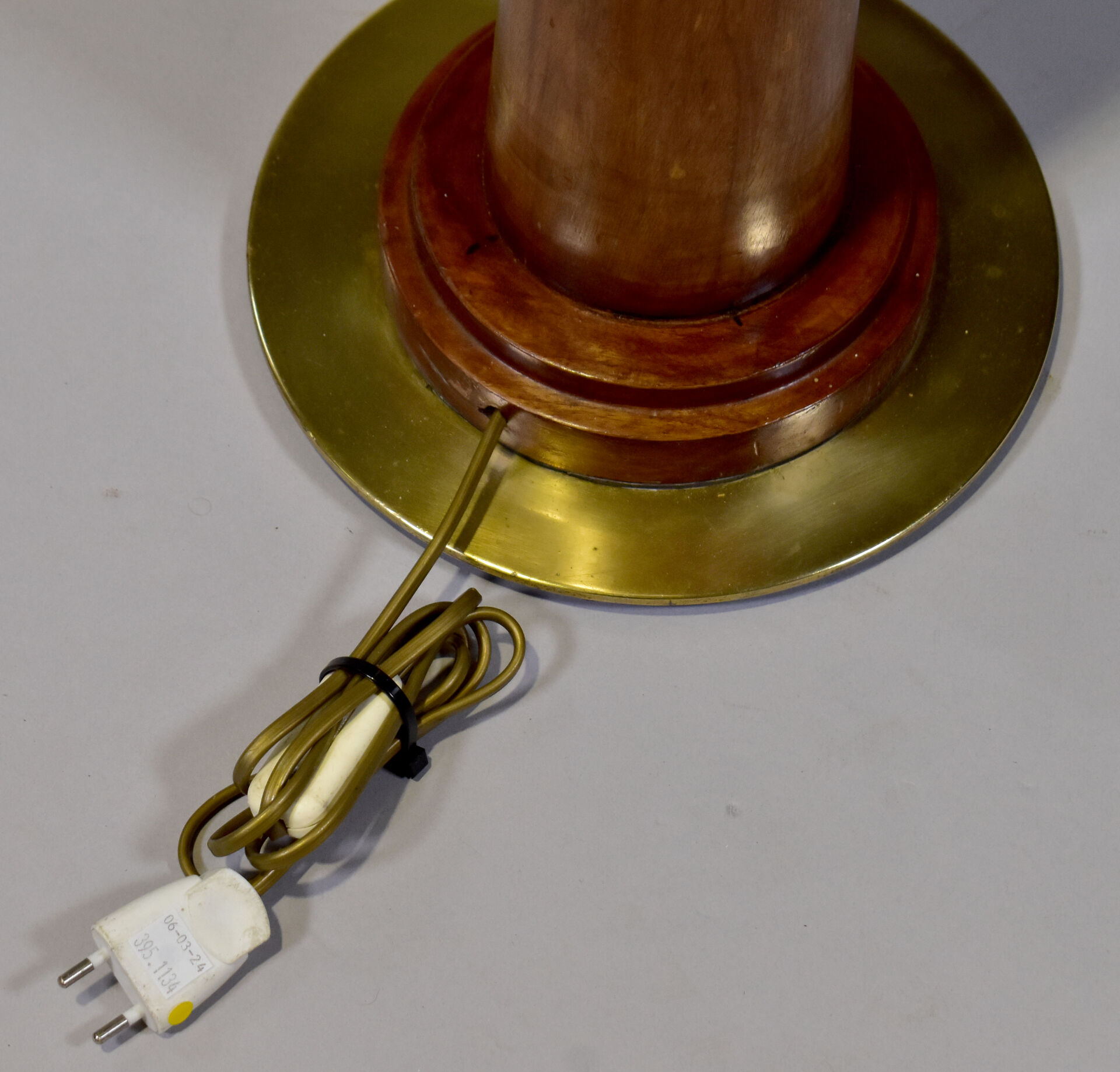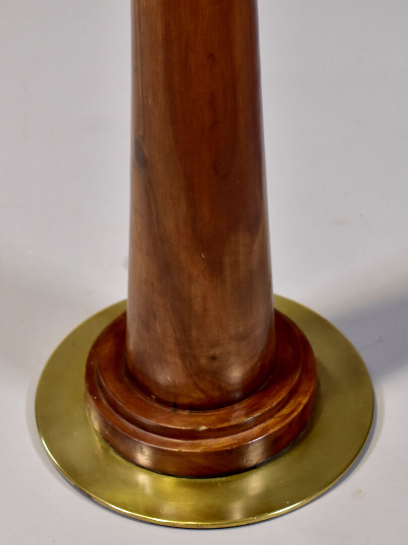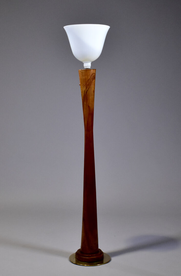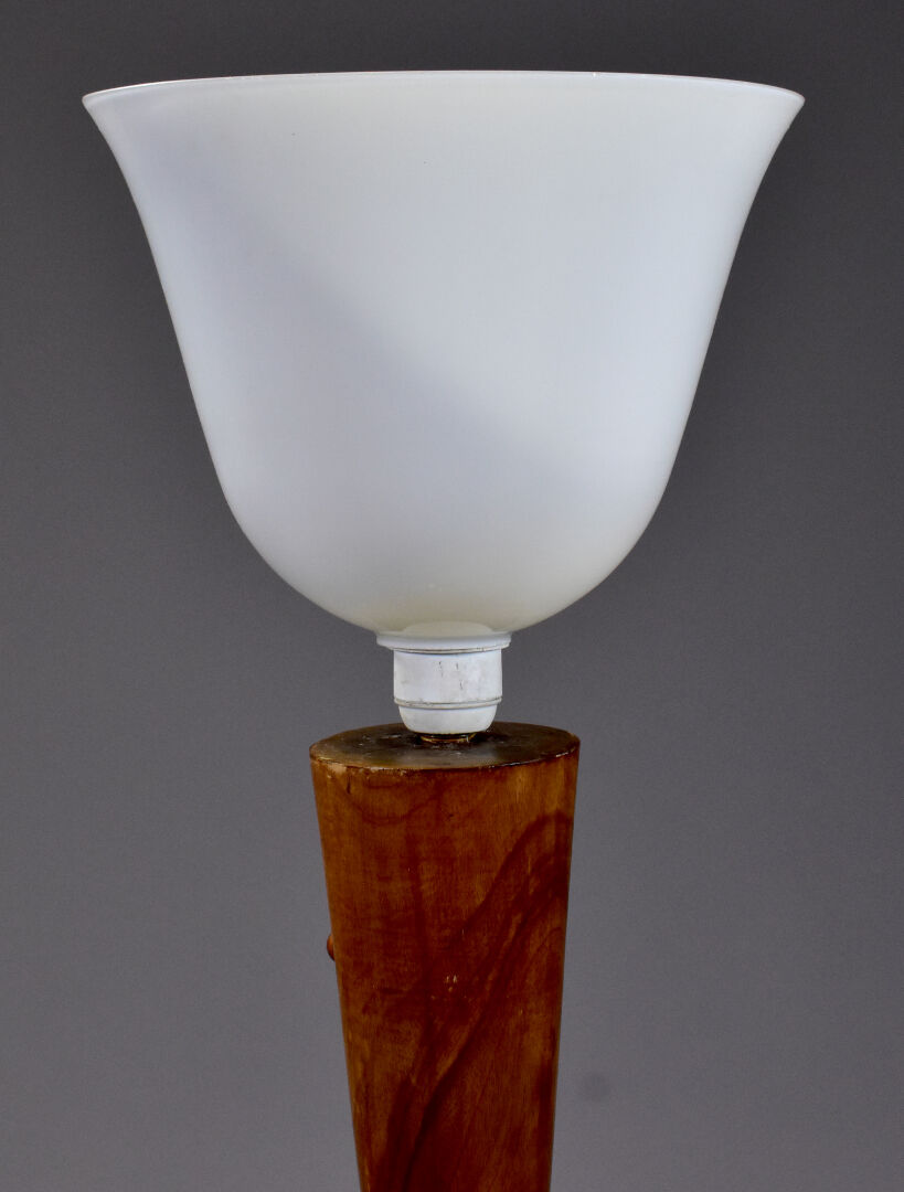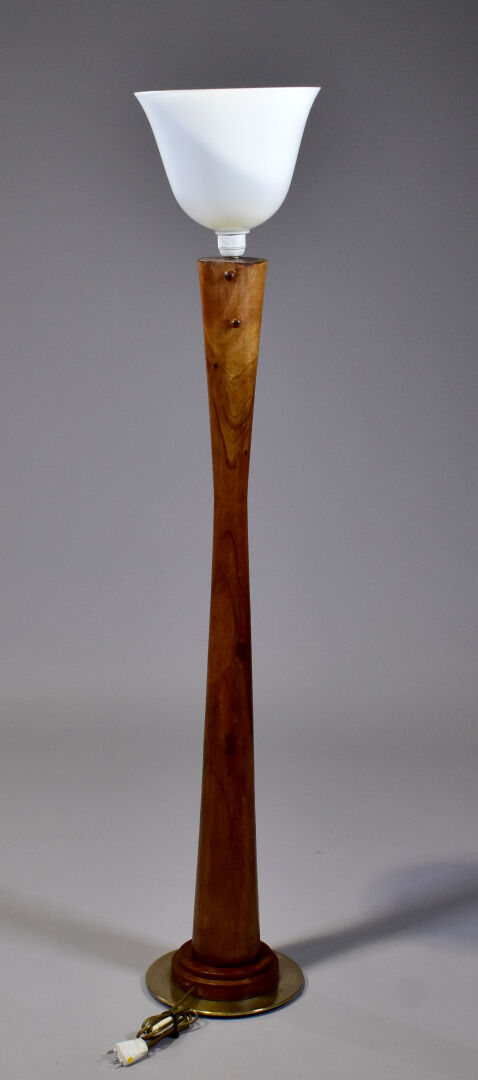 Lampadaire diabolo à fût en acajou ou noyer teinté, le diffuseur en opaline blanche, la base en laiton. Dans le goût de Mazda, vers 1940. Haut. : 140 cm.