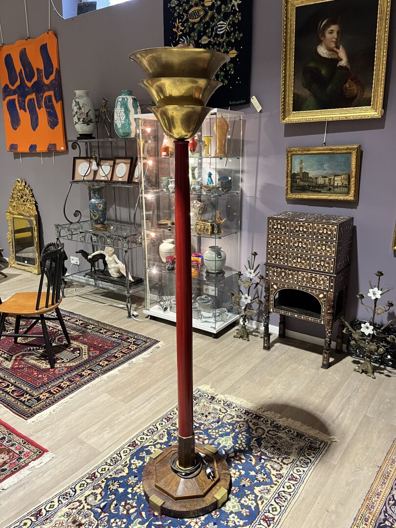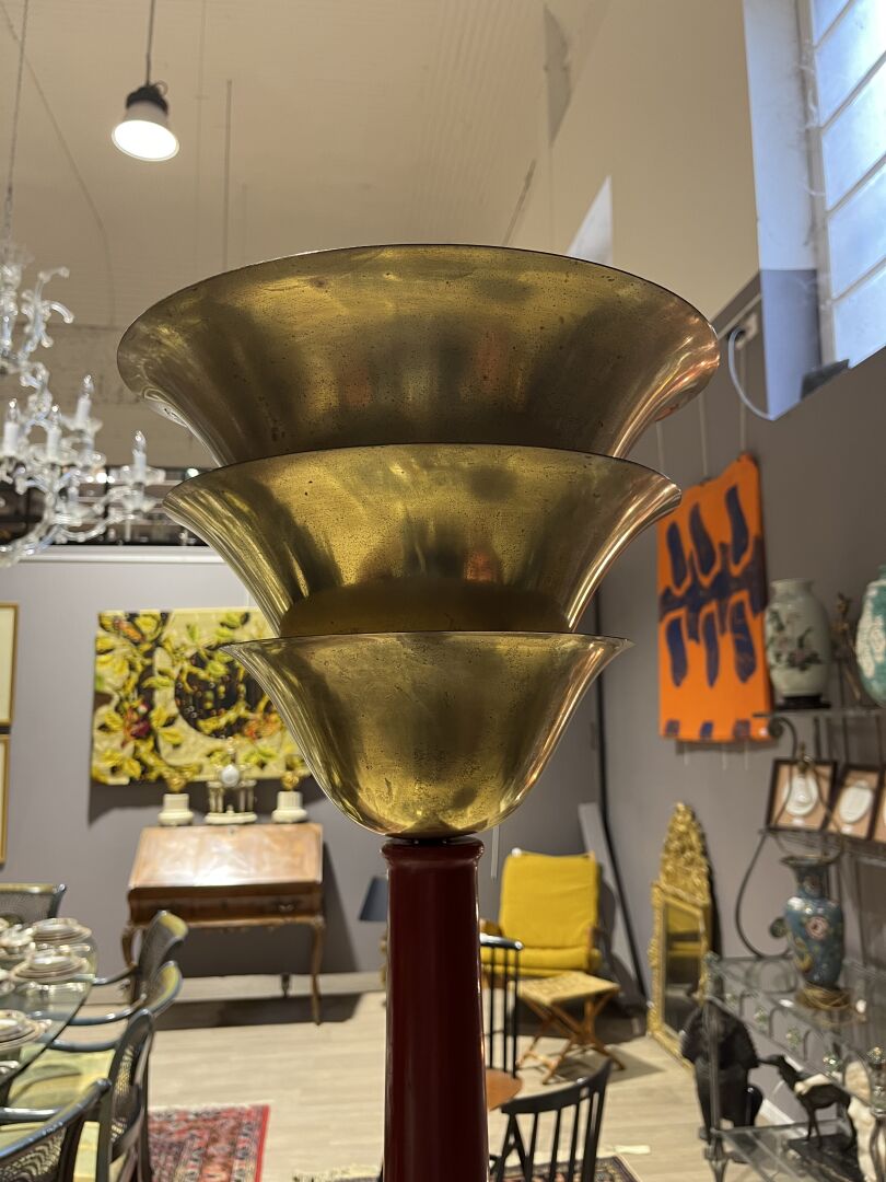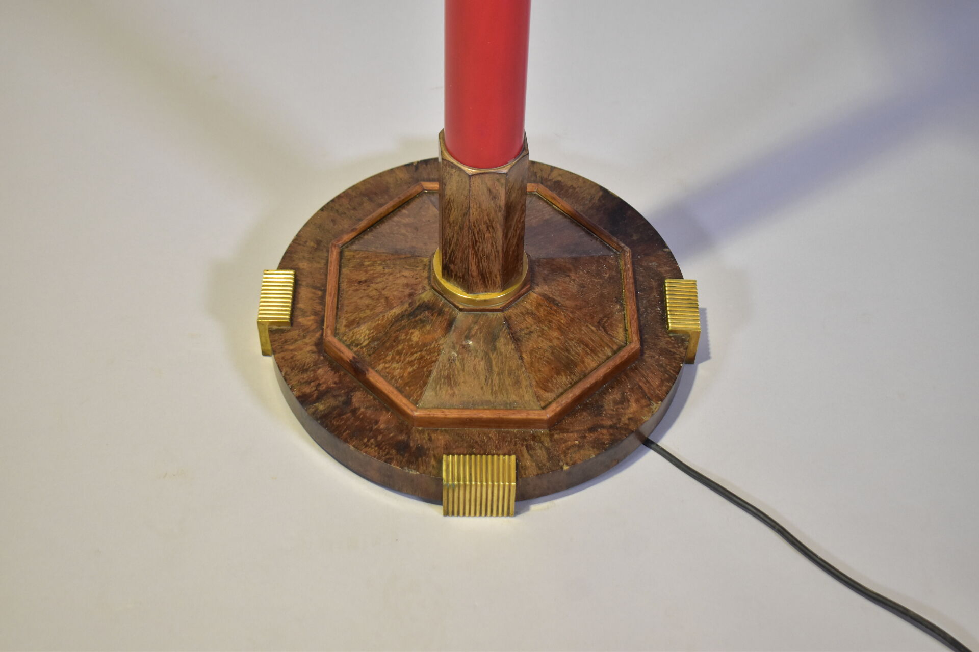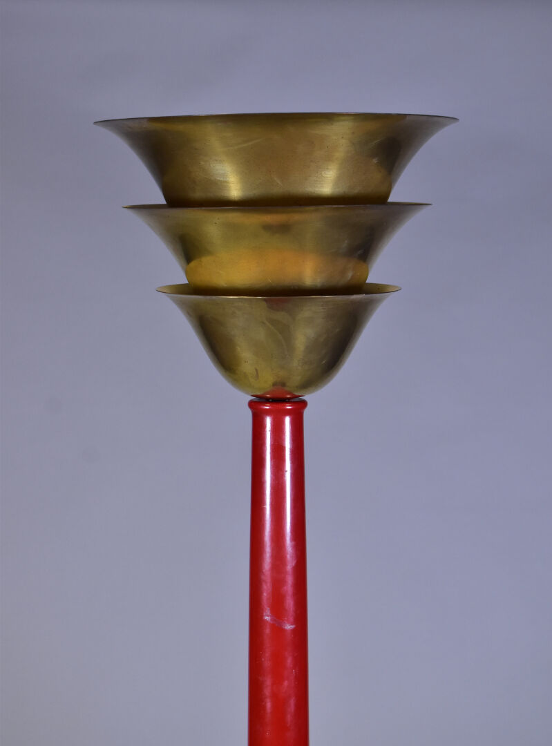 Lampadaire en bois et métal, relaqué rouge à trois cornets en métal doré, la base circulaire plaquée de palissandre (mouillures) à quatre barrettes striées. Fin d’époque Art Déco, vers 1940 (électricité moderne). Haut. : 180 cm.