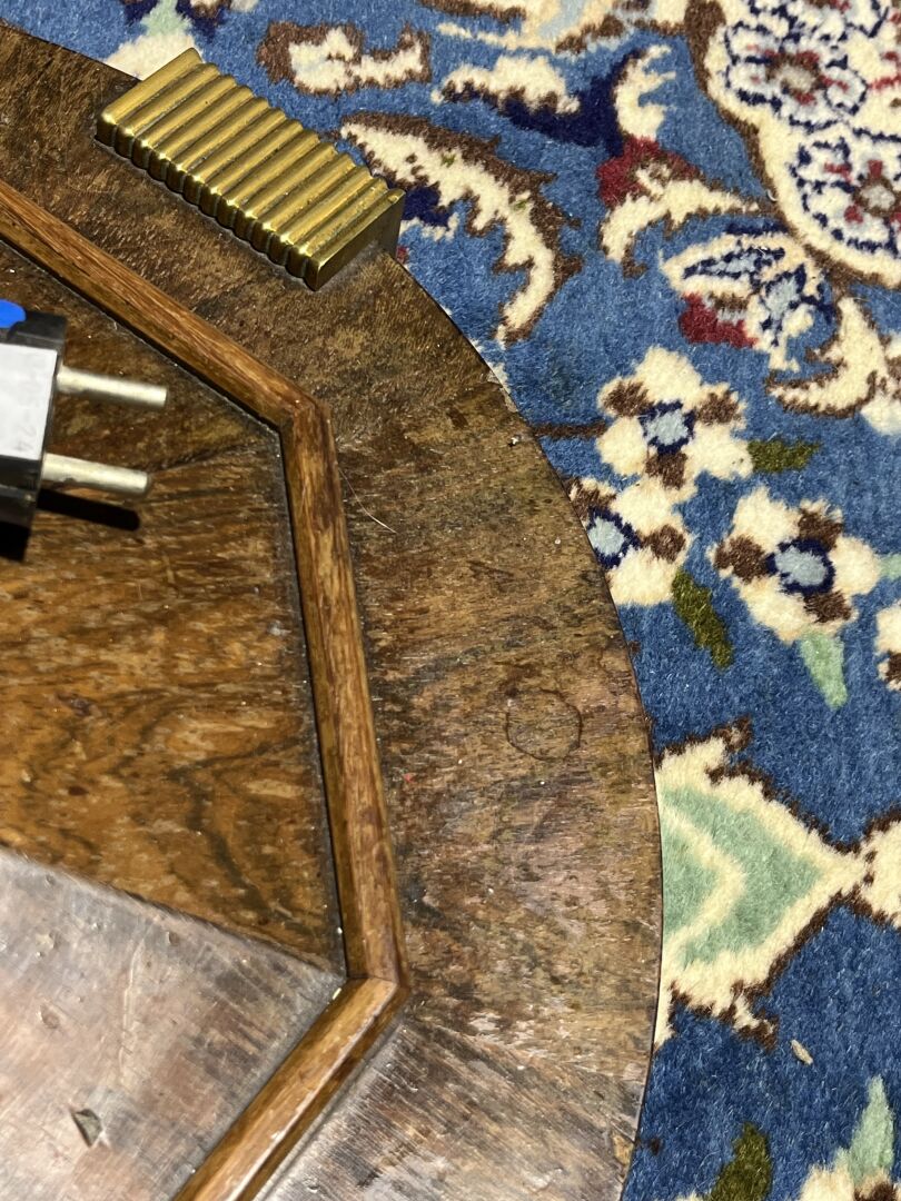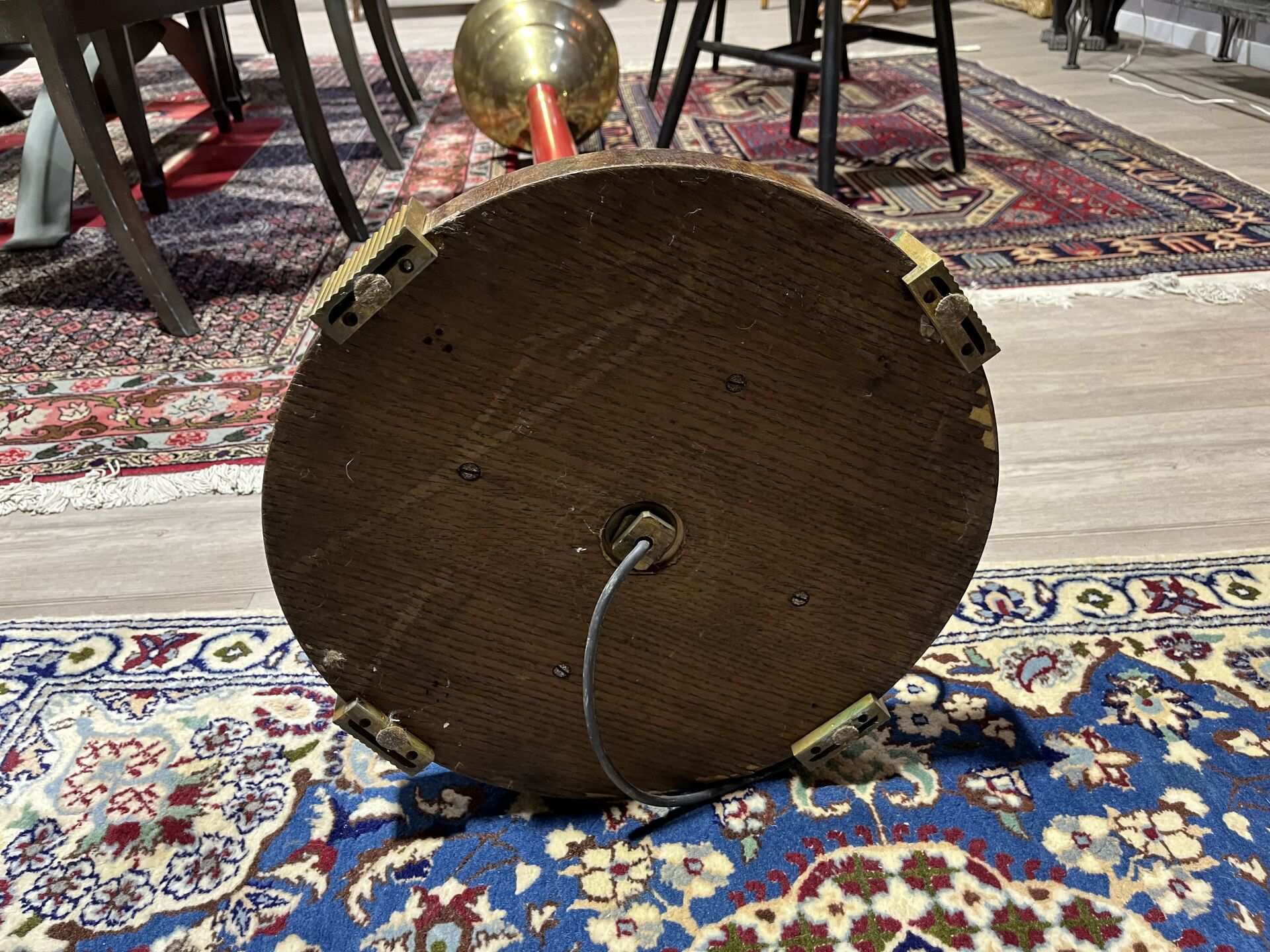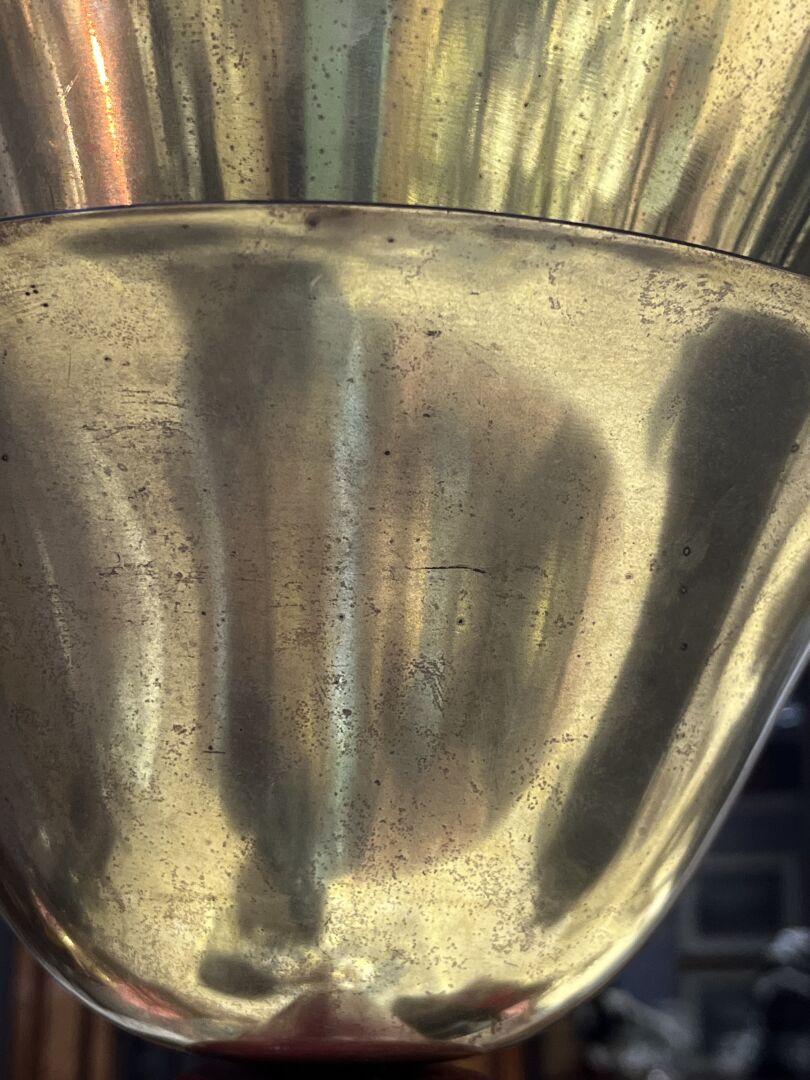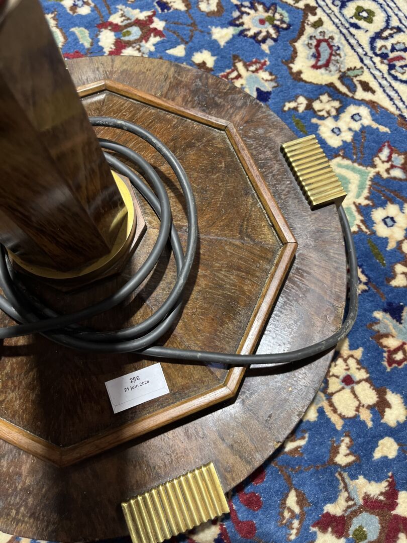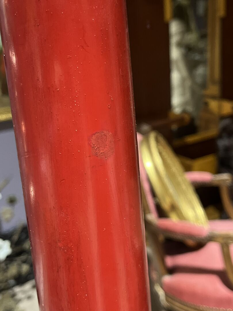 Lampadaire en bois et métal, relaqué rouge à trois cornets en métal doré, la base circulaire plaquée de palissandre (mouillures) à quatre barrettes striées. Fin d’époque Art Déco, vers 1940 (électricité moderne). Haut. : 180 cm.