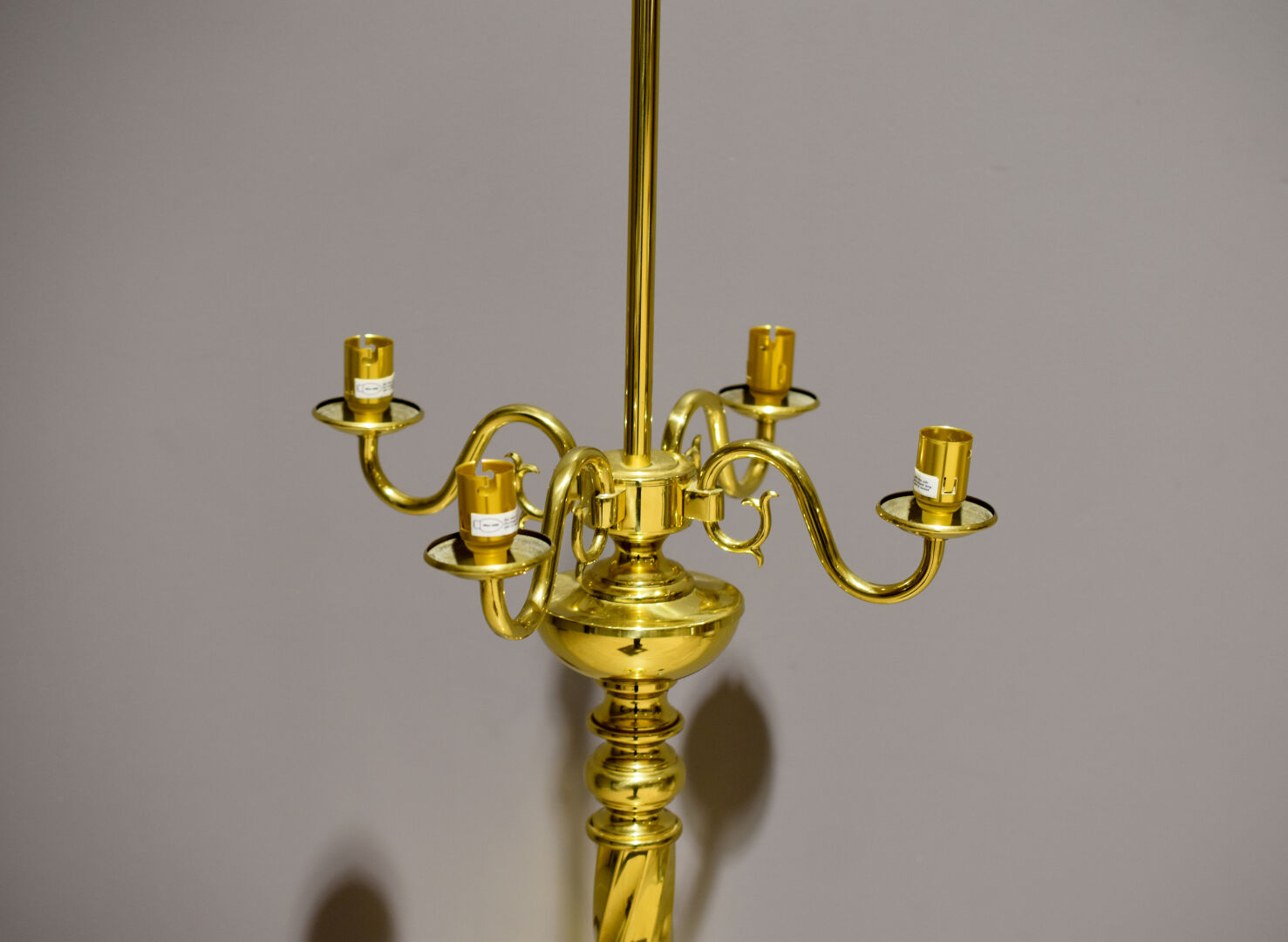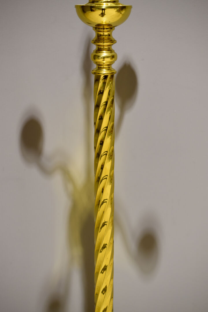 Lampadaire en laiton, le fût torsadé, à quatre bras de lumière en console. XXe siècle. Haut. : 154 cm.