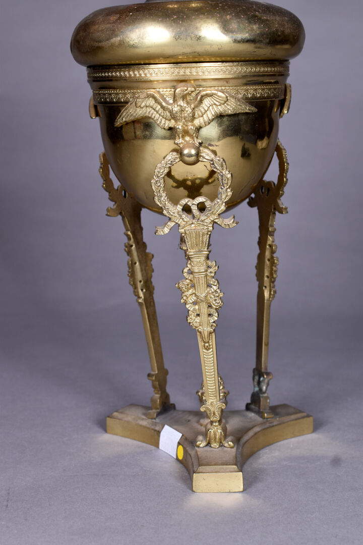 Lampe à huile en métal doré à décor d’aigles, carquois et couronnes de laurier. La base tripode (quelques enfoncements et déformations, restaurations). Haut. : 36 cm.