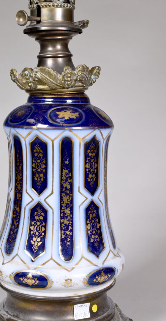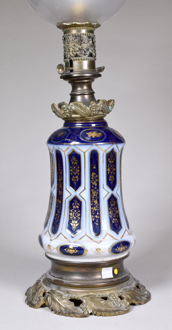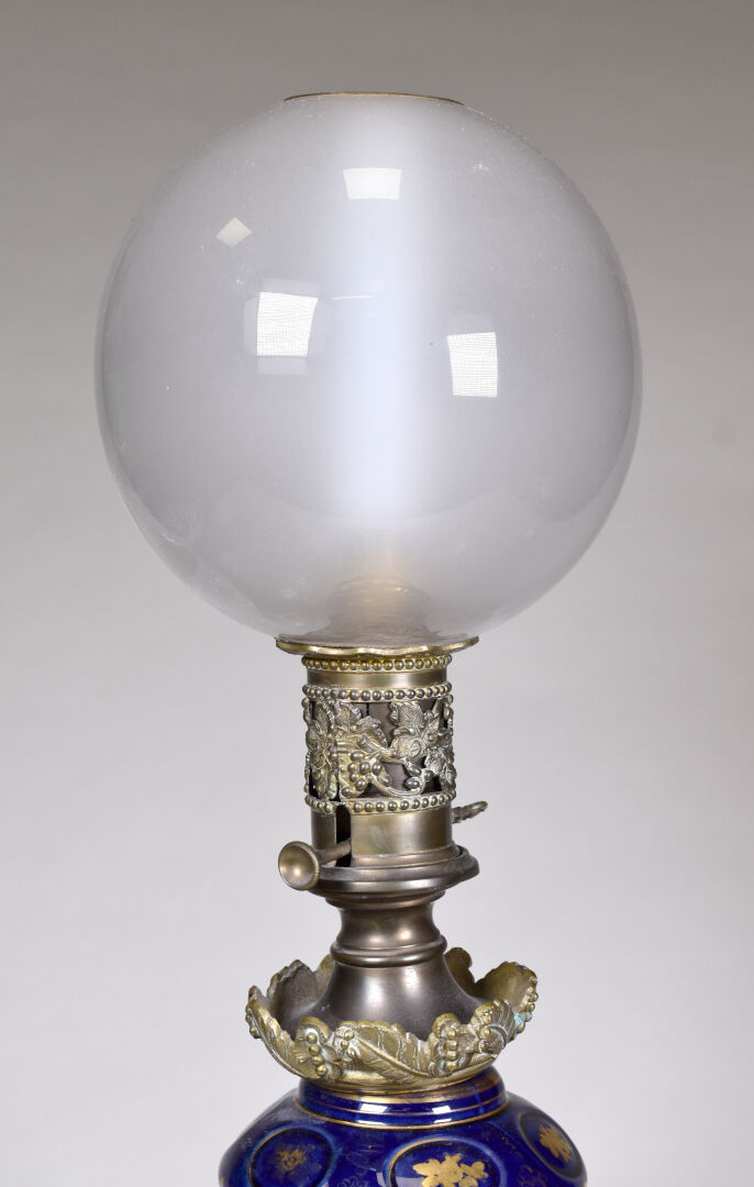 Lampe à pétrole en porcelaine blanche et bleu. Monture en bronze à décor de plumes. Avec globe. Fin du XIXe siècle. Haut. : 64 cm.