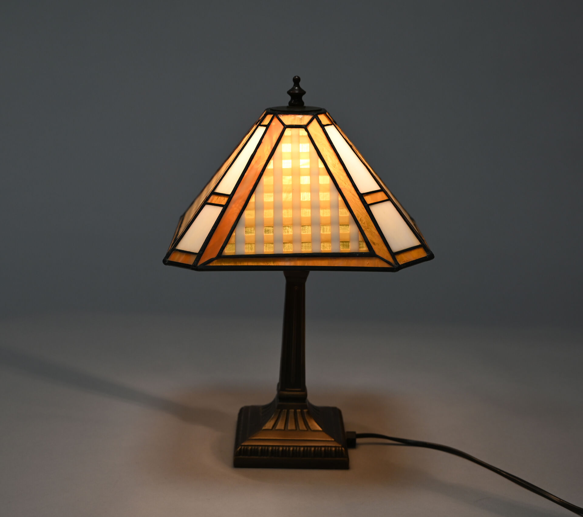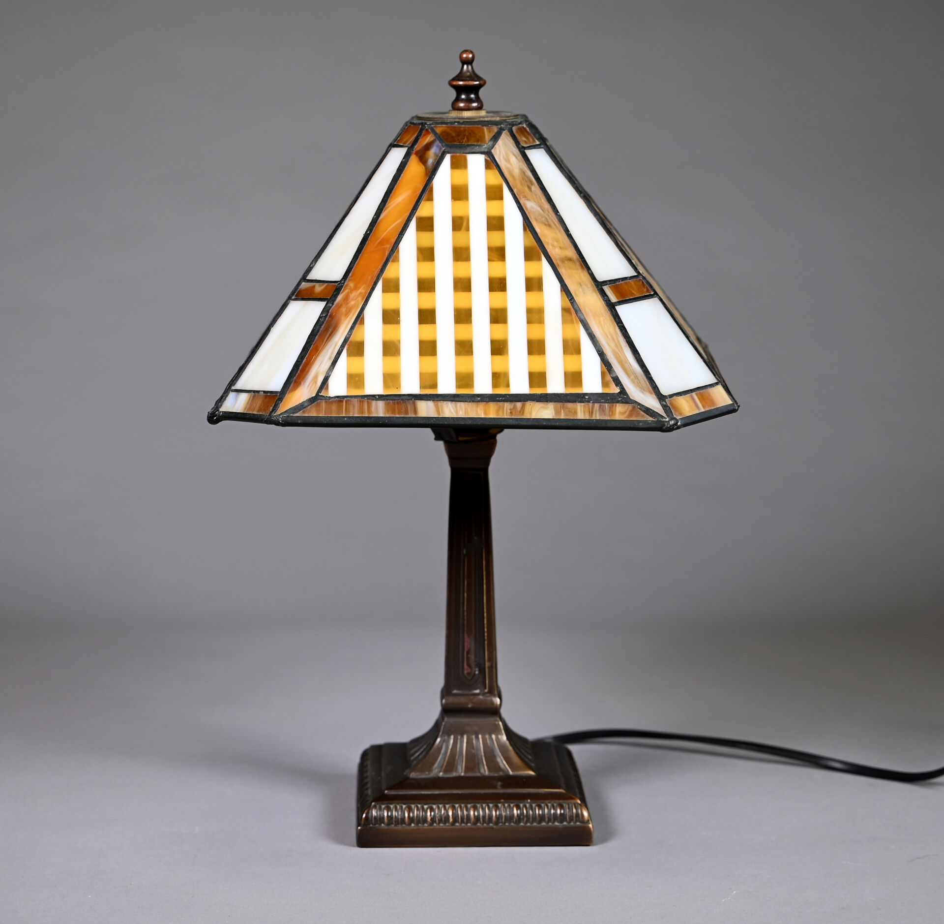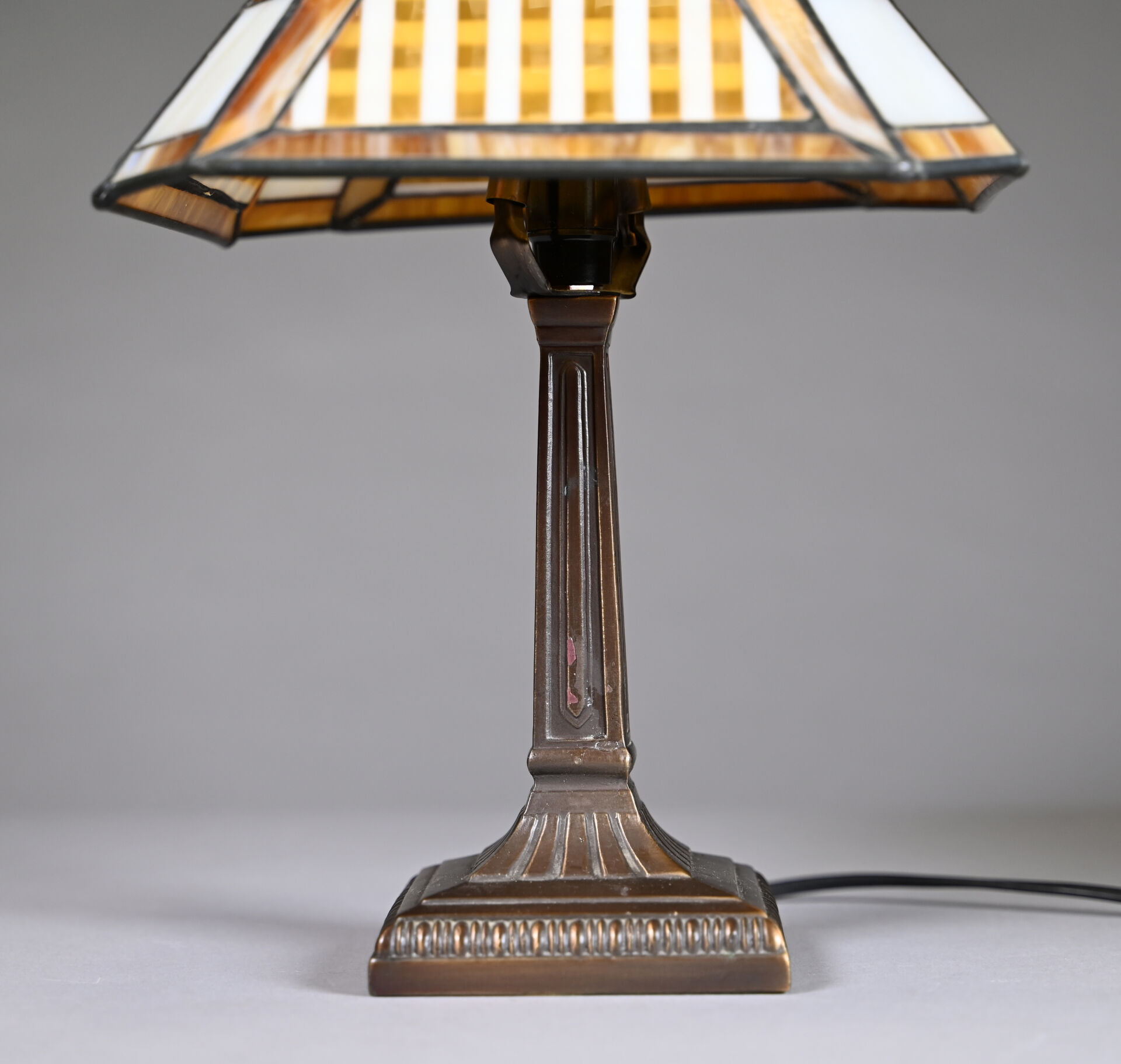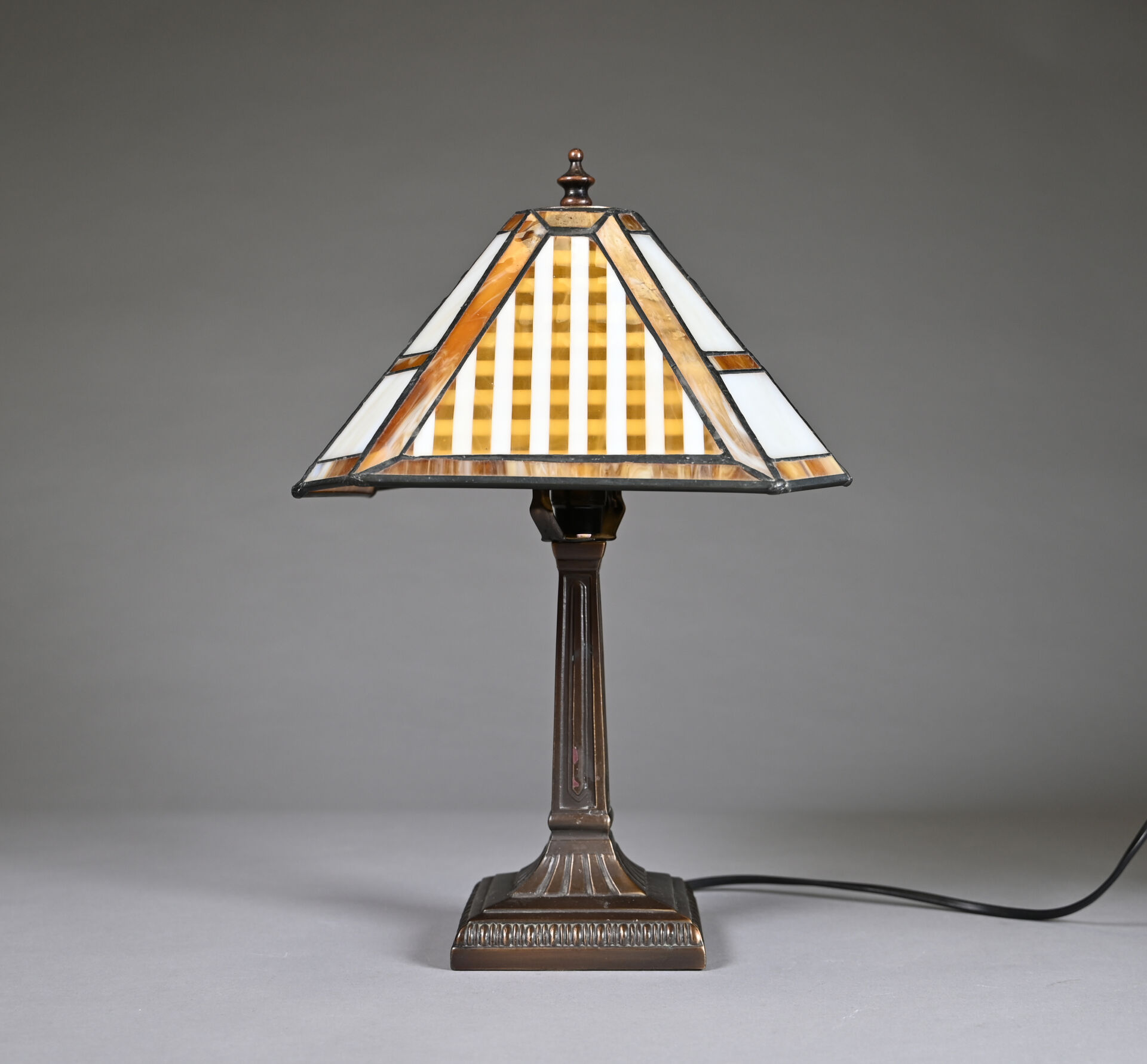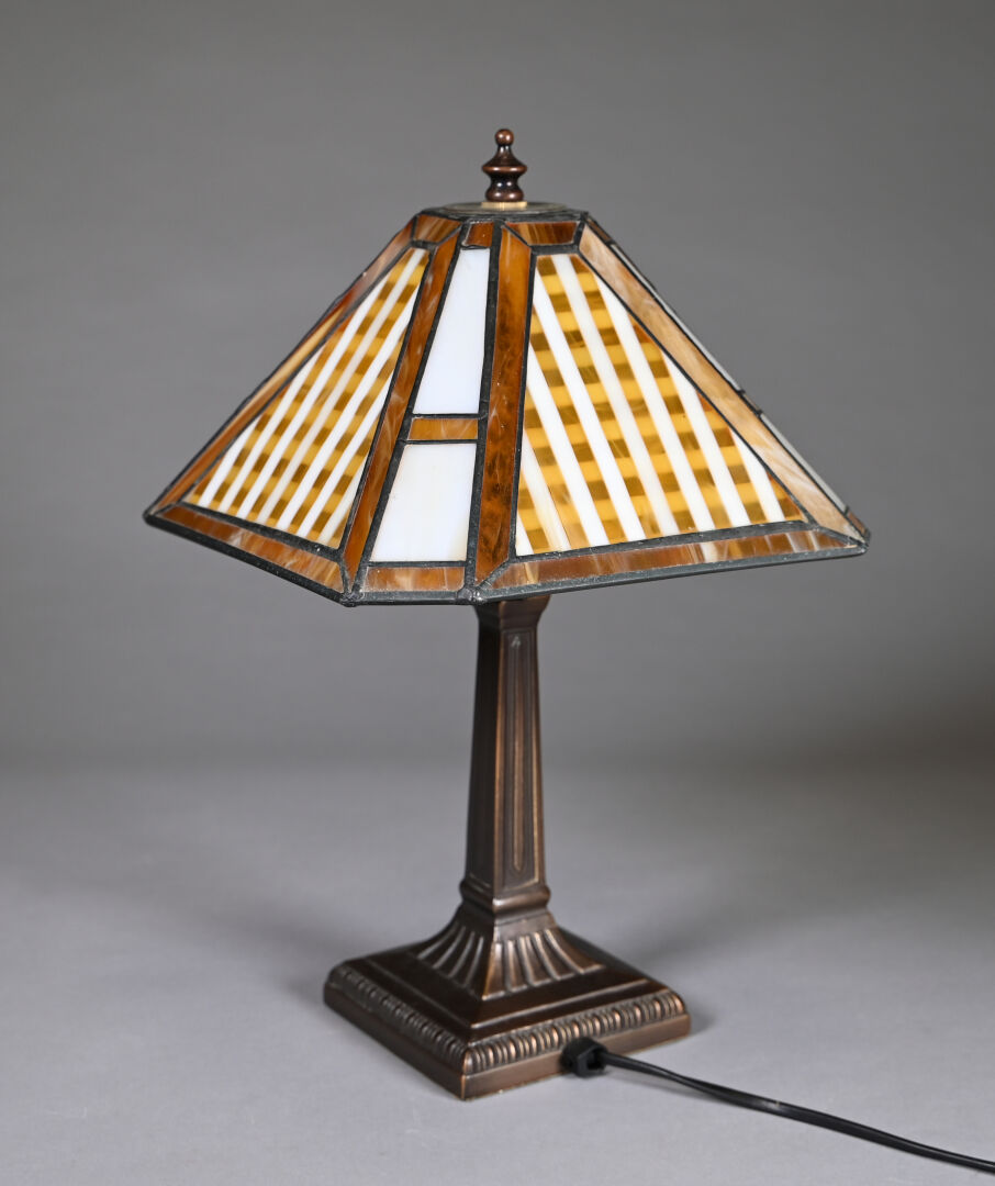 Lampe à pose à piètement cannelé en bronze patiné brun, l’abat-jour conique en verre ambré et blanc travaillé en vitrail. Style Art Déco. Haut. : 40 cm.