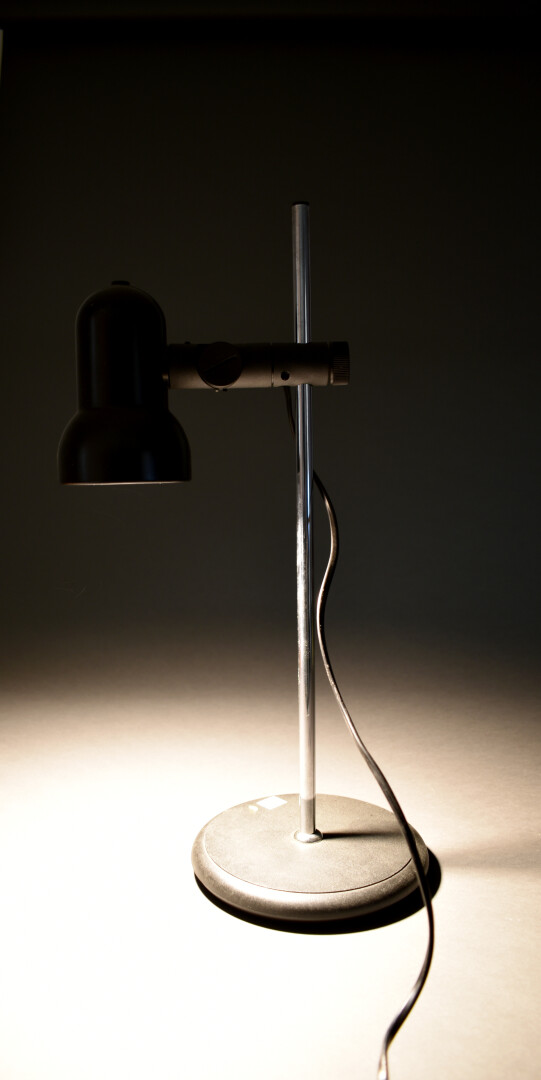 Lampe à poser à hauteur ajustable en métal laqué noir et chromé et pvc. Vers 1980. Haut.max. : 51 cm.