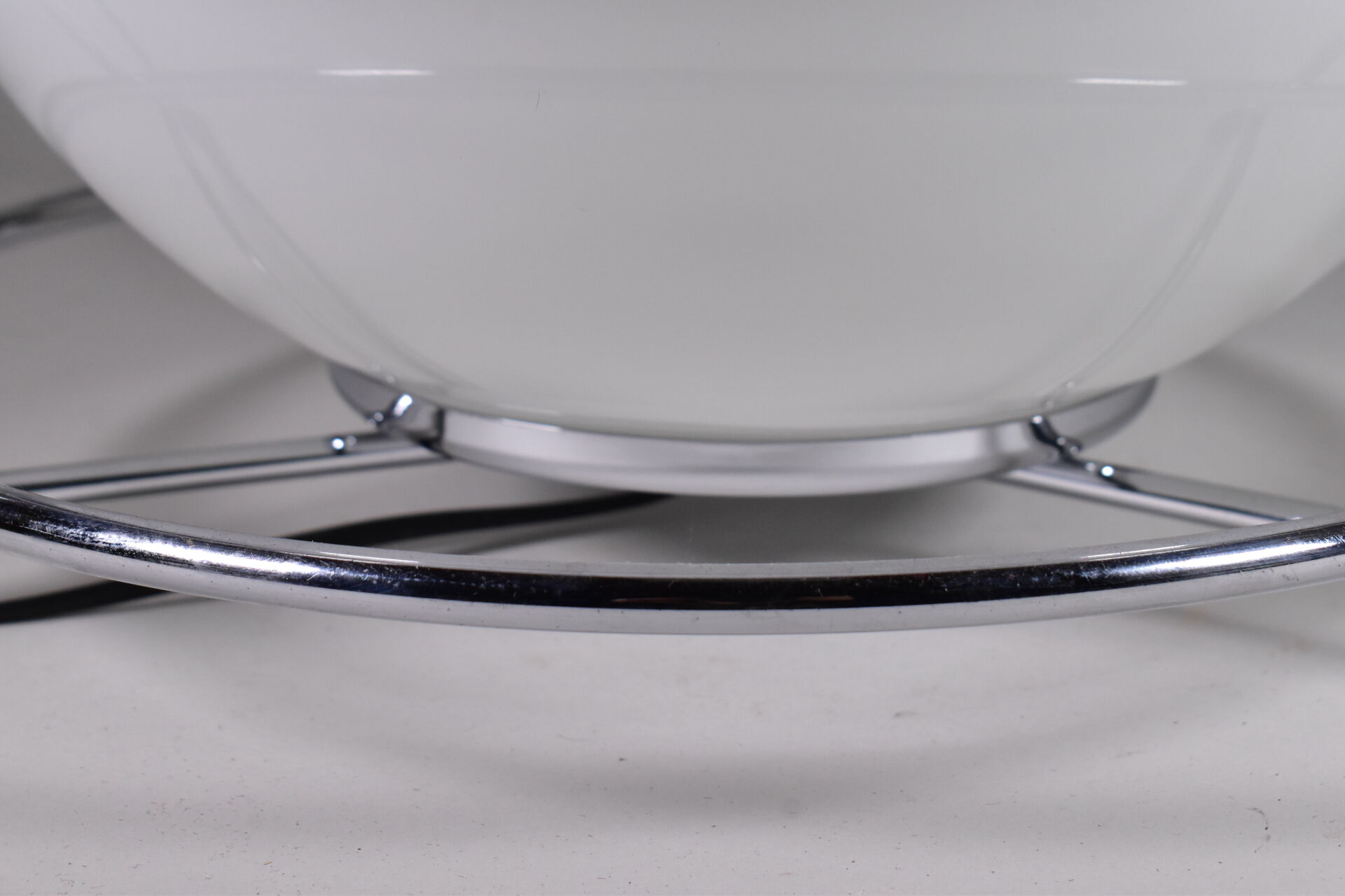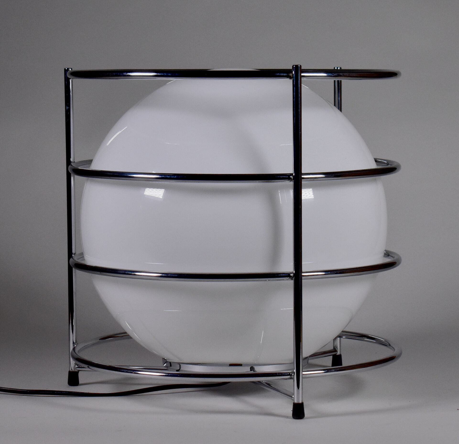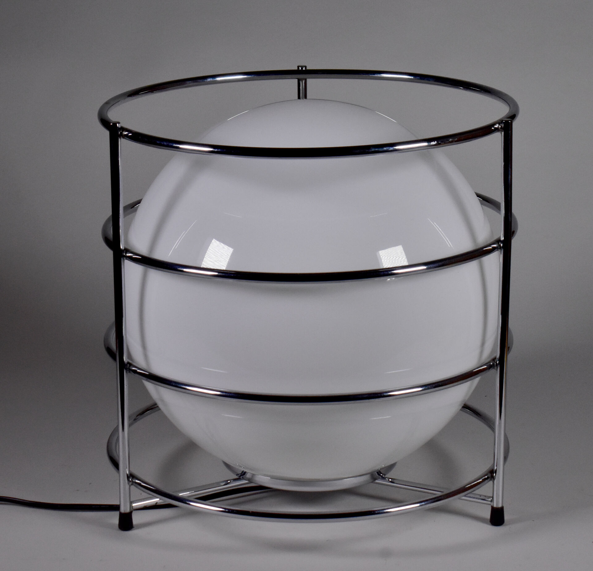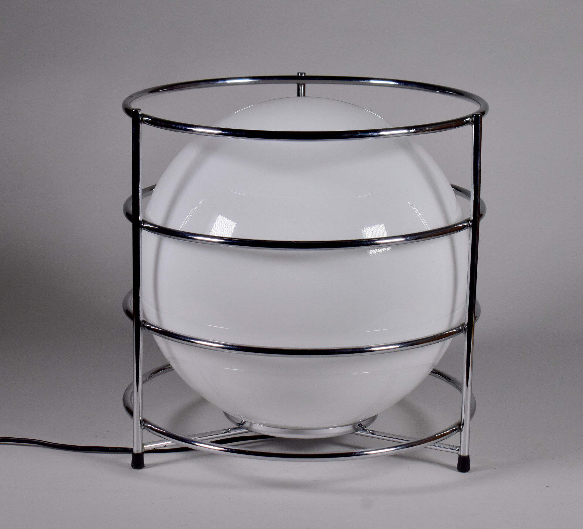 Lampe à poser à structure en métal chromé abritant un important globe en opaline blanche. Travail probablement des années 1970. Haut. : 39 cm – Diam. : 40,5 cm.