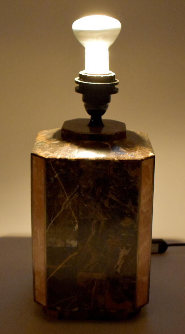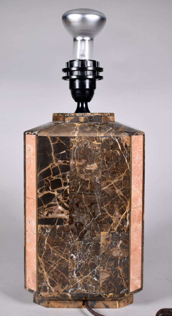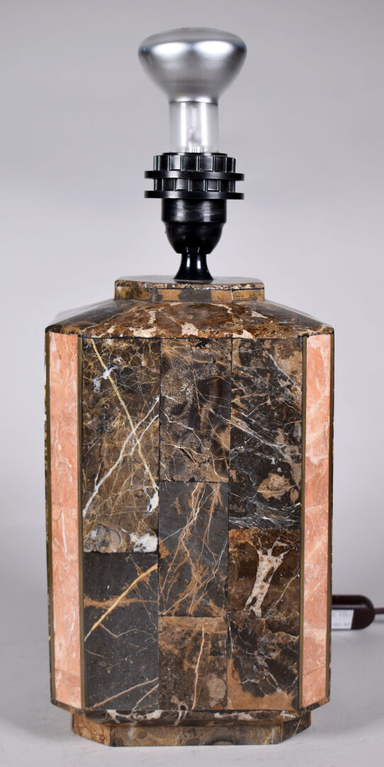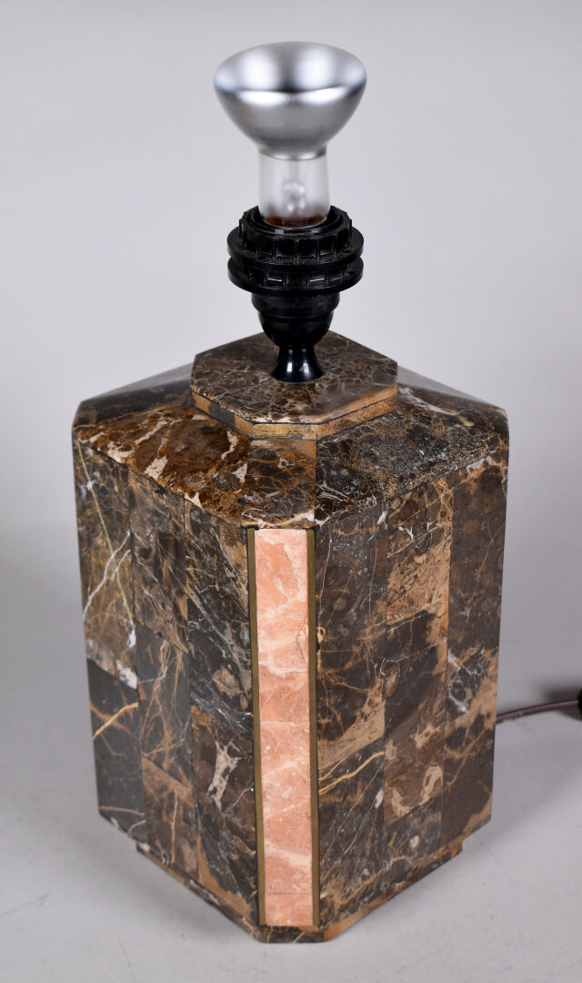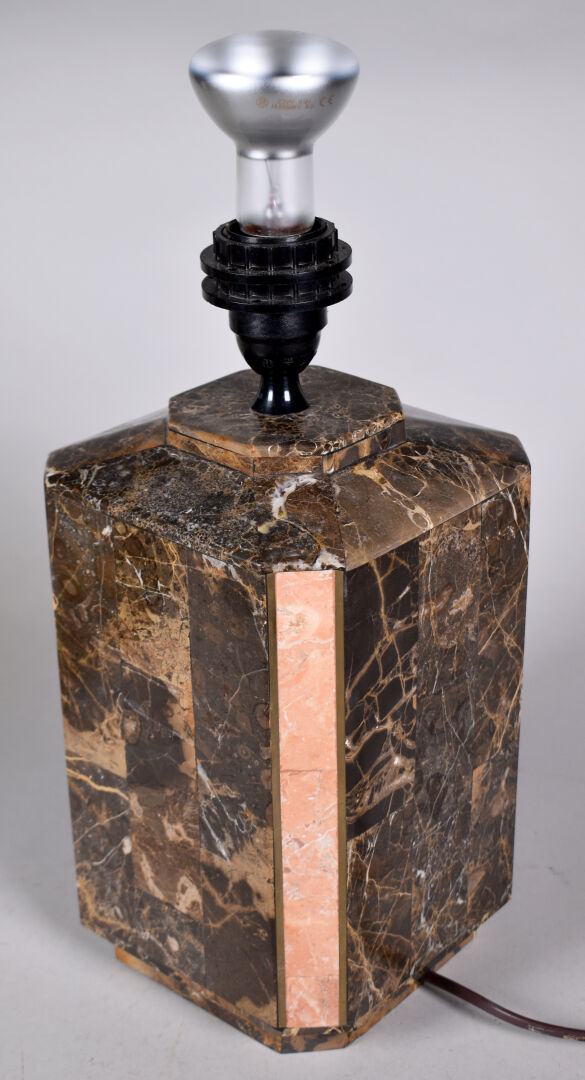 Lampe à poser de section hexagonale en marqueterie de pierre brun et rose, avec baguettes de laiton. Vers 1980. Haut. : 40,5 cm.