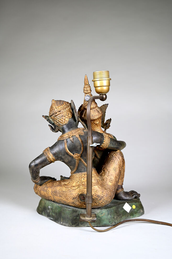 Lampe à poser en bronze patiné vert et or représentant un couple assis. L’abat-jour en pagode. Asie du Sud-Est, XXe siècle. Haut. : 60 cm.