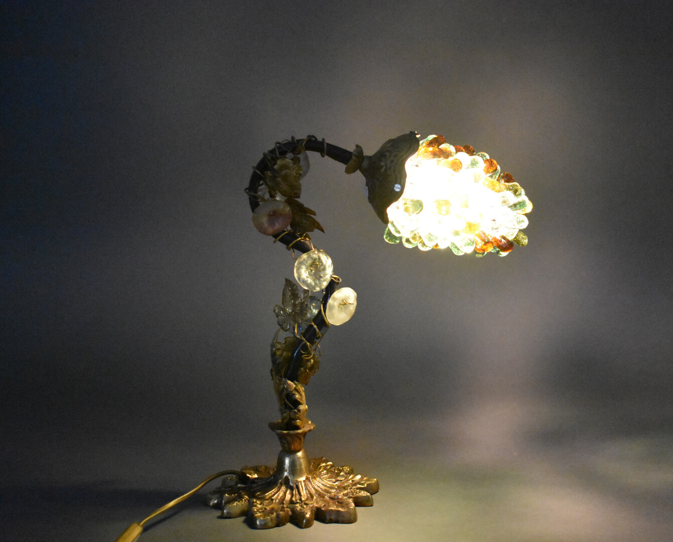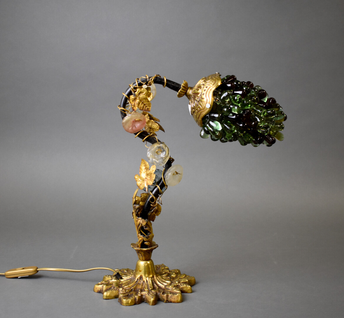 Lampe à poser en fer forgé noir et bronze doré, le fût à décor enroulé de feuilles de vigne en métal doré et fleurs de verre, la tulipe formée d’une grappe de raisins en verre (vis de fixation rapportées). Murano, XXe siècle. Haut. : 36,5 cm.