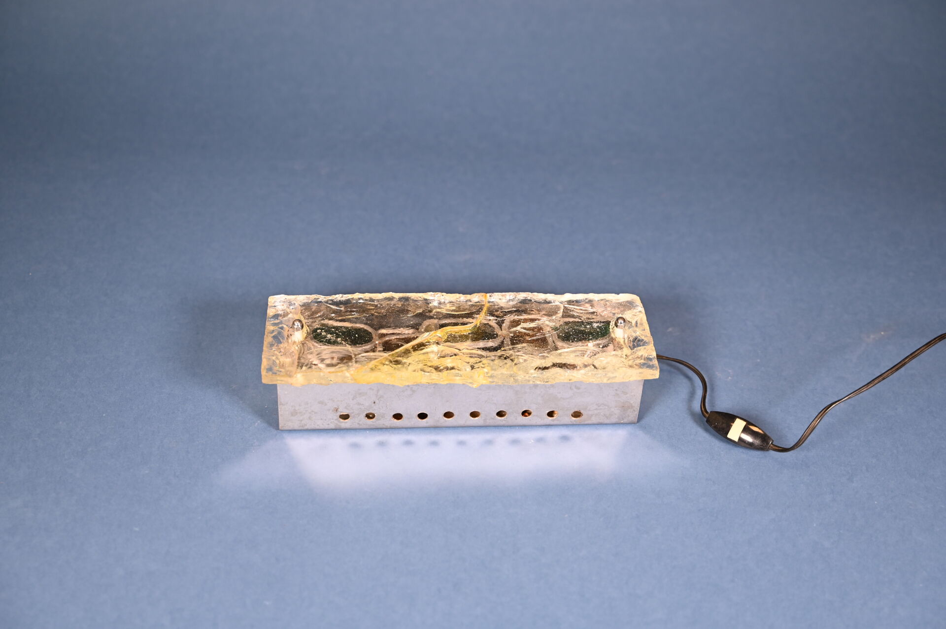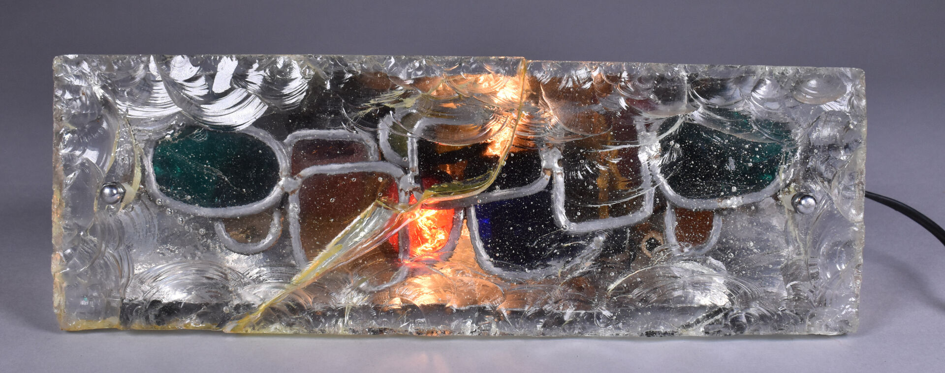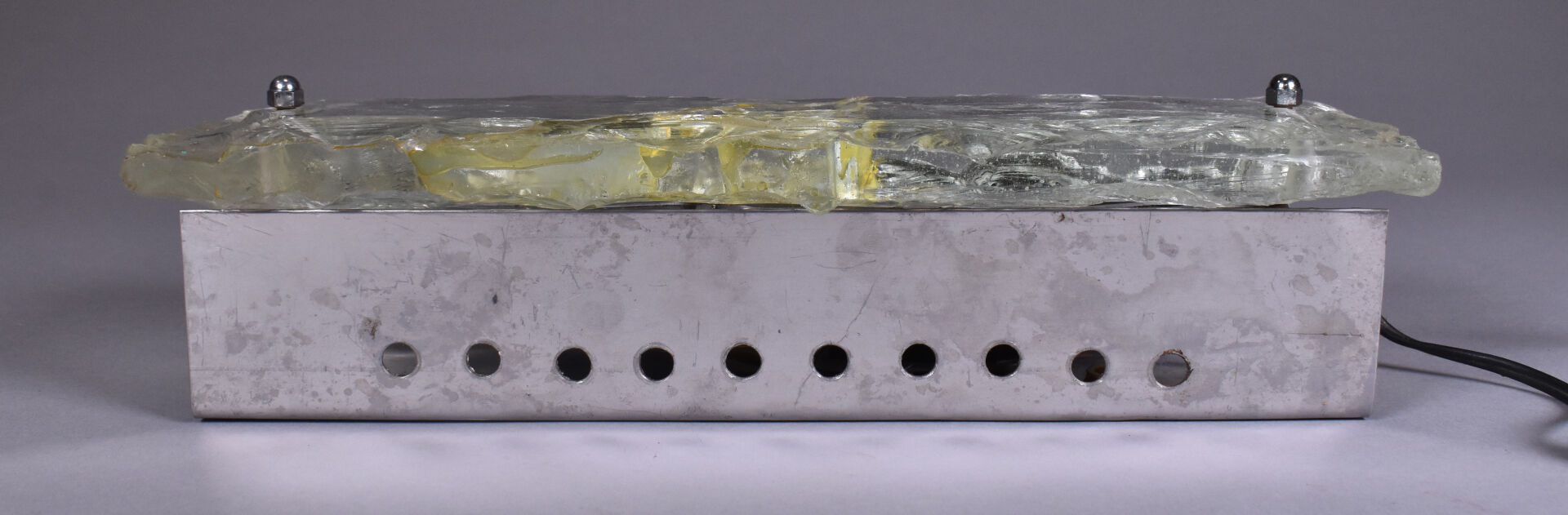 Lampe à poser en métal chromé à une grande plaque de verre clair bullé (accident restauré). Vers 1970. Haut. : 30 cm.