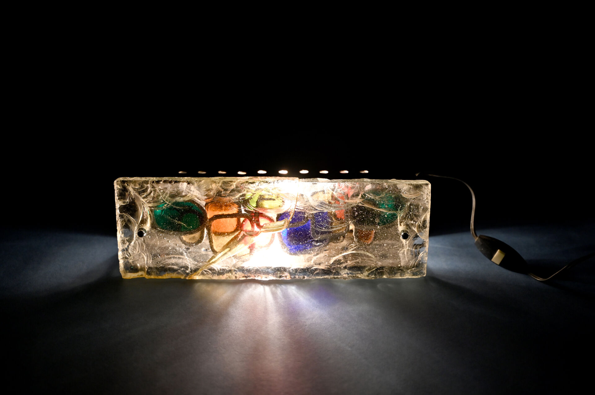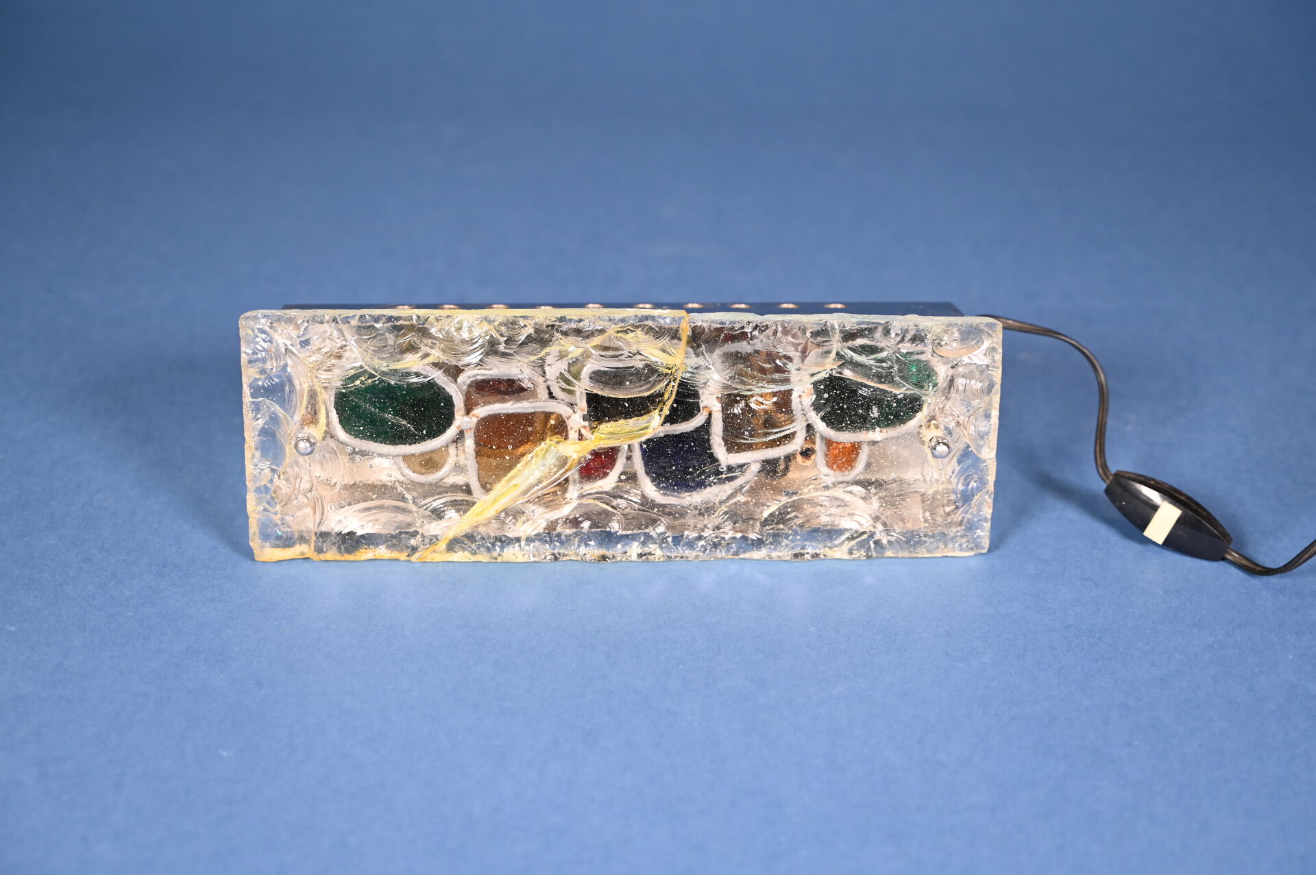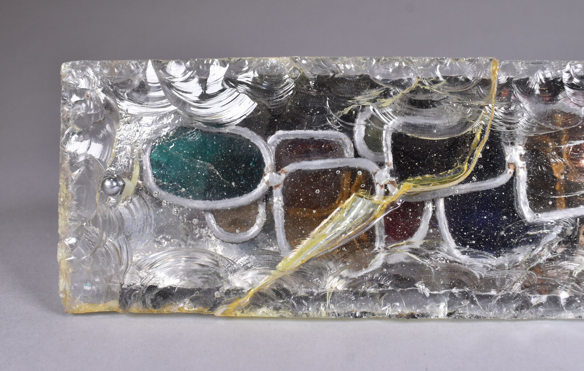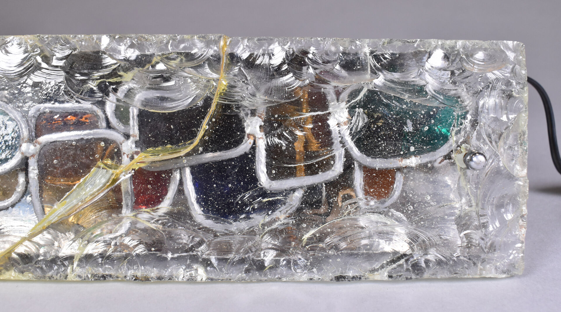 Lampe à poser en métal chromé à une grande plaque de verre clair bullé (accident restauré). Vers 1970. Haut. : 30 cm.