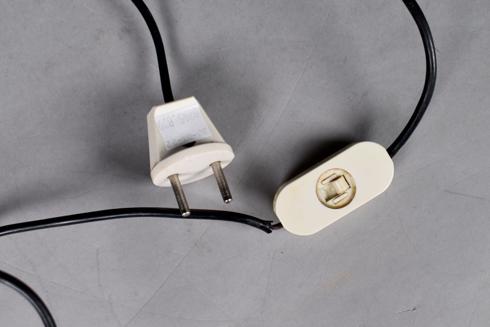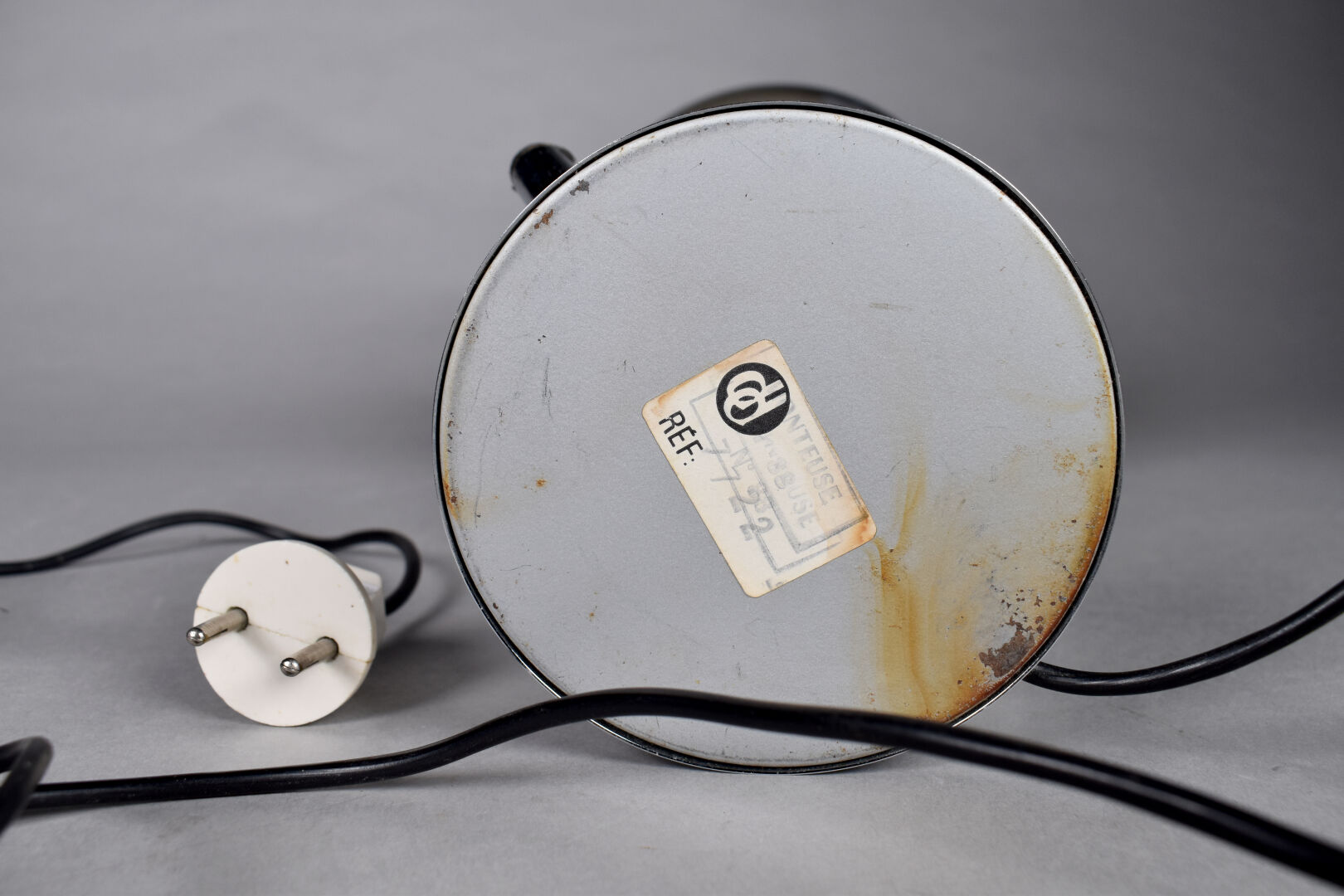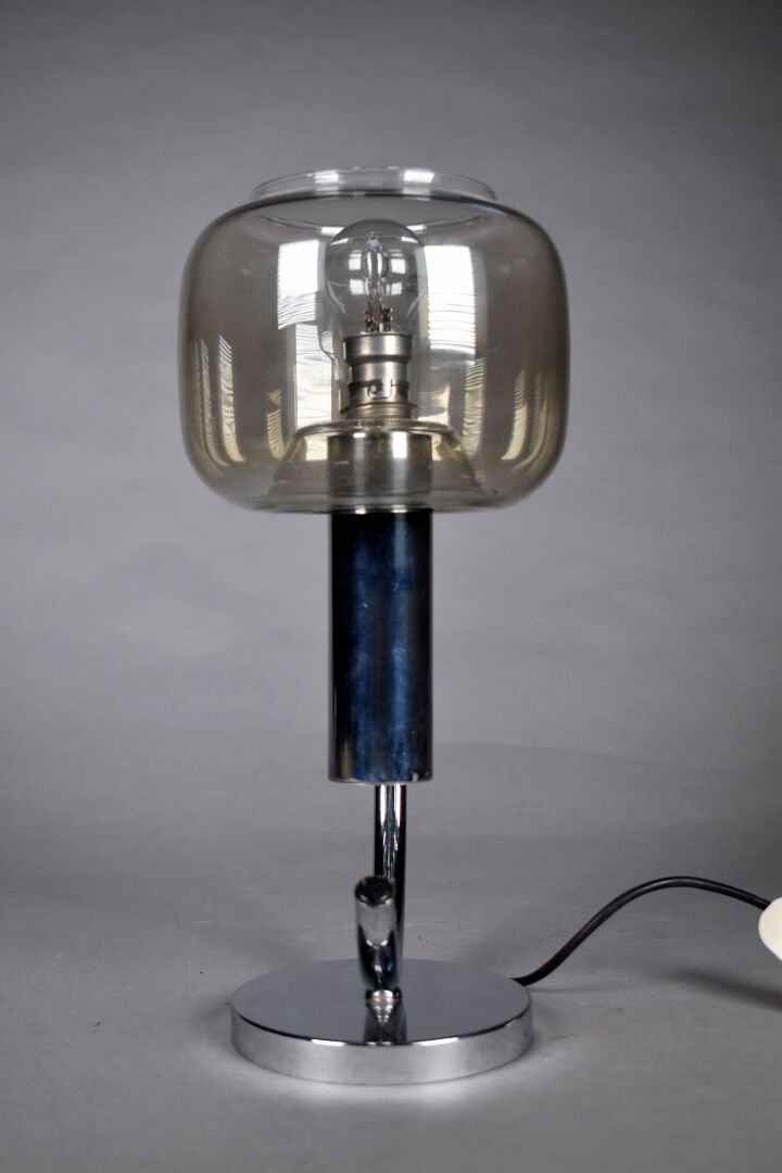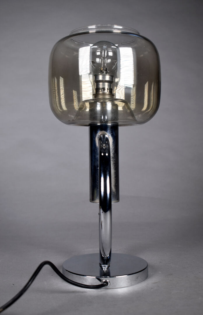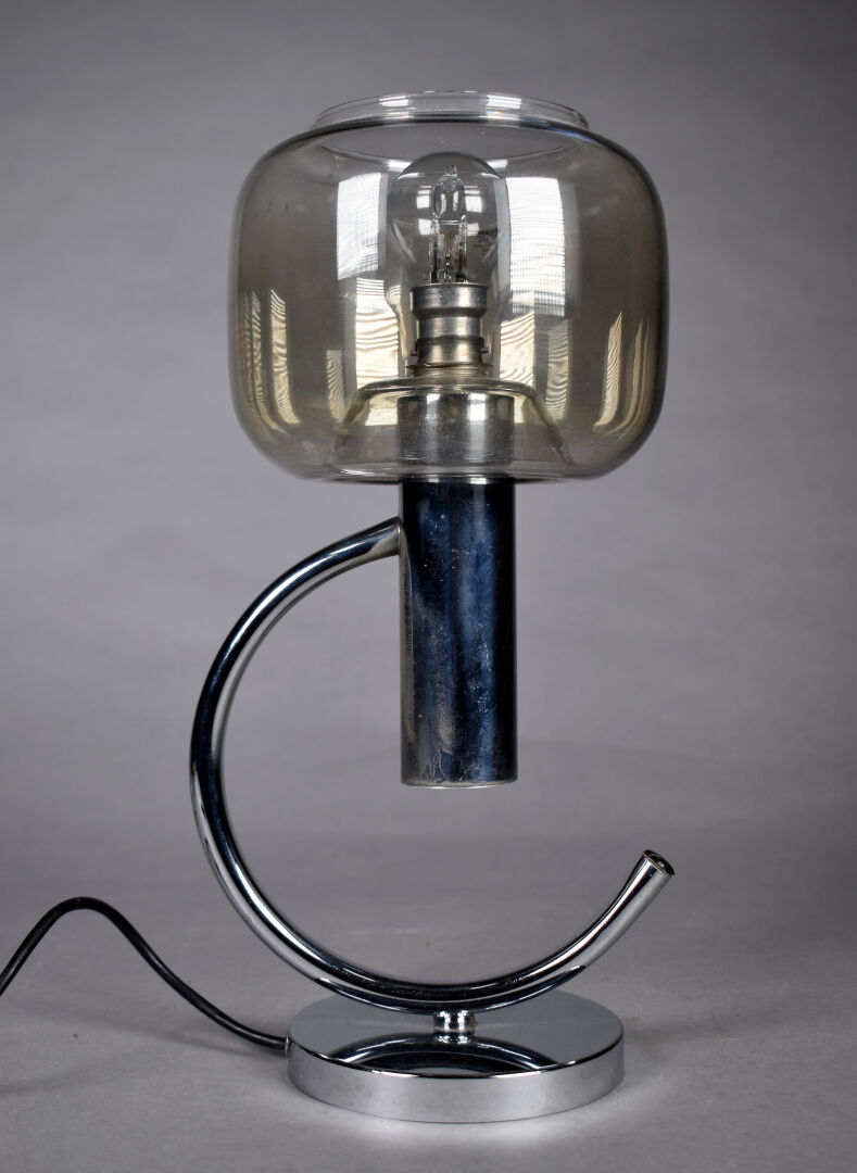 Lampe à poser en métal chromé et globe en verre fumé. Porte une étiquette DD au dessous. Vers 1970. Haut. : 32, 5 cm.