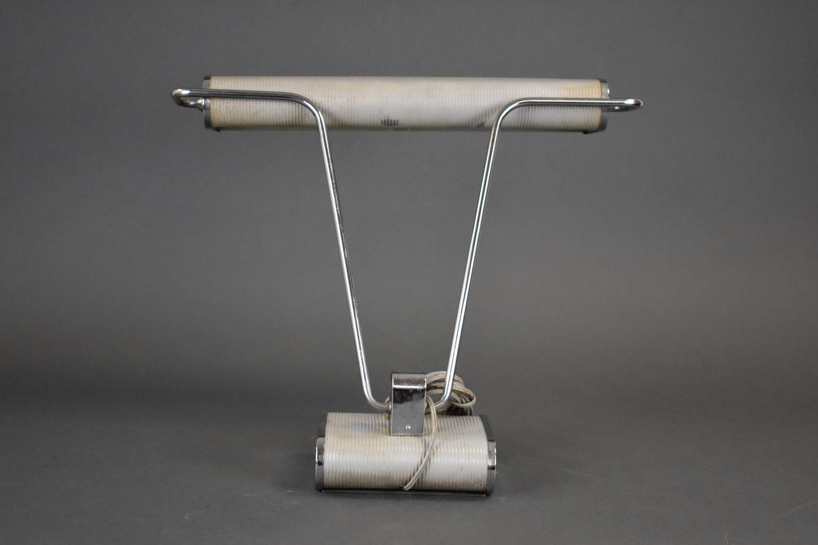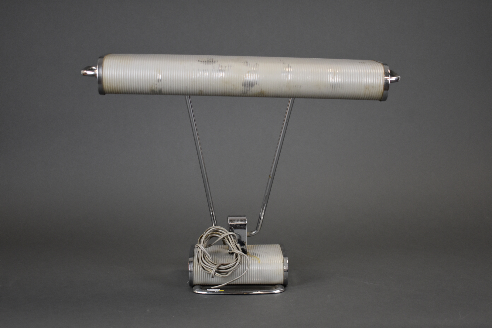 Lampe à poser en métal chromé et métal laqué gris, hauteur ajustable (manque la prise). Vers 1940/1950. Haut. : 34,5 cm