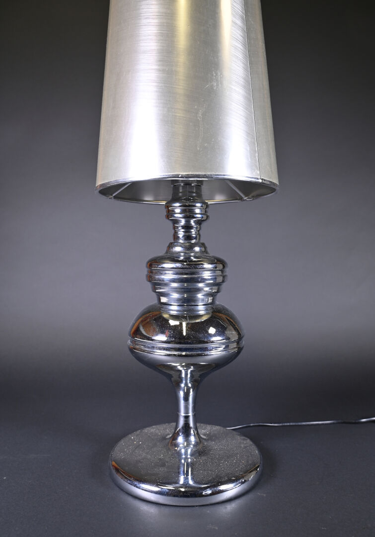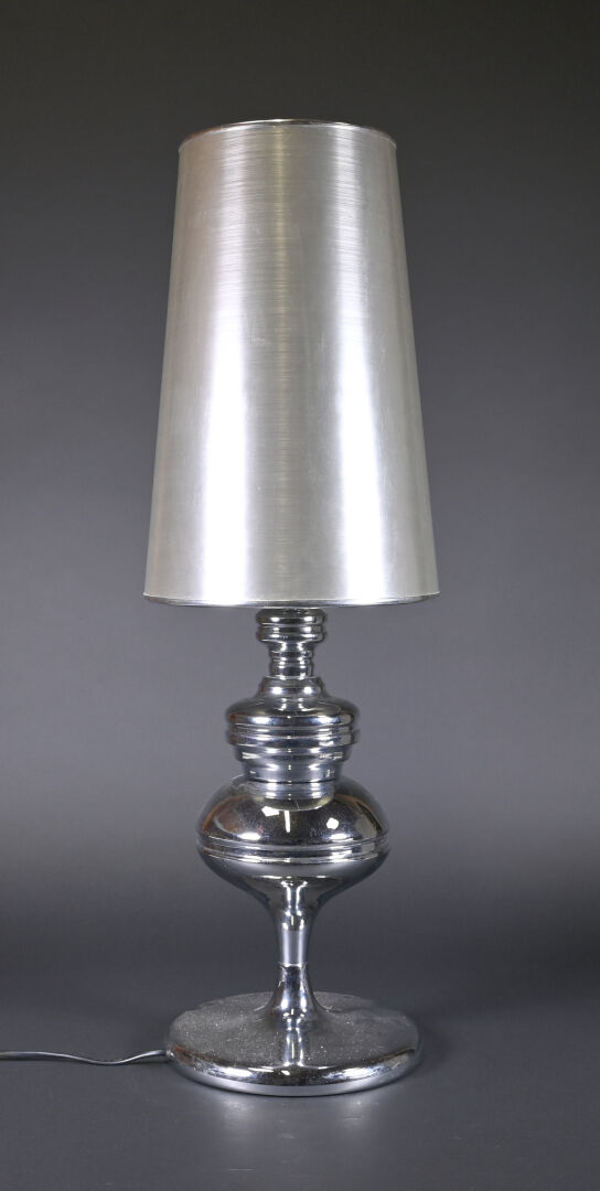 Lampe à poser en métal chromé, le fût à gradins et la base circulaire. vers 1970/80. Haut. : 76,5 cm.