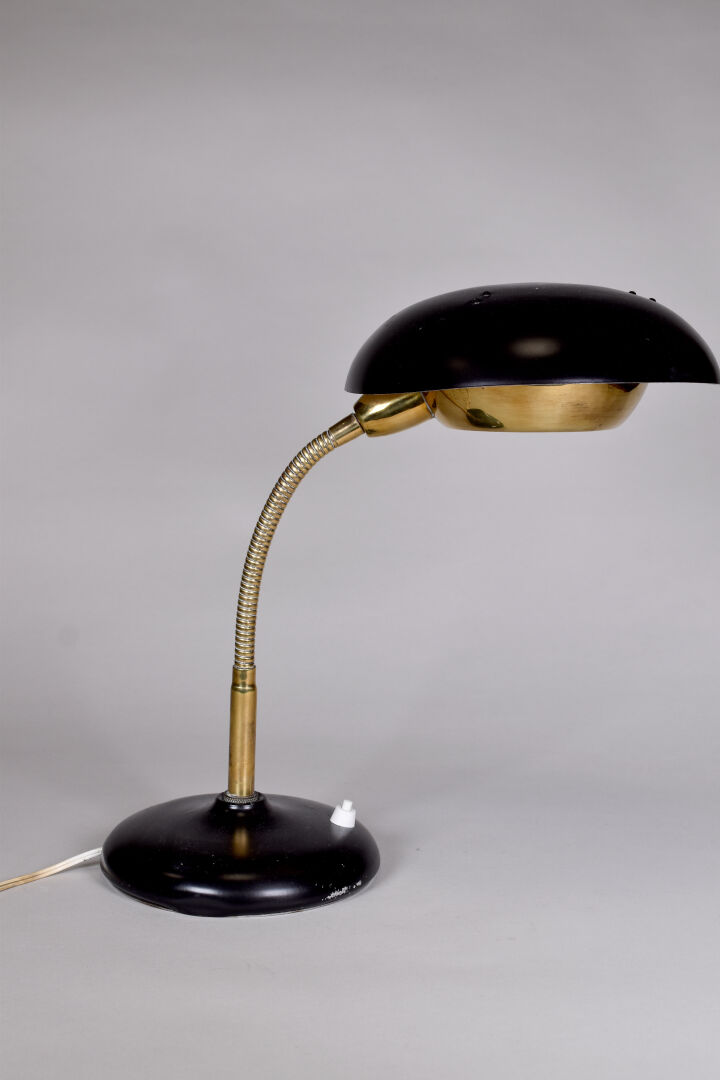 Lampe à poser en métal laqué noir et crème, le fût orientable à ressort (une légère déformation et quelques usures d’usage). Vers 1950. Haut. moyenne : 39 cm.
