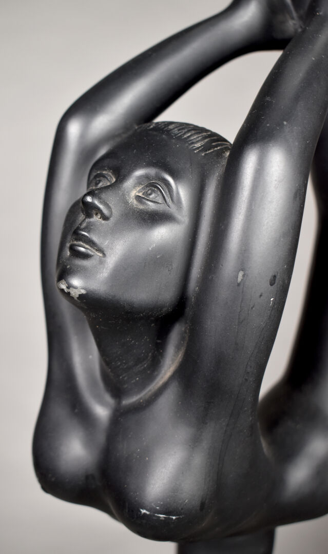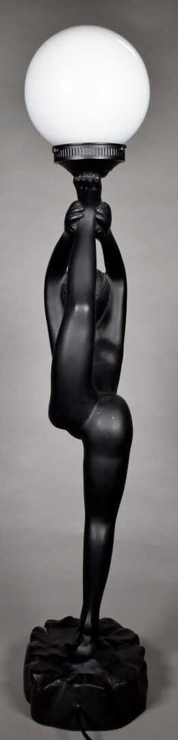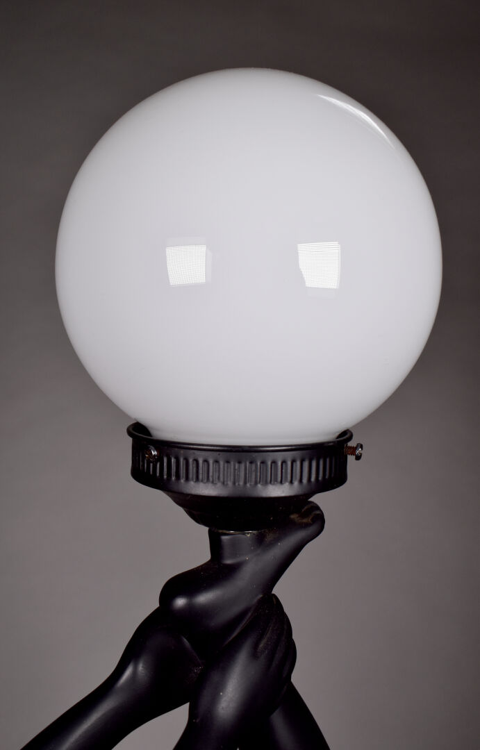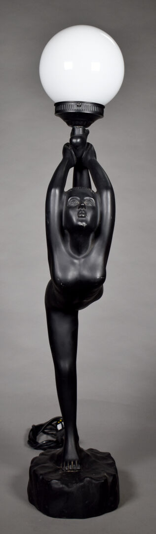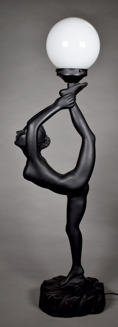 Lampe à poser en plâtre laqué noir, le fût figurant une acrobate, le diffuseur à globe d’opaline blanche (frottements). Vers 1980. Haut. : 84 cm.