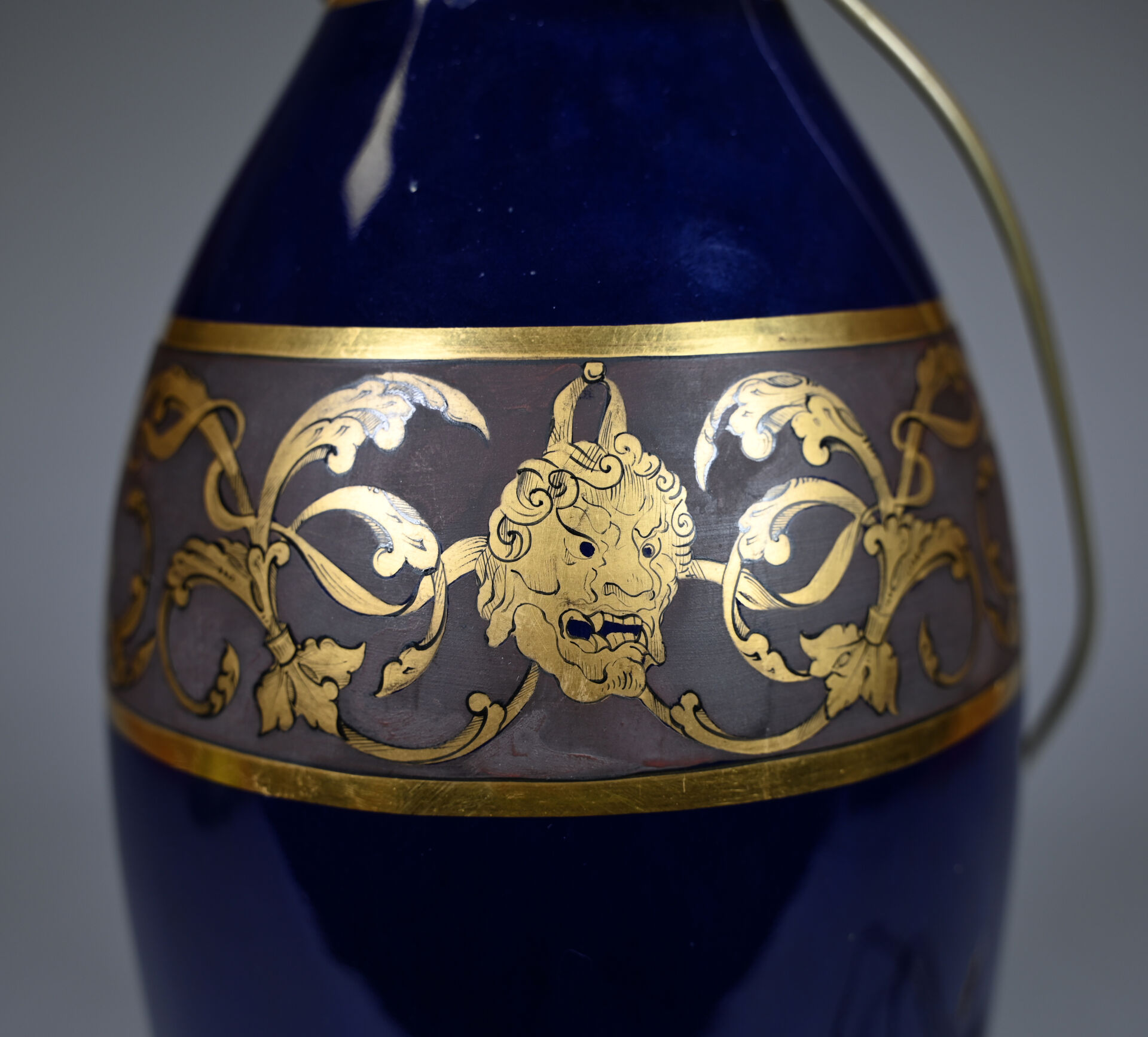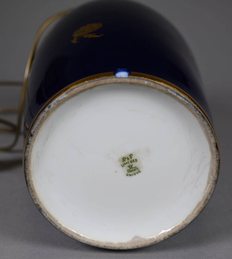 Lampe à poser en porcelaine émaillée bleu nuit à décor en dorure dans un bandeau, mascarons et chardons (un éclat à la base). Limoges. Marquée. Haut. : 40 cm (avec douille).