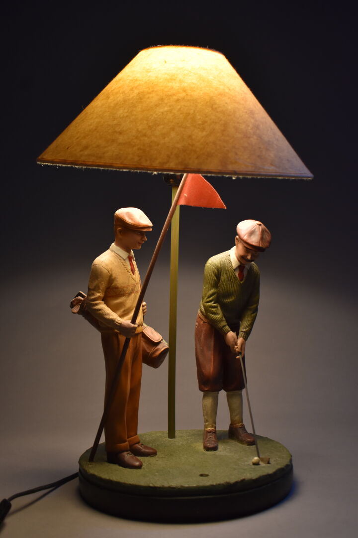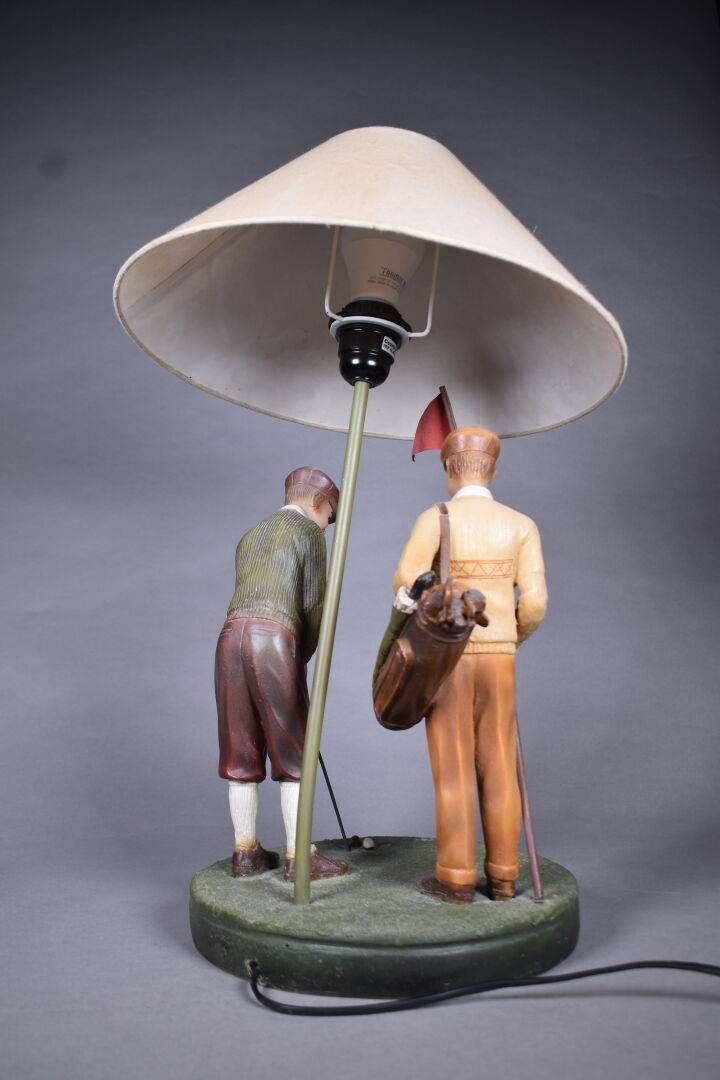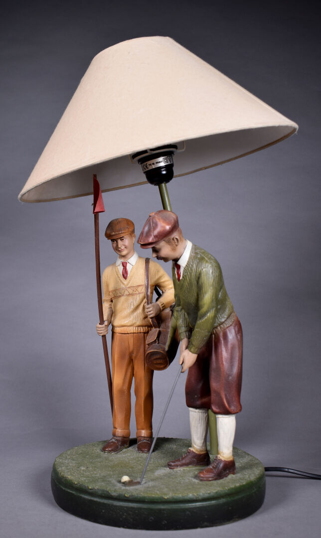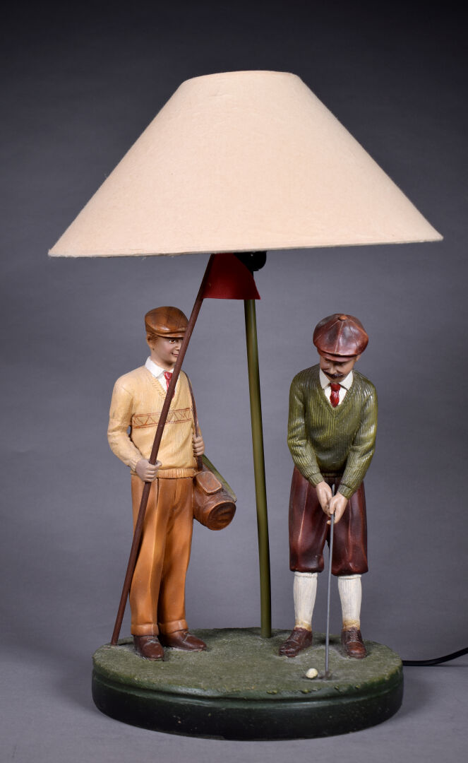 Lampe à poser en résine à décor de deux golfeurs en polychromie. Haut. : 56 cm.