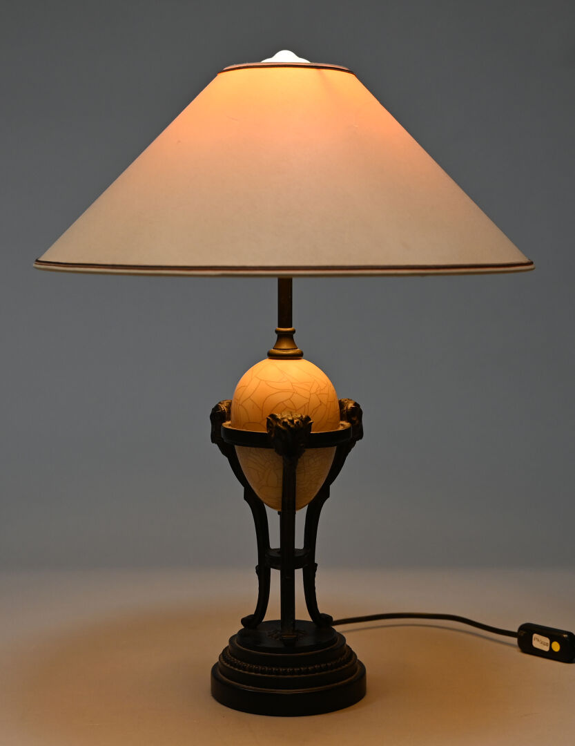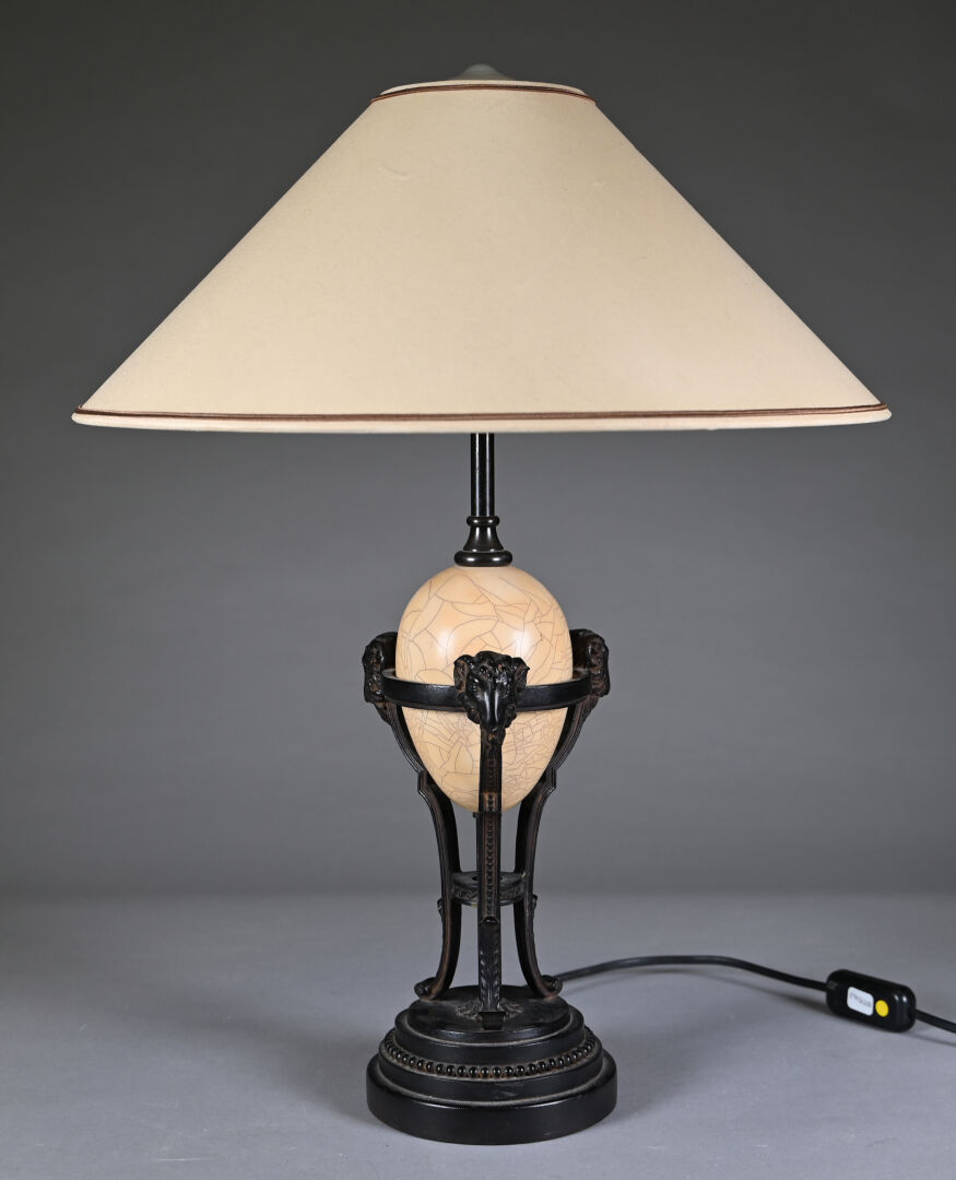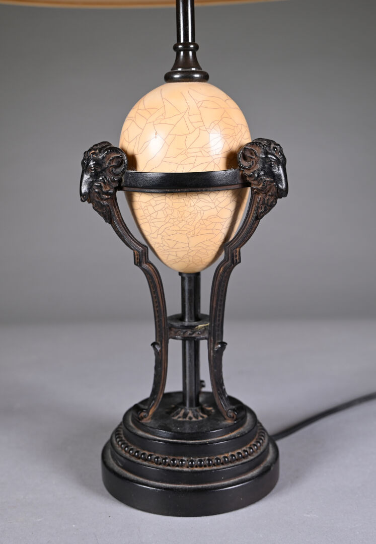 Lampe à poser en résine ? à l’imitation du métal, le fût ajouré à têtes de bélier entourant un oeuf craquelé. Vers 1970/80. Haut. : 52 cm (avec abat-jour).