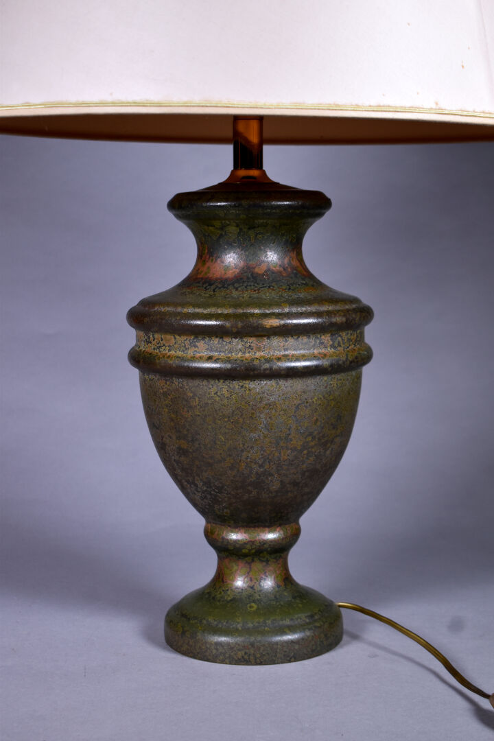 Lampe à poser en verre vert à cristallisations à l’acide. Electrifiée. Haut. : 82cm.