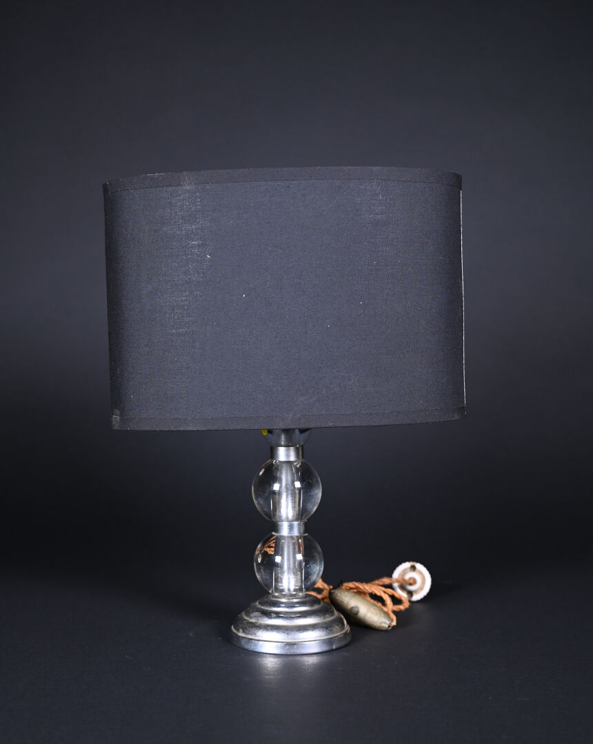 Lampe à poser, le fût à 3 sphères de plexiglas, la base à gradins en métal chromé. Vers 1930/40. On joint un abat-jour moderne en toile noire. Haut. : 33,5 cm.