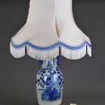 Lampe à poser, le fût balustre en porcelaine à décor en bleu sous couverte d’un oiseau sur des rochers entouré de pivoines et branches de cerisier en fleurs (accidents et restauration). L’abat-jour en forme de pagode (décousu). Socle en bois. Chine, première moitié du XXe siècle. Haut. totale : 93 cm.