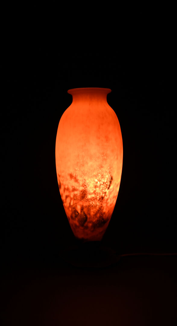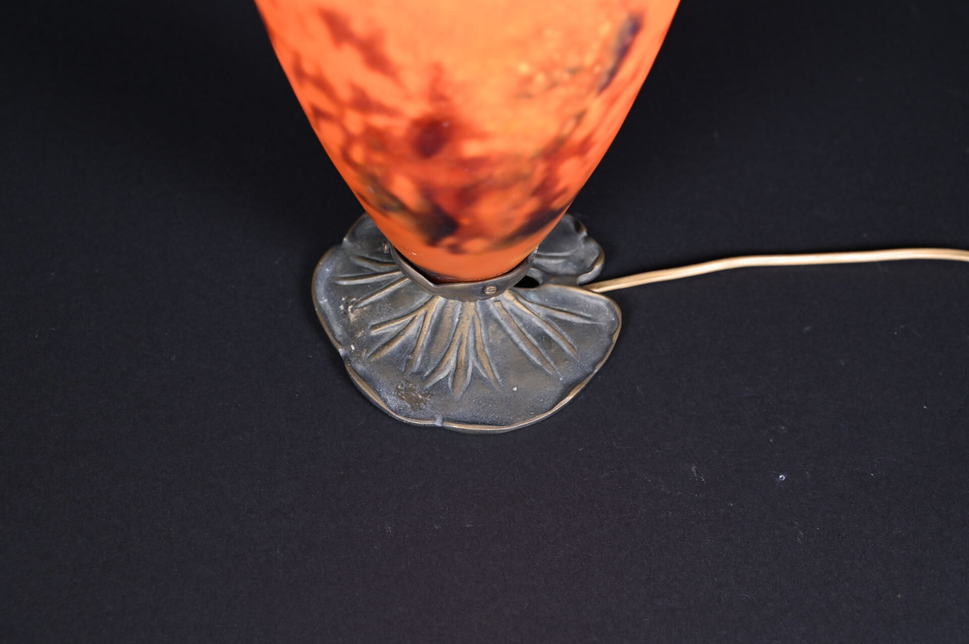 Lampe à poser, le fût en fuseau en verre marmoréen orange et bleu. Le pied en bronze simulant une feuille de nénuphar. A refixer. Vers 1980. Haut. : 39,5 cm.