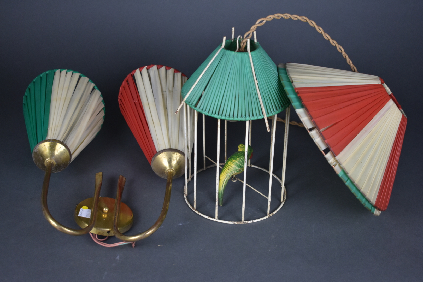 Lampe à poser, le fût en porcelaine moulé façon tissu en polychromie d’oiseaux et croisillons. Haut. : 75 cm. On joint une suspension simulant un oiseau en cage, deux abas-jours et une applique à deux bras de lumière. Milieu du XXe siècle.