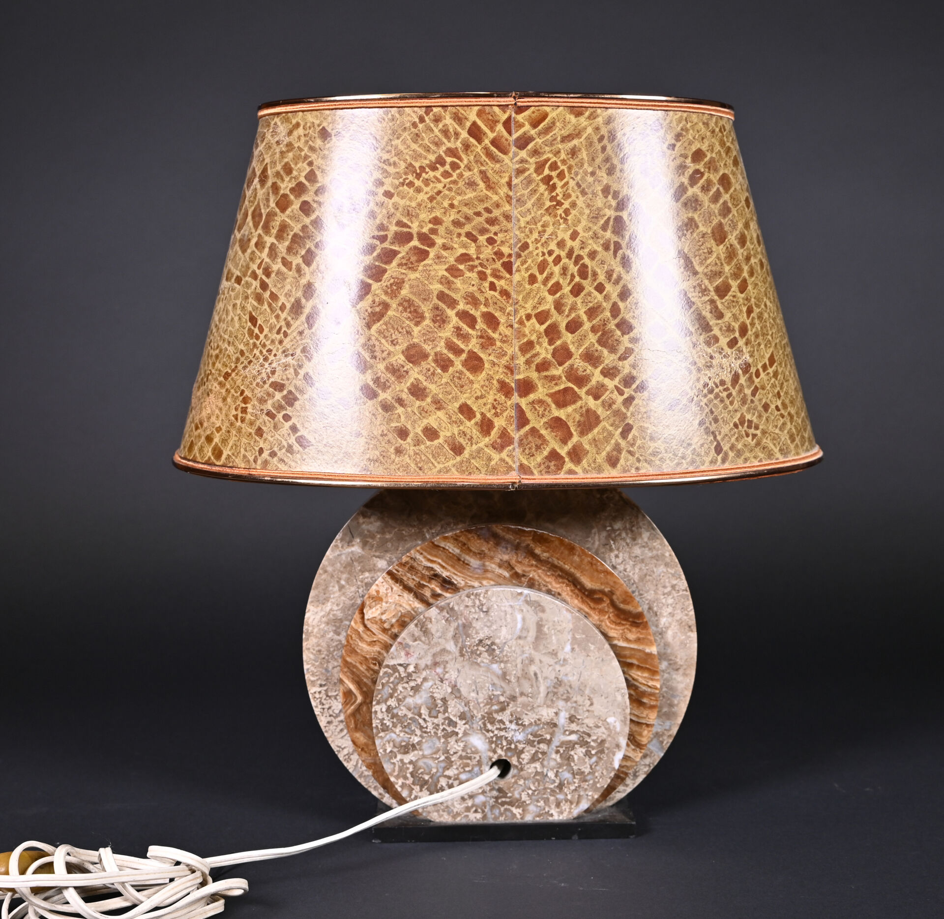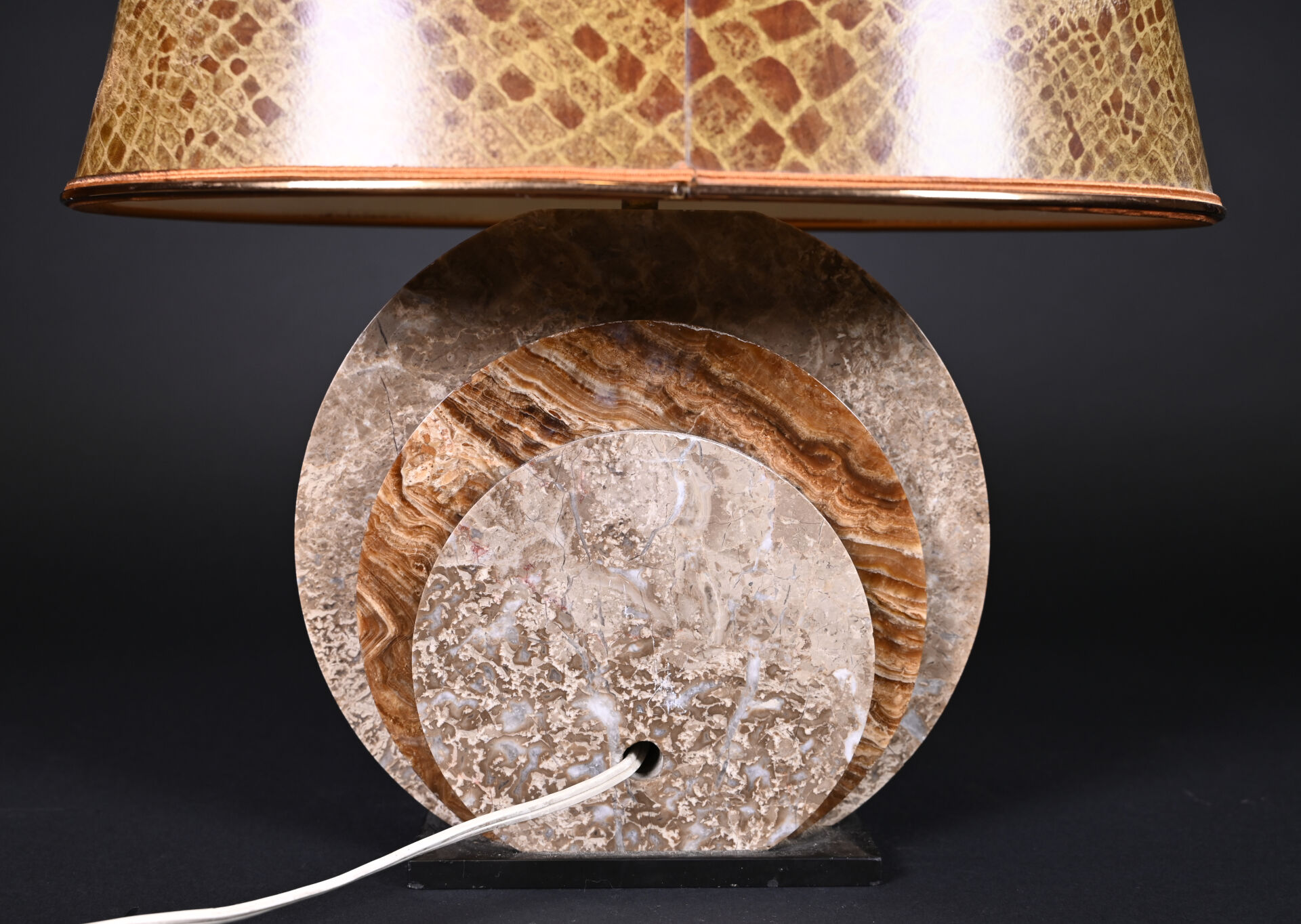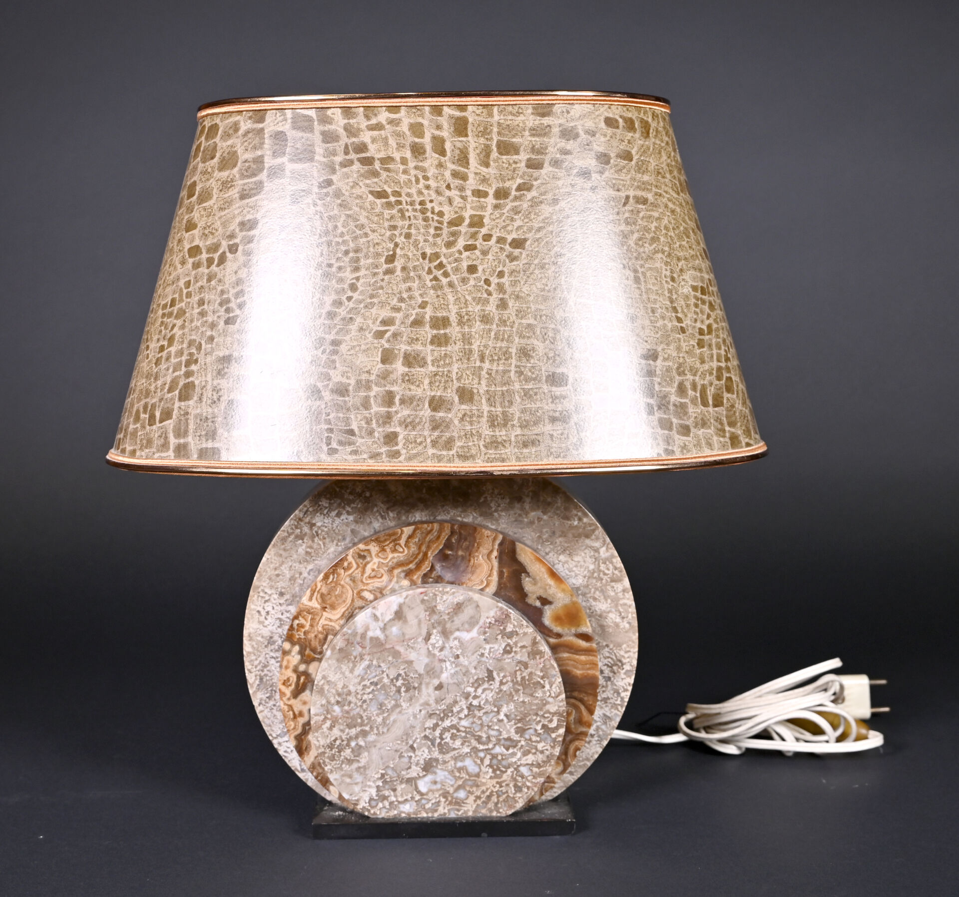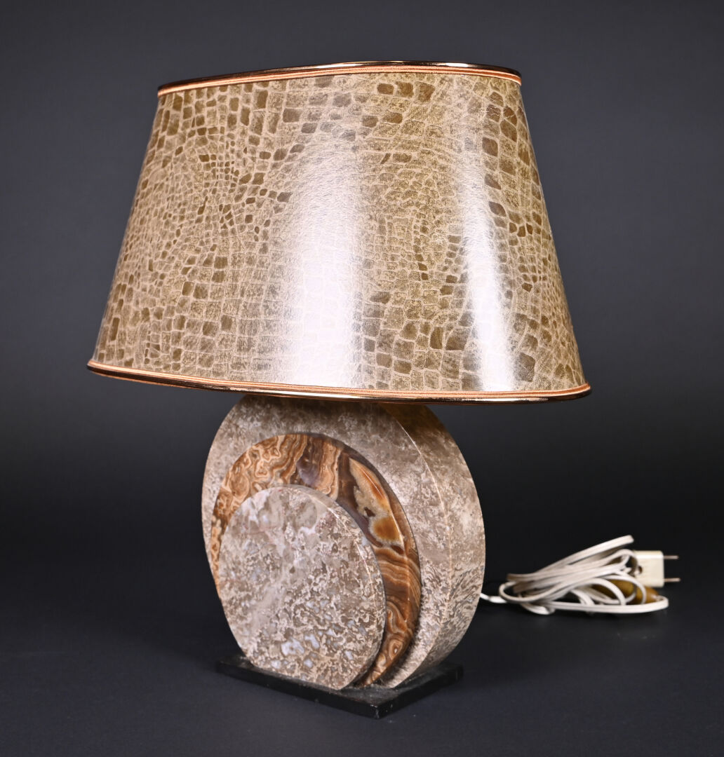 Lampe à poser, le fût formé de trois disques d’onyx et pierre dure ocre et chocolat. vers 1930. Haut. : 39 cm.
