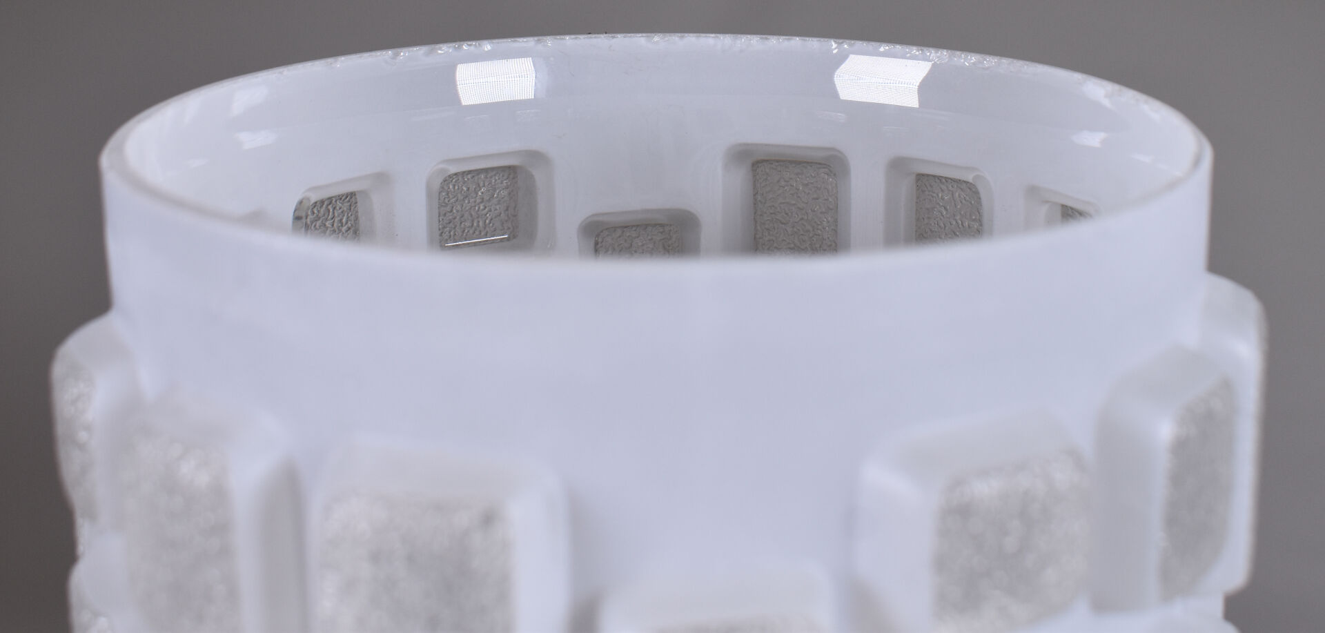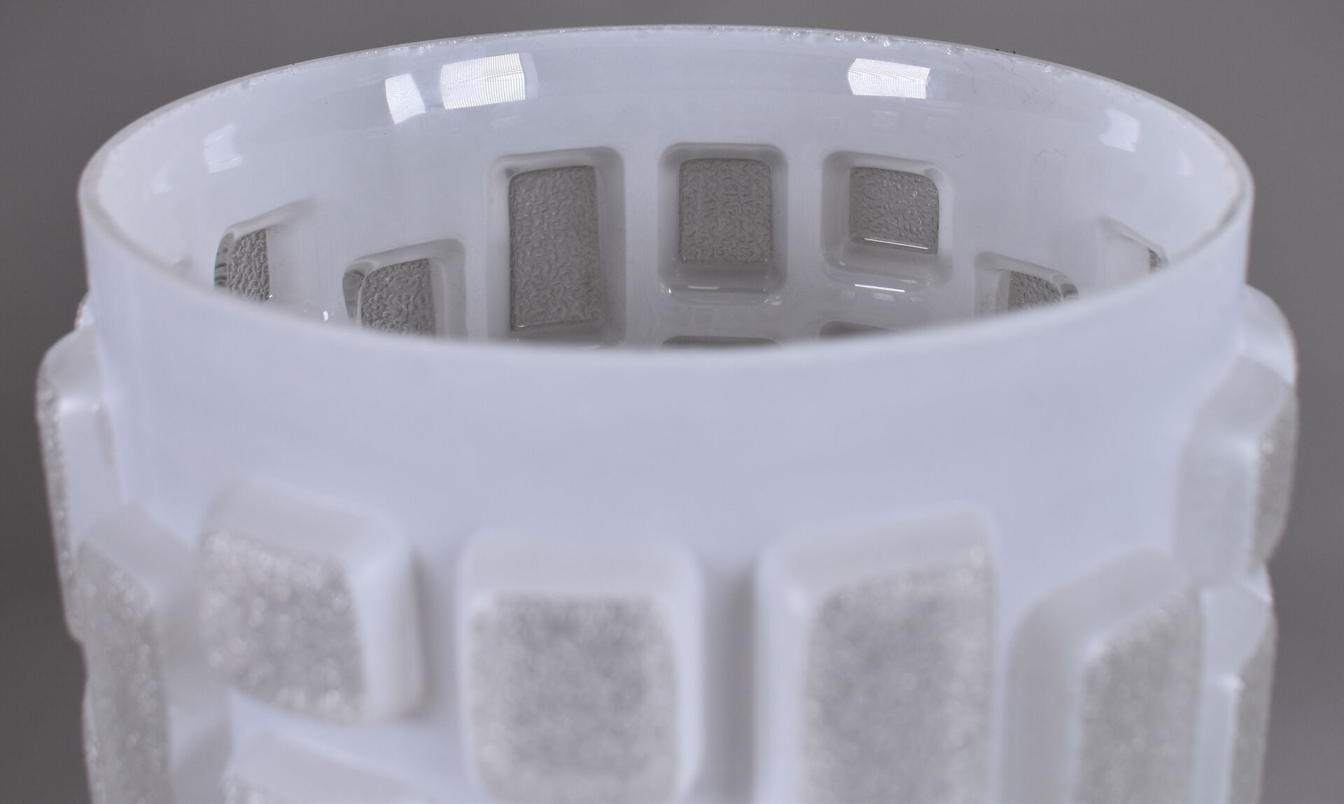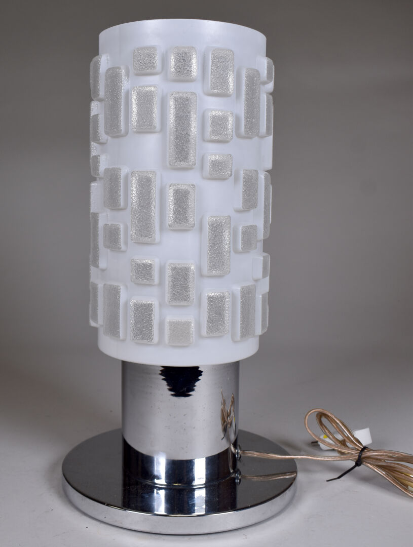 Lampe à poser tubulaire à diffuseur en verre blanc partiellement dépoli de figures géométriques en relief. la base ciruclaire en métal chromé. Dans le goût des années 1970. Haut. : 39 cm.