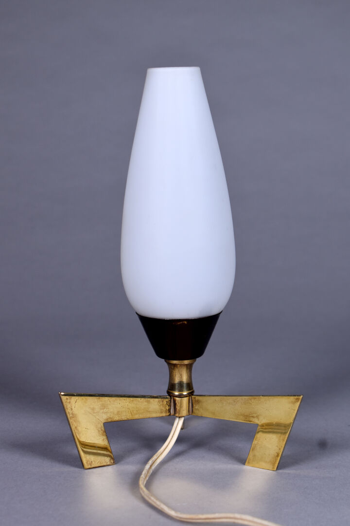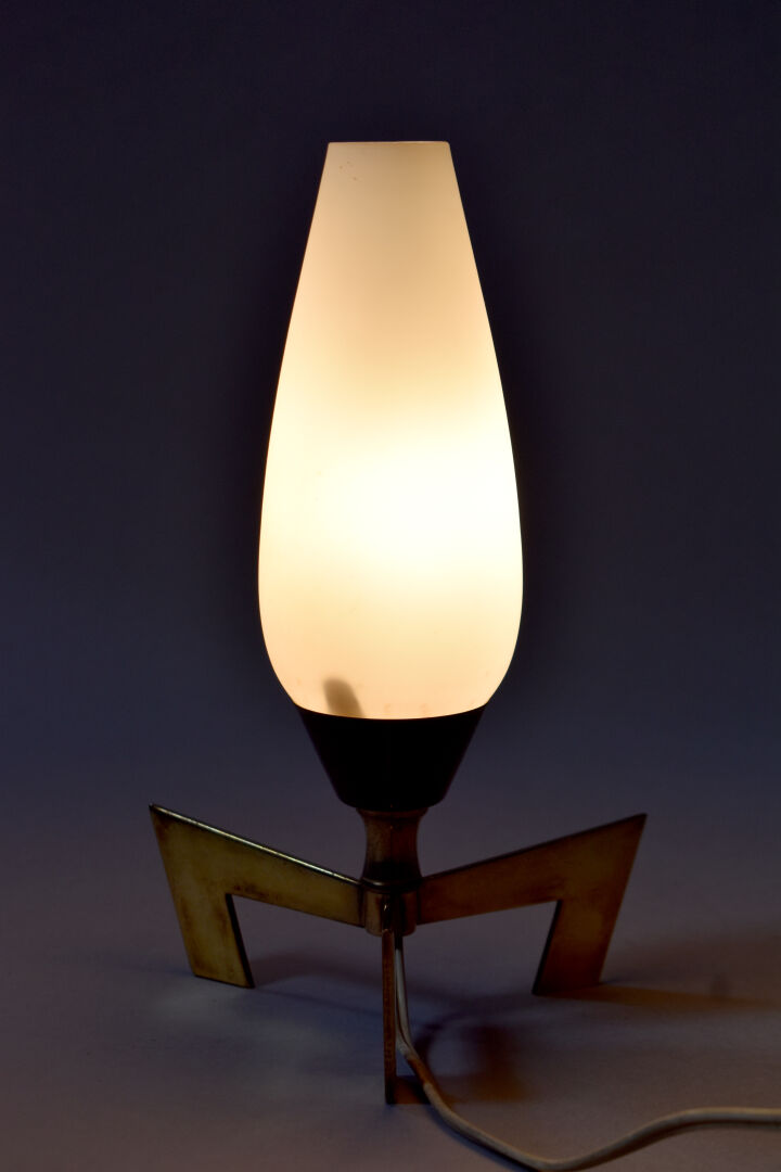 Lampe à poser type « rocket » en laiton et opaline blanche. Vers 1960. Haut. : 24 cm.