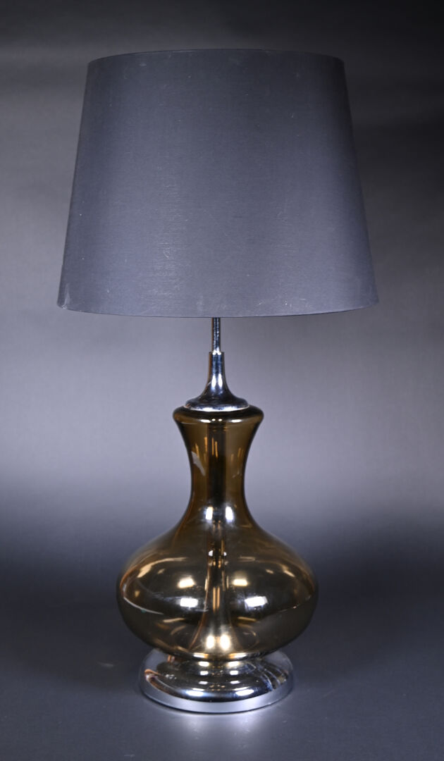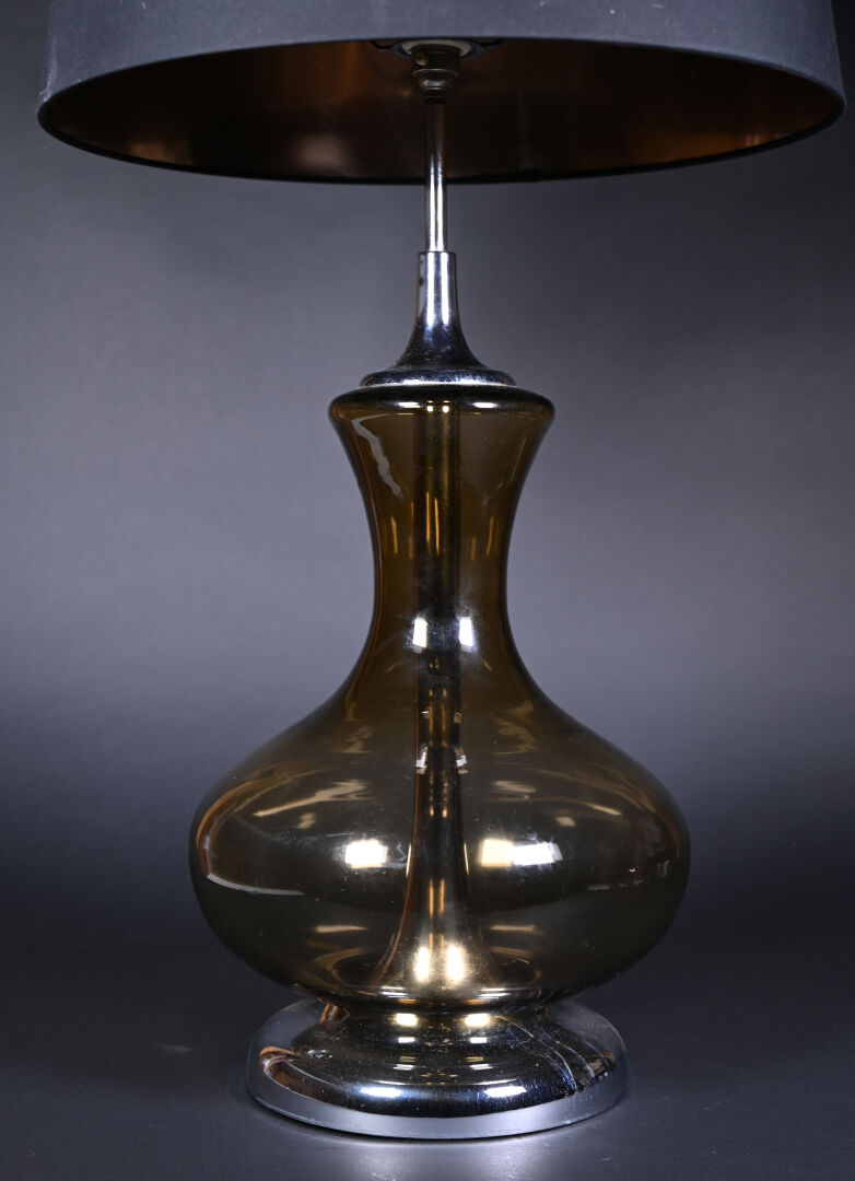 Lampe bulbe en verre fumé, la base chromée. Vers 1970. Haut. : 68 cm. Abat-jour en tissu noir postérieur.