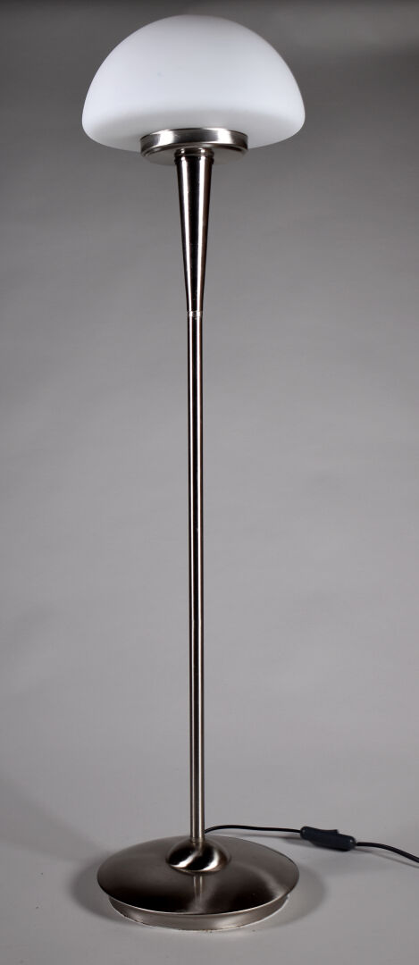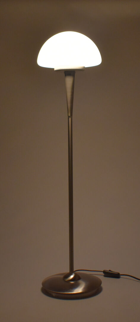Lampe champignon en métal brossé à opaline blanche. Travail probablement italien, vers 1970. Haut. : 92 cm.