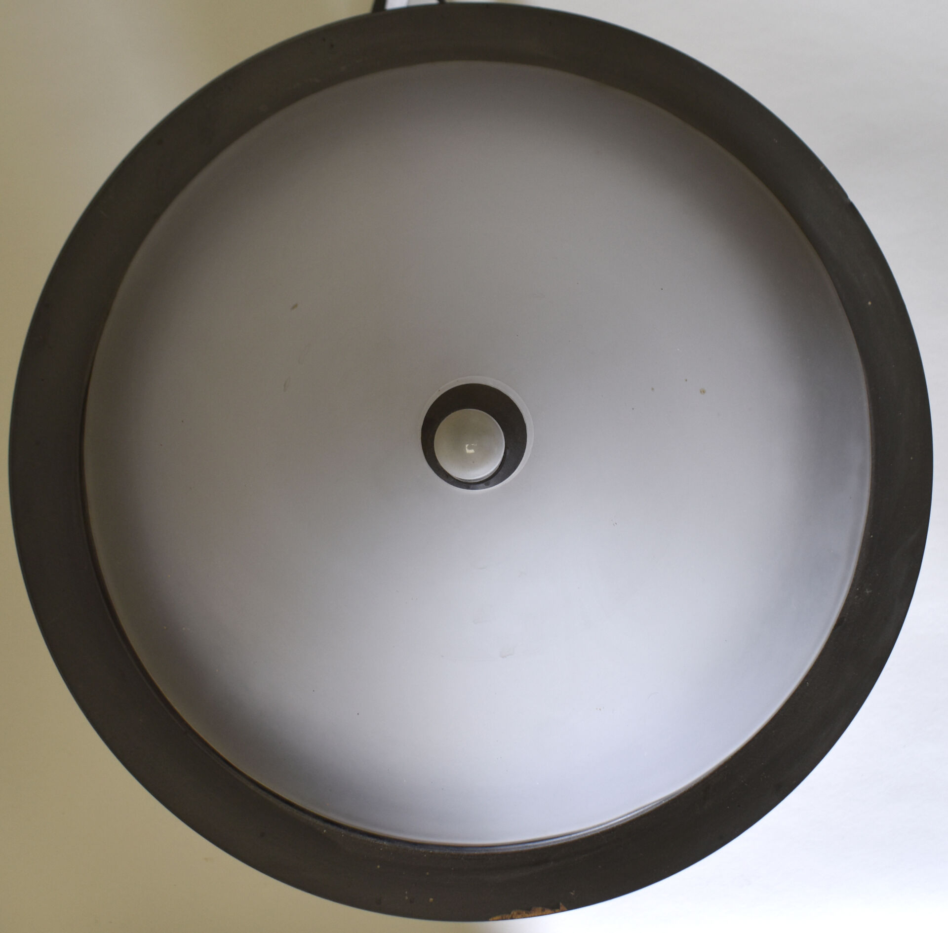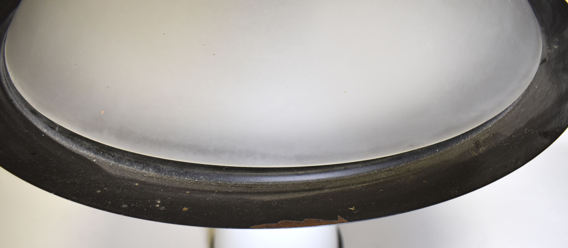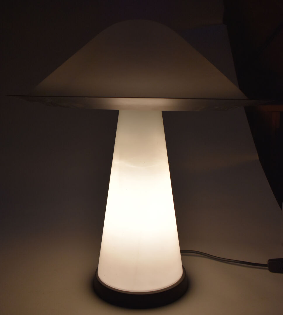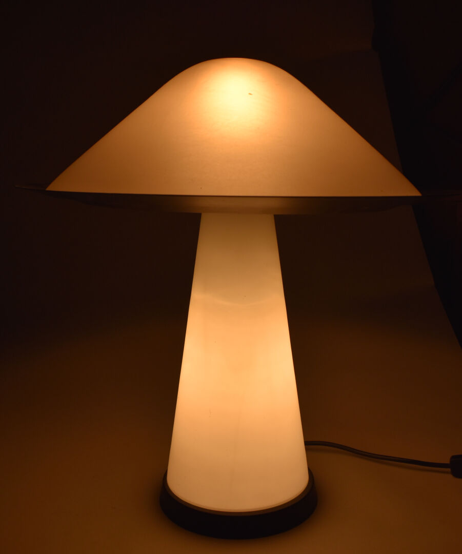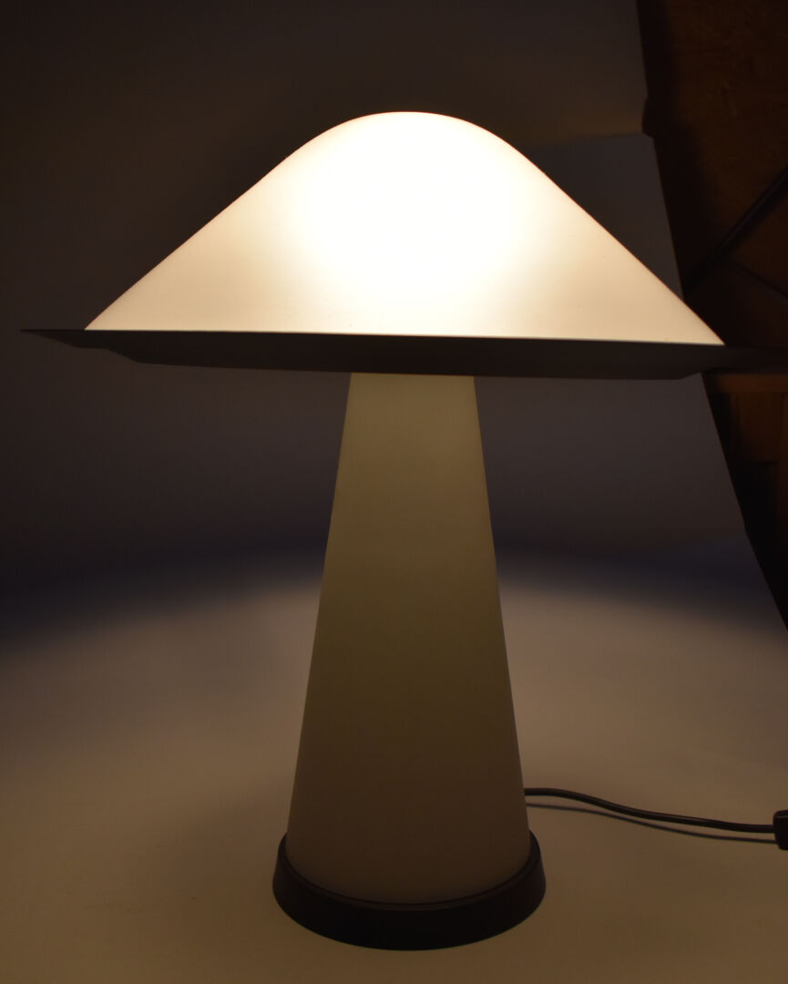 Lampe champignon en verre blanc et dépoli et métal laqué noir (usures, éclats). Vers 1980. Haut. : 46 cm.