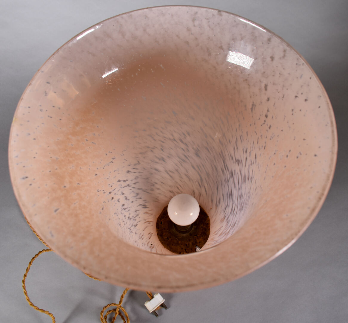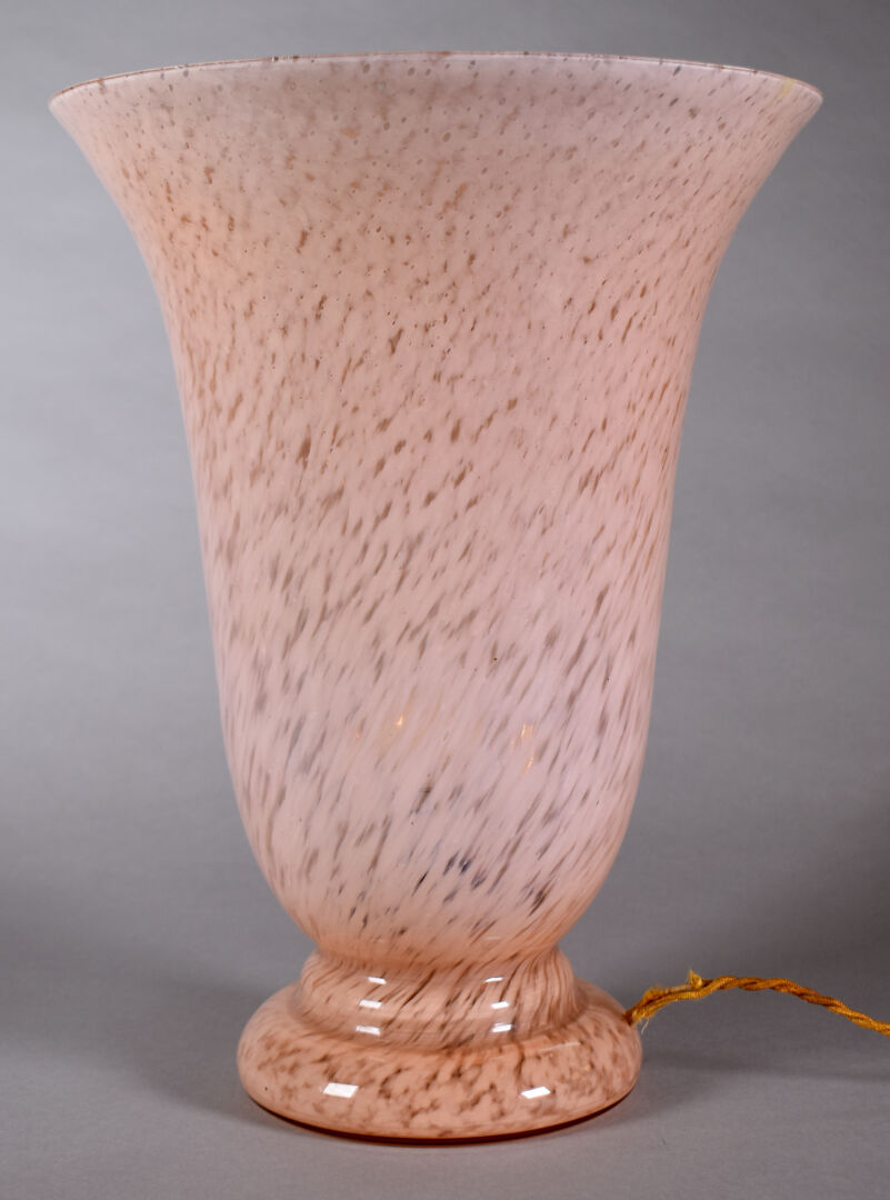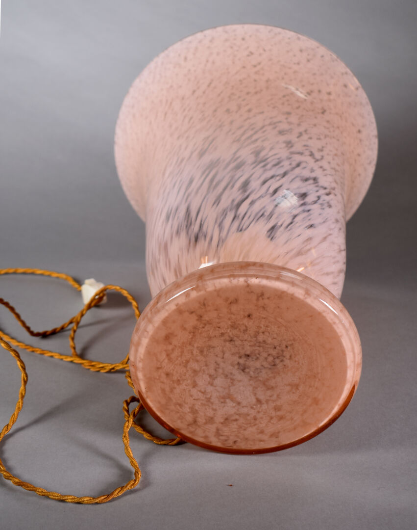 Lampe cornet en verre marmoréen rose (égrenures au col). Années 30/40. Haut. : 37 cm.