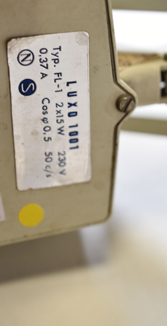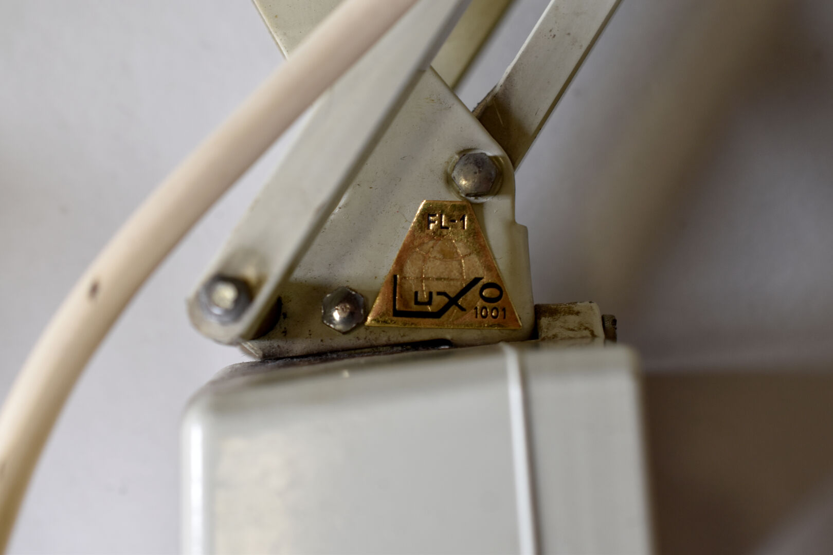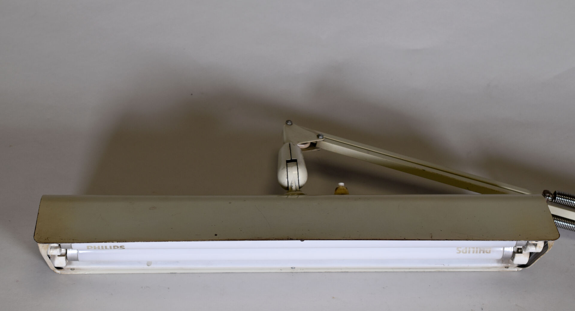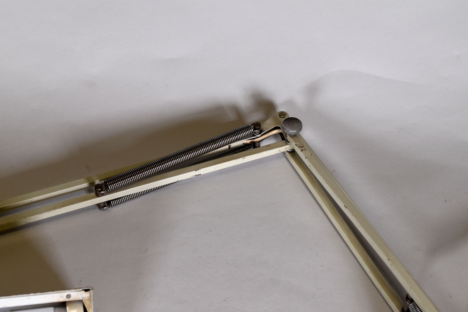 Lampe d’atelier en métal laqué crème modèle « Luxo 1001 ». Long. déployée. : 121 cm.