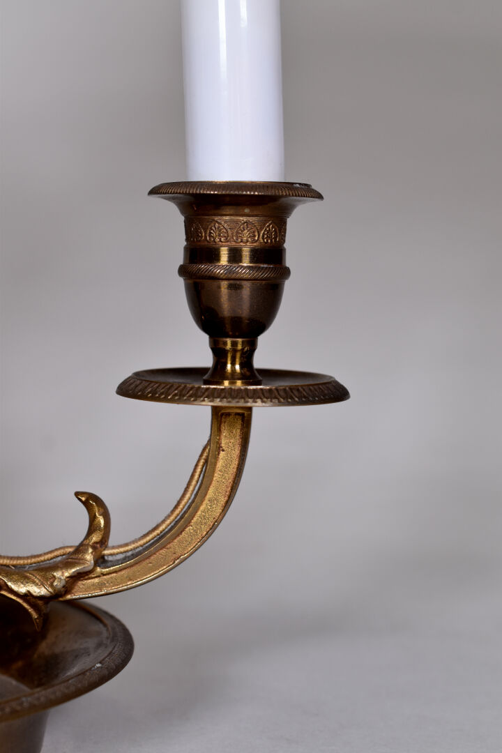 Lampe de bouillotte en bronze, à deux bras de lumière, l’abat-jour laqué vert. Style Empire. Haut. : 55 cm.
