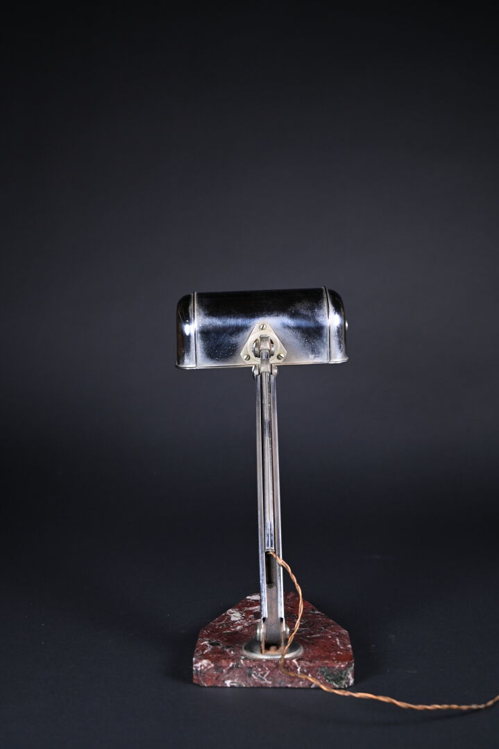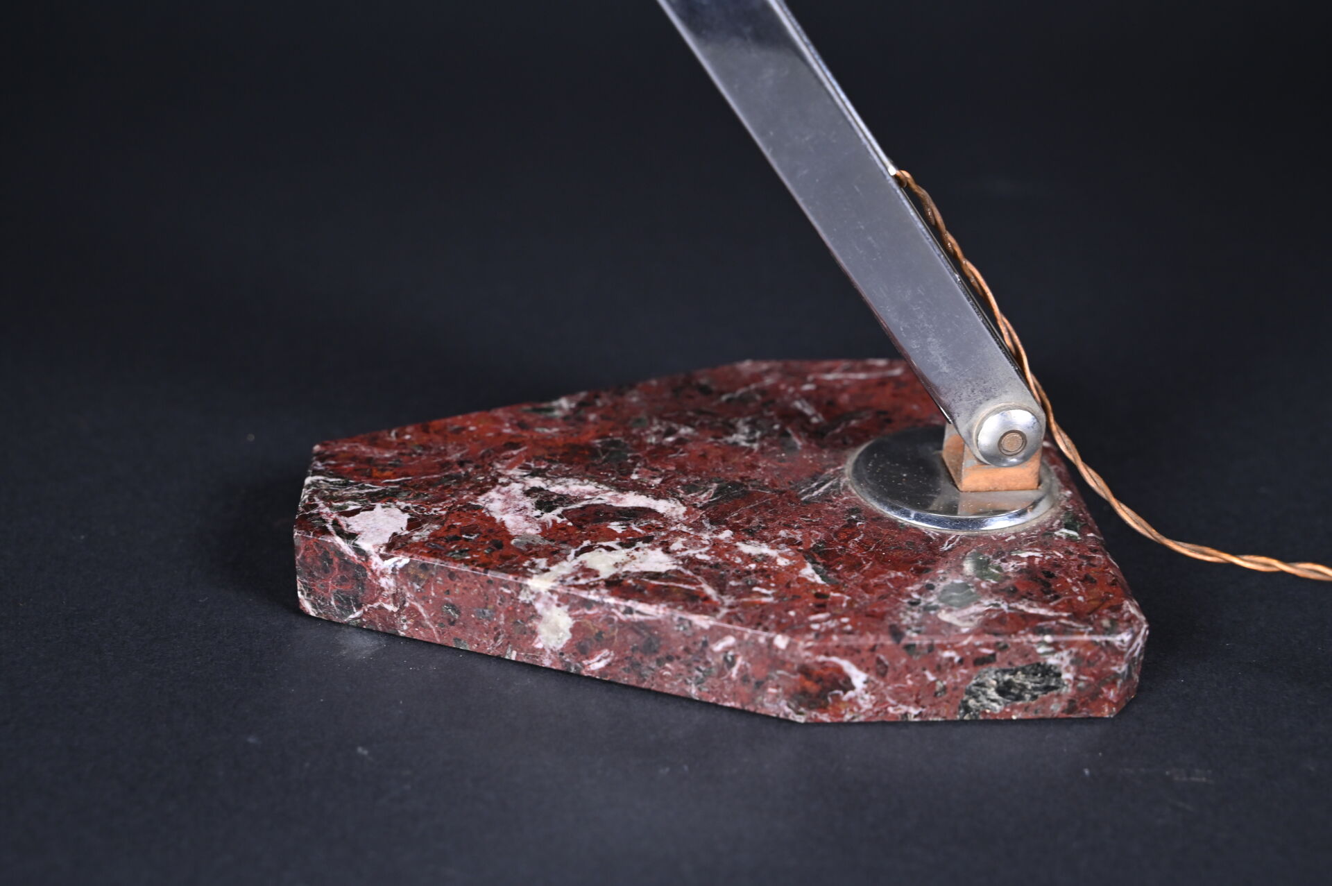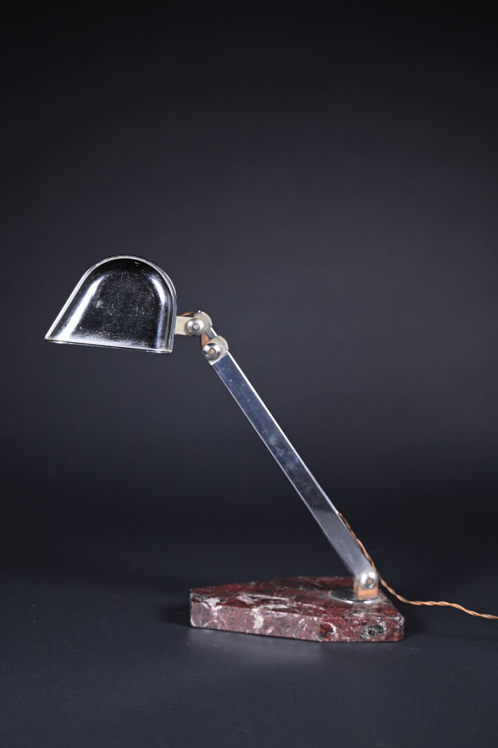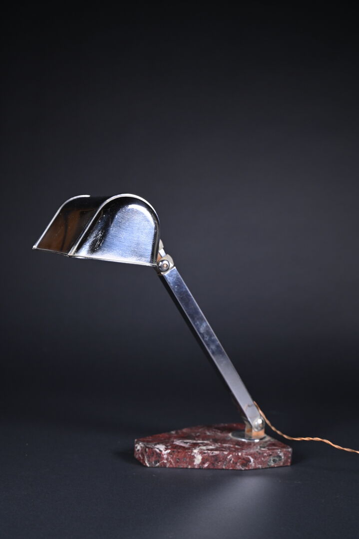 Lampe de bureau en métal chromé, le fût télescopique orientable, le socle en marbre violet. Epoque Art Déco. Haut. : 38,5 cm.