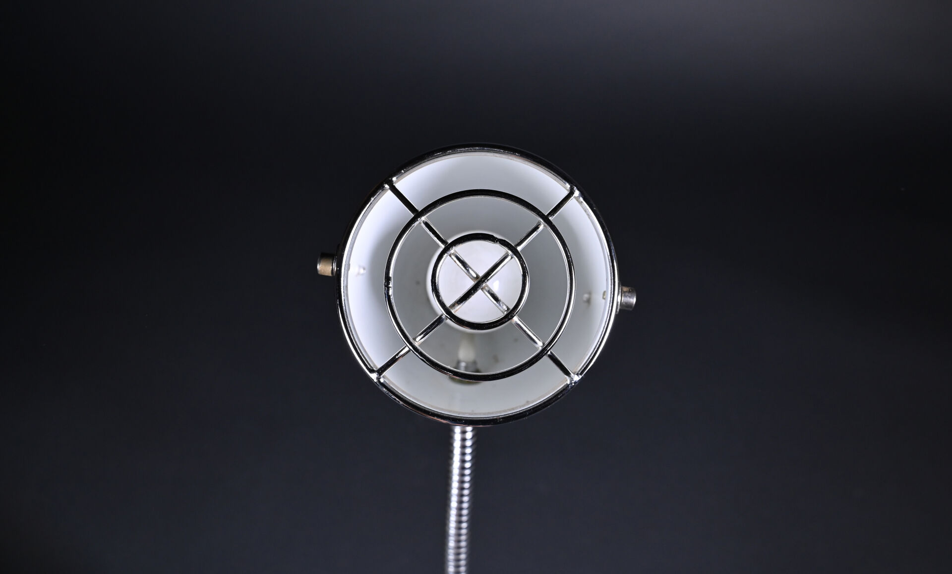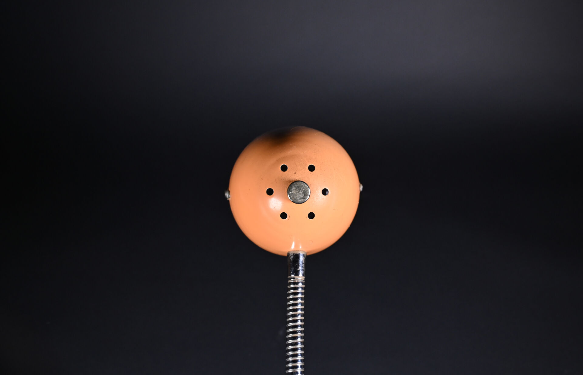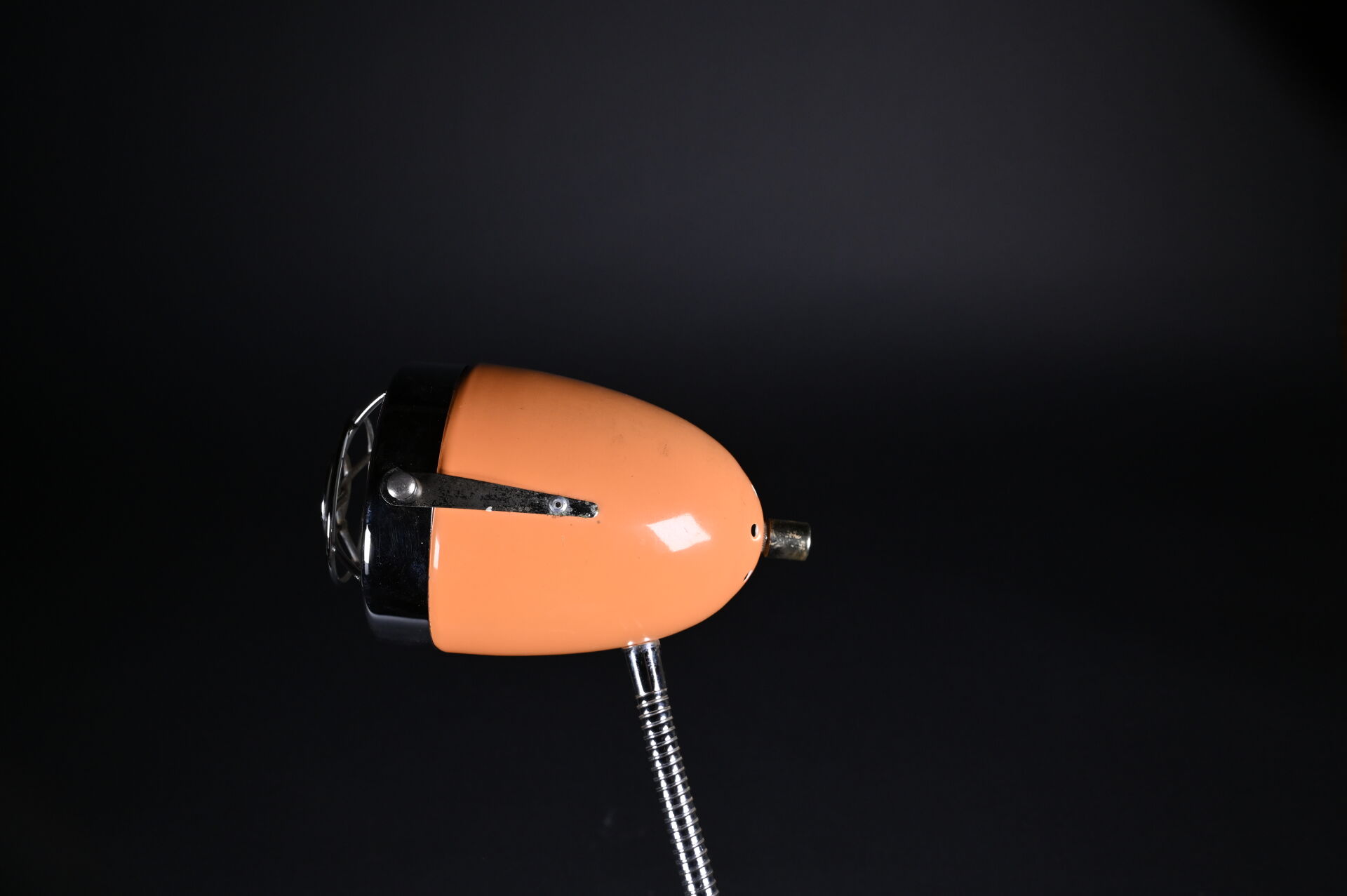 Lampe de bureau ou d’atelier à pince, le fût ressort en métal chromé et laqué orange. Haut. : 45 cm.