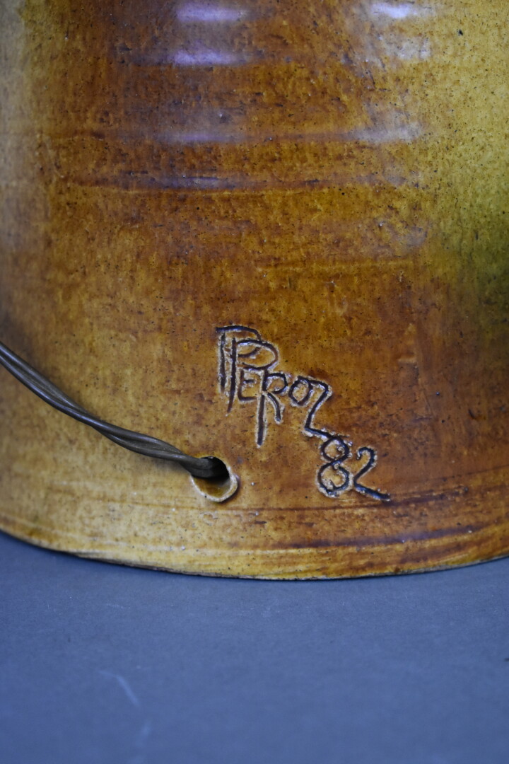 Lampe en céramique émaillée ocre et vert à décor ajouré d’une fleur. Signée à la pointe « Peroz « ? et datée (19)82. Haut. : 66 cm.